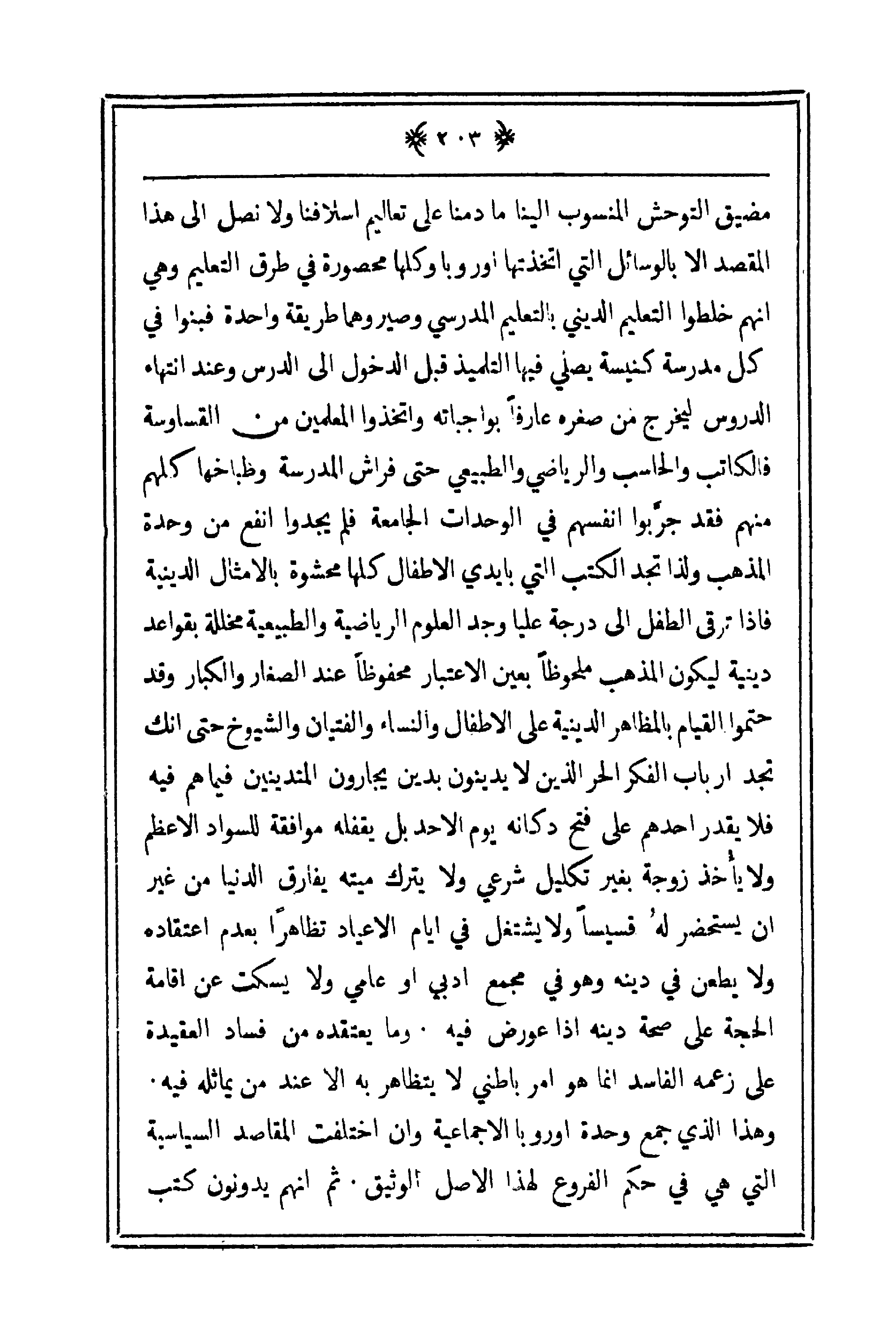 مضيق التوحش المنسوب إلينا ما دمنا على تعاليم أسلافنا ولا نصل إلى هذا المقصد إلا بالوسائل التي اتخذتها أوروبا وكلها محصورة في طبرق التعليم وهي أنهم خلطوا التعليم الديني بالتعليم المدرسي وصيروهما طريقة واحدة فبنوا في كل مدرسة كنيسة يصلي فيها التلميذ قبل الدخول إلى الدرس وعند انتهاء الدروس ليخرج من صغره عارفاً بواجباته واتخذوا المعلمين من القساوسة فالكاتب والحاسب والرياضي والطبيعي حتى فراش المدرسة وطباخها كلهم منهم فقد جربوا أنفسهم في الوحدات الجامعة فلم يجدوا أنفع من وحدة المذهب ولذا تحد الكتب التي بأيدي الأطفال كلها محشوة بالأمثال الدينية فإذا ترقى الطفل إلى درجة عليا وجد العلوم الرياضية والطبيعية مخللة بقواعد دينية ليكون المذهب ملحوظاً بعين الاعتبار محفوظاً عند الصغار والكبار وقد حتموا القيام بالمظاهر الدينية على الأطفال والنساء والفتيان والشيوخ حتى أنك تجد أرباب الفكر الحر الذين لا يدينون بدين يجارون المتدينين فيما هم فيه فلا يقدر أحدهم على فتح دكانه يوم الأحد بل يقفله موافقة للسواد الأعظم ولا يأخذ زوجة بغير تكليل شرعي ولا يترك ميته يفارق الدنيا من غير أن يستحضر له قسيساً ولا سيشتغل في أيام الأعياد تظاهراً بعدم اعتقاده ولا يطعن في دينه وهو في مجمع أدبي أو عامي ولا يسكت عن إقامة الحجة على صحة دينه إذا عورض