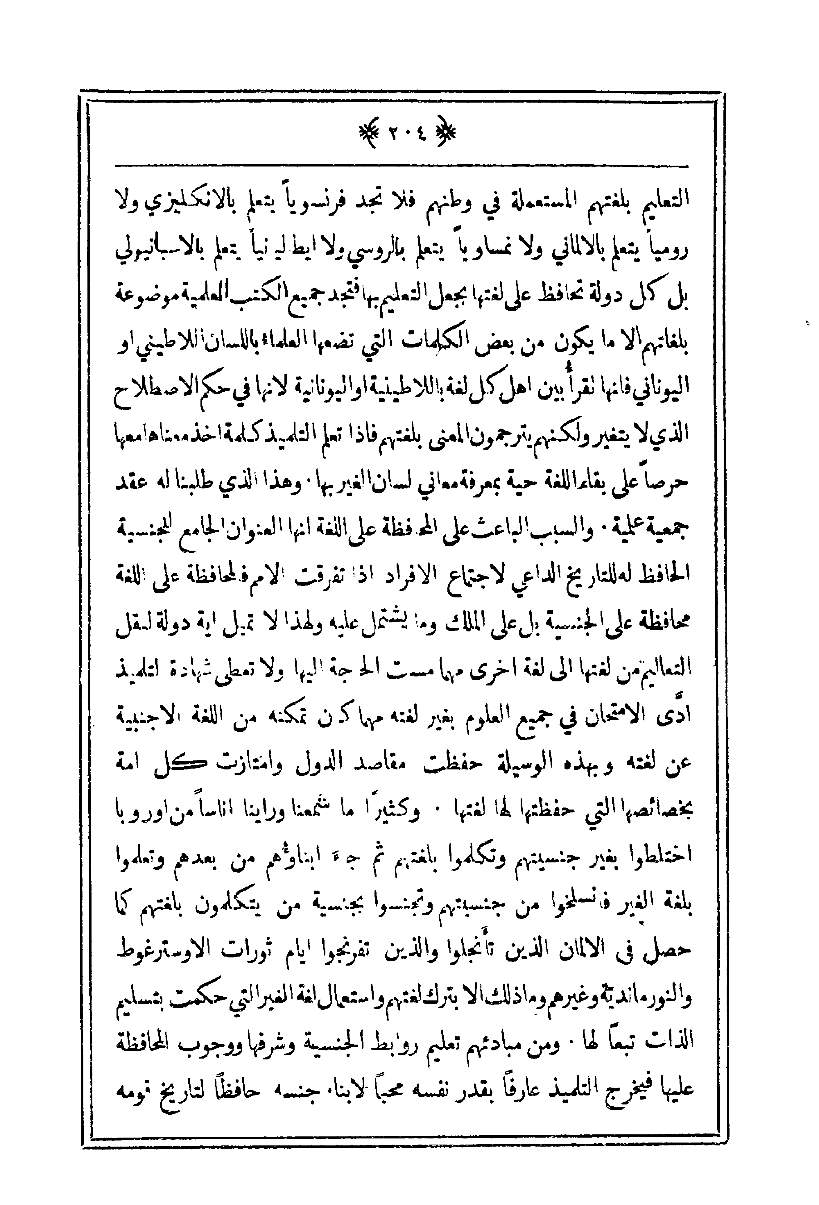 التعليم بلفتهم المستعملة في وطنهم فلا تجد فرنسوياً يتعلم بالإنكليزي ولا رومياً يتعلم بالألماني ولا نمساوياً يتعلم بالروسي ولا إيطاليناً يتعلم بالأسبانيولي بل كل دولة تحافظ على لغتها بجعل التعليم بها فتجد جميع الكتب العلمية موضوعة بلغاتهم إلا ما يكون من بعض الكلمات التي تضعها العلماء باللسان اللاطيني أو اليوناناي فإنها تقرأ بين أهل كل لغة باللاطينية أو اليونانية لأنها في حكم الاصطلاح الذي لا يتغير ولكنهم يترجمون المعنى بلغتهم فإذ تعلم التلميذ كلمة أخذ معايناها معها حرصاً على بقا اللغة حية بمعرفة معاني لسان الغير بها. وهذا الذي طالبنا له عقد جمعية علمية والسبب الباعث على المحافظة على اللغة أنها العنوان الجامع للجنسية الحافظ له للتاريخ الداعي لاجتماع الأفراد إذا تفرقت الأمم فالمحافظة على اللغة محافظة على الجنسية بل على الملك وما يشتمل عليه ولهذا لا تميل أية دولة لنقل التعاليم من لغتها إلى لغة أخرى مهما مست الحاجة إليها ولا تعطي شهادة لتلميذ أدى لامتحان في جميع العلوم بغير لغته مهما كان تمكنه من اللغة الأجنبية عن لغته وبهذه الوسيلة حفظت مقاعد الدول وامتازت كل أمة بخصائصها التي حفظتها لها لغتها. وكثيراً ما سمعنا ورأينا أناساً من أوروبا اختلطوا بغير جنسيتهم وتكلموا بلغتهم ثم جاء أبناؤهم من بعدهم وتعلموا بغلة الغير فانسخلوا من جنسيتهم وتجنسوا بجنسية من يتكلمون بلغتهم كما حصل في الألمان الذين تأنجلوا والذين تفرنجوا أيام ثورات الأوسترغوط والنورماندية وغيرهم وما ذلك إلا بترك لغتهم واستعمال لغة الغير التي حكمت بتسليم الذات تبعاً لها ومن مبادئهم تعليم روابط الجنسية وشرفها ووجوب المحافظة عليها فيخرج التلميذ عارفاً بقدر نفسه محباً لأبناء جنسه حافظاً لتاريخ قومه