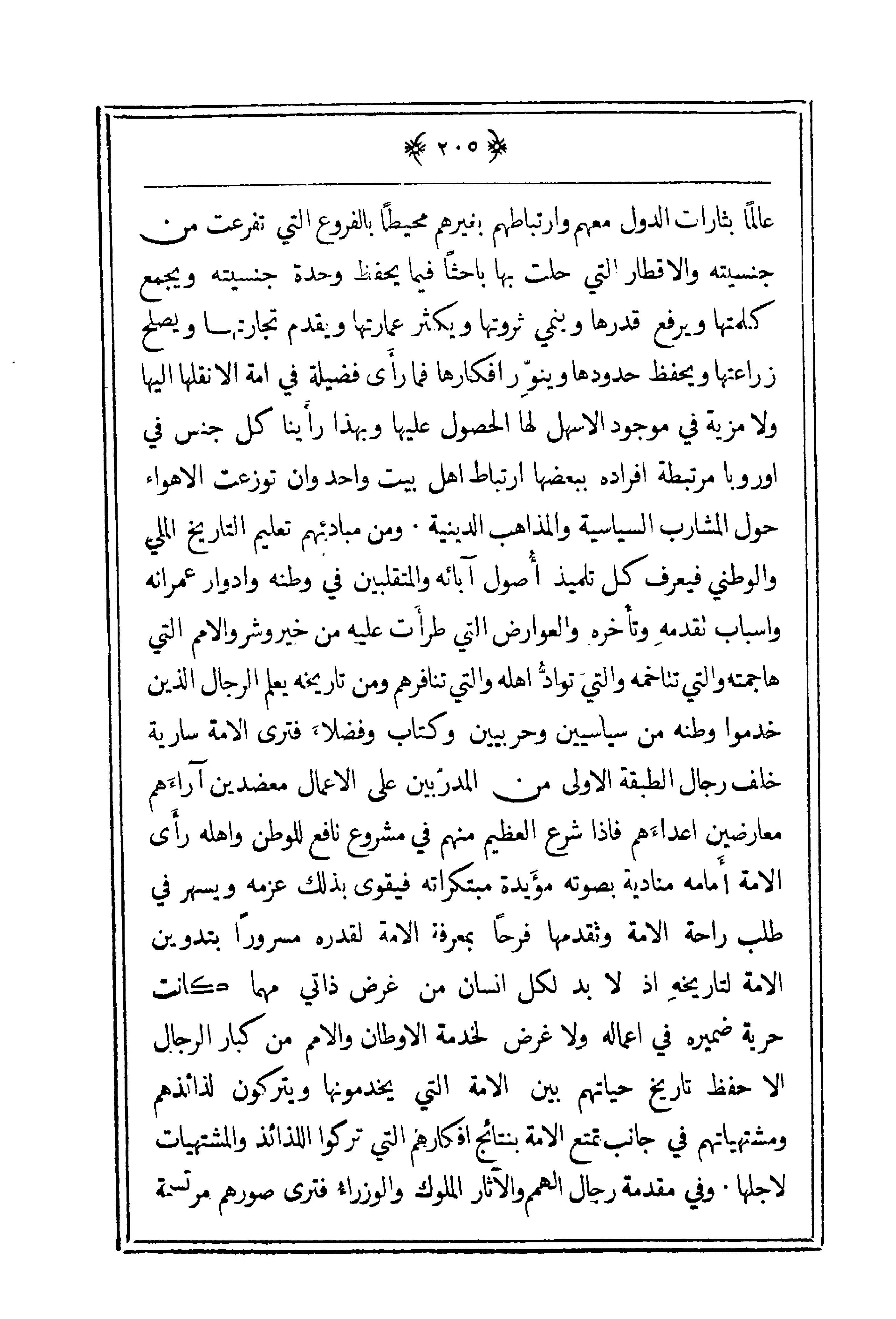 عالماً بثارات الدول معهم وارتباطهم بغيرهم محيطاً بالفروع التي تفرعت من جنسيته والأقطار التي حلت بها باحثاً فيما يحفظ وحدة جنسيته ويجمع كلمتها ويرفع قدرها وينمي ثروتها وكثير عمارتها ويقدم تجارتها ويصلح زراعتها ويحفظ حدوها وينور أفكارها فما رأى فضيلة في أمة إلا نقلتها إليها ولا مزية في موجود الأهل لها الحصول عليها وبهذا رأينا كل جنسي في أوروبا مرتبطة أفراها ببعضها ارتباط
