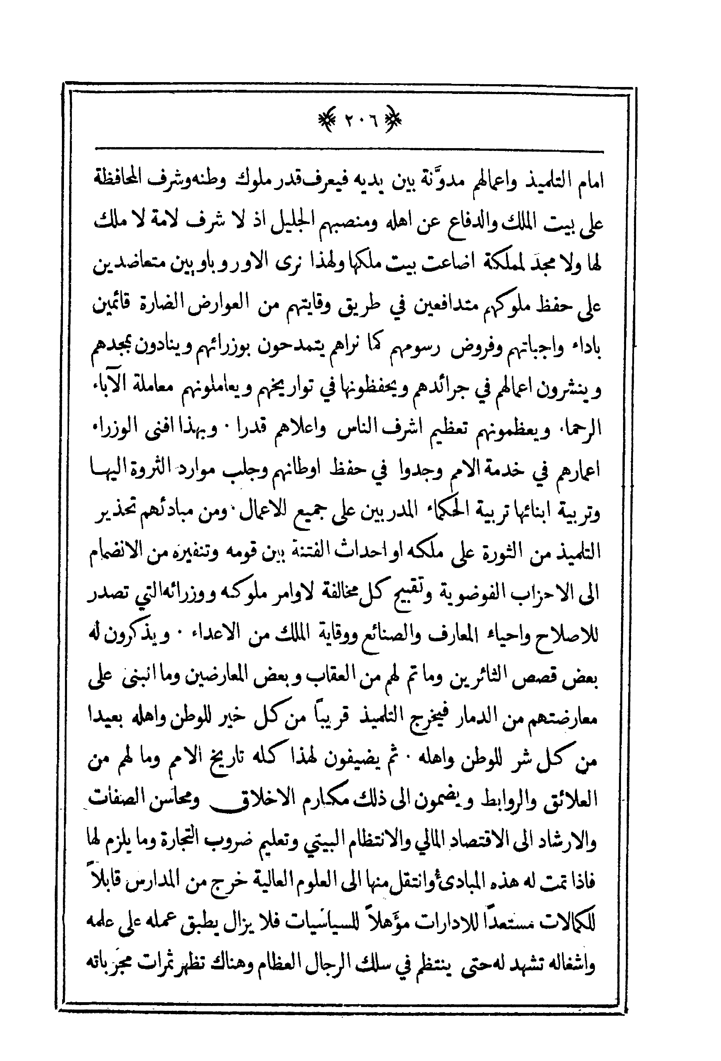 أمام التلميذ وأعمالهم مدونة بين يديه يعرف قدر ملوك وطنه وشرف المحافظة على بيت الملك والدفاع عن أهله ومنصبهم الجليل إذ لا شرف لأمة لا ملك لها ولا مجد لمملكة أضاعت بيت ملكها ولهذا نرى الأوروباويين متعاضدين على حفظ ملوكهم متدافعين في طريق وقايتهم من العوارض الضارة قائمين بأداء واجباتهم وفروض رسومهم كمما نراهم يمتدحون بوزرائهم وينادون بمجدهم وينشرون أعمالهم في جرائدهم ويحفظونها في تواريخهم ويعاملونهم معاملة الآباء الرحماء ويعظمونهم تعظيم أشرف الناس وأعلاهم قدراً. وبهذا أفنى الوزراء أعمارهم في خدمة الأمم وجدوا في حفظ أوطانهم وجلب موارد الثورة إليها وتربية أبنائها تربية الحكماء المدربين على جميع الأعمال ومن مبادئهم تحذير التلميذ من الثورة على ملكه أو أحداث الفتنة بين قومه وتنفيره من الانضمام إلى الأحزاب الفوضوية وتقبيح كل مخالفة لأوامر ملوكه ووزرائه التي تصدر للإصلاح وأحياء المعارف والصنائع ووقاية الملك من الأعداء. ويذكرون له بعض قصص الثائرين وما تم لهم من العقاب وبعض المعارضين وما أنبنى على معارضتهم من الدمار فيخرج التلميذ قريباَ من كل خير للوطن وأهله بعيداً من كل شر للوطن وأهله. ثم يضيفون لهذا كله تاريخ الأمم وما