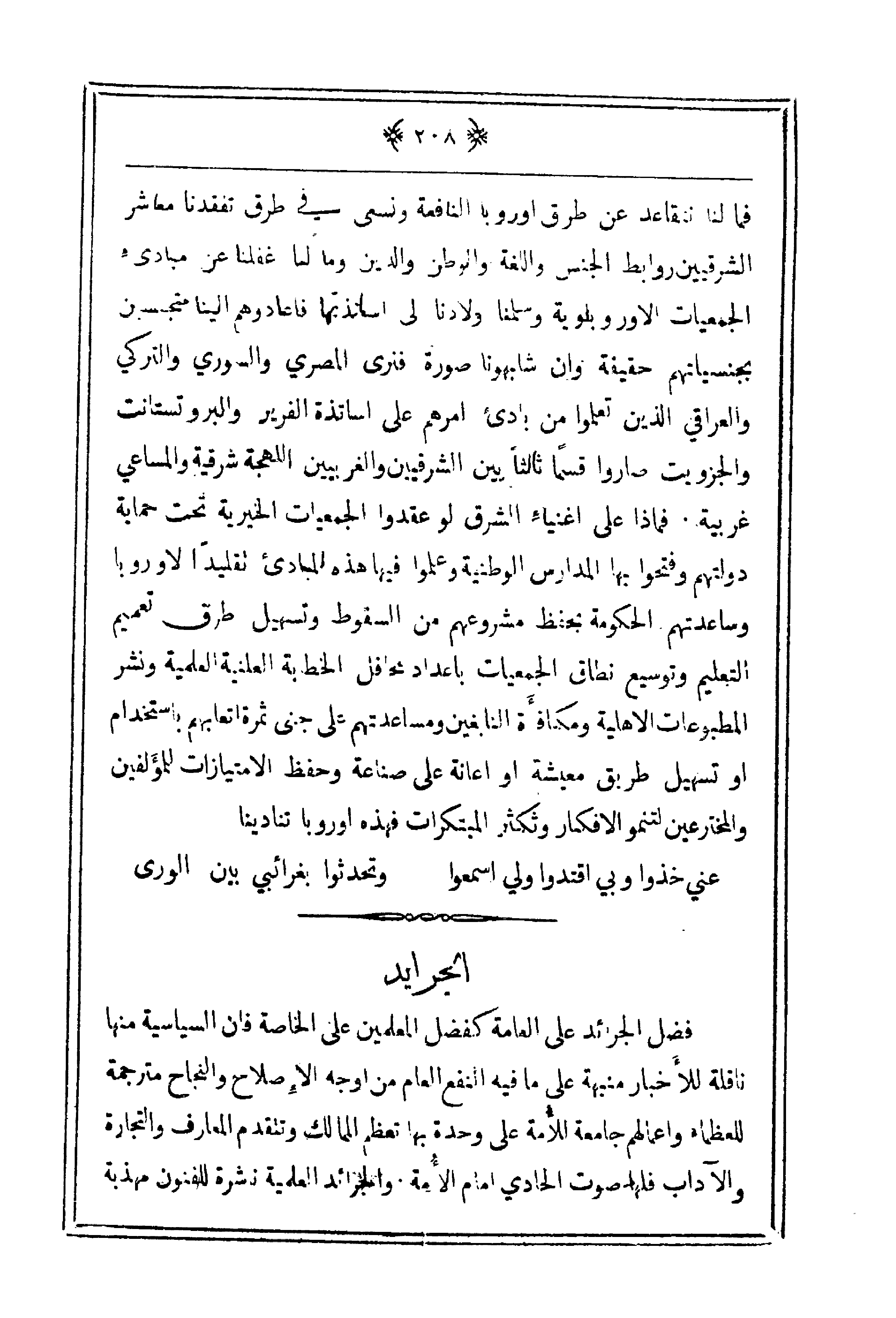 فما لنا نتقاعد عن طرق أوروبا النافعة ونسعى في طرق تفقدنا معاشر الشرقيين روابط الجنس واللغة والوطن والدين وما لنا غفلنا عن مبادئ الجمعيات الأوروباوية وسلمنا أولادنا إلى أساتذتها فأعادوهم إلينا متجسبن بجنسياتهم حقيقة وأن شابهونا صورة فنرى المصري
