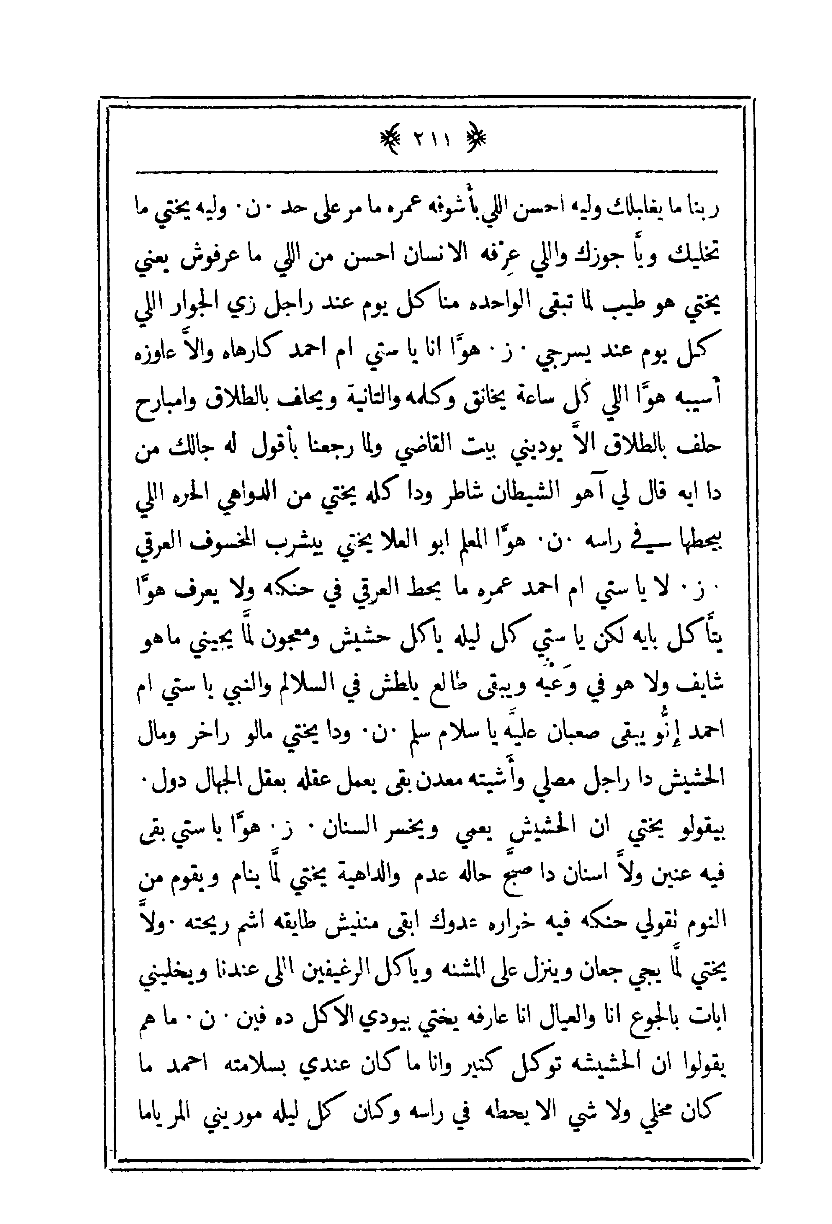 ربنا ما يغلبلك وليه أحسن اللي أبشوفه عمره ما مر على حد. ن، وليه يختي ما تخليك ويا حجوزك واللي عرفه الإنسان أحسن من اللي ما عرفوش يعني يختي هو طيب لما تبقي الواحدة منا كل يوم عند راجل زيا لحجوار اللي كل يوم عند يسرجي. ز، هوا أنا يا ستي أم أحمد كارهاه وإلا عاوزه أسيبه هةا اللي كل ساعة يخانق وكلمه والثانية ويحلف بالطلاق وامبارح حلف بالطلااق ألا يودجيني بيت القاضي ولما رجعنا بأقةول له جالك من دا أيه قال لي آهو الشيطان شاطر واد كله يختي من الدواهي الحرة اللي بيحطها في راسه. ن، هوا المعلم أبو العلا يختي بيشرفب المخسوف العرقي. ز، لا يا ستي أم أحمد عمره ما يحط العرقي في حنكه ولا يعرف هوا يتأكل بايه لكن يا ستي كل ليله ياكل حشيش ومعجون لما يجبني ما هو شايف ولا هو في وعيه ويبقى طالع يطلش في السلالم والنبي يا ستي أم أحمد أنو يبقى صعبان عليه يا سلام سلم. ن، وادا يختي مالو راخر ومال الحشيش دا رادل مصلي وأشيته معدن بقى يعمل عقله بعقل الجاهال دول بيقولوه يختي أن الحشيش يعمي ويخسر السنان. ز، هوا يا ستي بقى فيه عنين ولا أسنان دا صبح حاله عدم والداهيه يختي لما ينام ويقوم من النوم تقولي حنكه فيه خراره عدوك أبقى مننيش طايقه أشم ريحته ولا خيتي لما يجي حجعان وينزل على مشنه وياكل الرغيفين اللي عندنا ويخلين أبات بالجوع أنا والعيال أنا عرافه يختي بيودي الأكل ده فين. ن، ما هي يقولوا أحشيشة توكل كتير وأنا ما كان عندي بسلامته أحمد كانم مخلي ولا شي إلا يطه في راسه وكان كل ليلة مورني المر