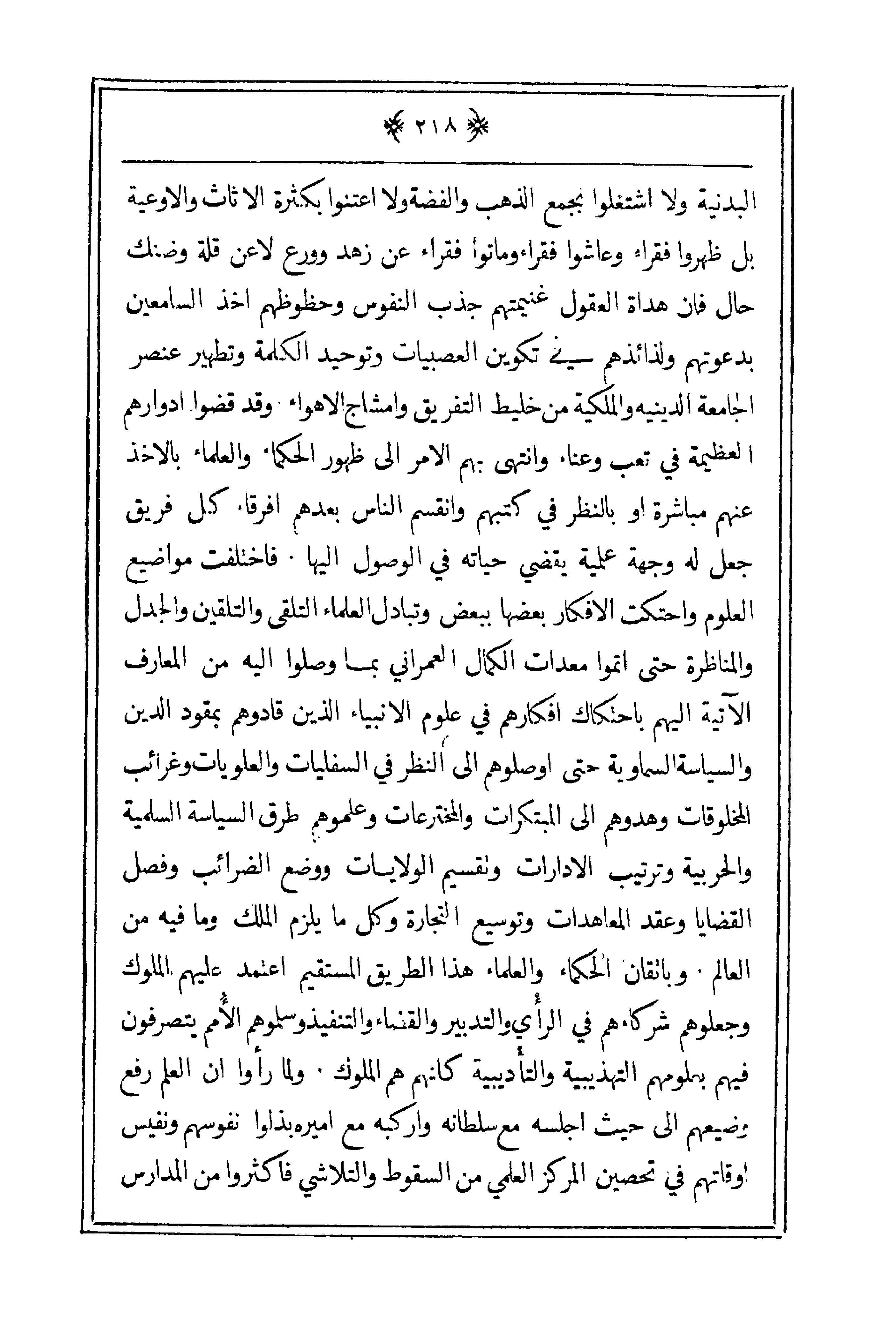 البدنية ولا اشتغلوا بجمع الذهب والفضة ولا اعتنوا بكثرة الأثاث والأوعية بل ظهروا فقراء وعاشوا فقراء وماتوا فقراء عن زهد وورع لا عن قلة وضنك حال فإن هداة العقول غنيمتهم جذب النفوس وحظوظهم أخذ السامعين بدعوتهم ولذائذهم في تكوين العصبيات وتوحيد الكلمة وتطهير عنصر الجامعة الدينية والملكية من خليط التفريق وأمشاج الأهواء وقد قضوا أدوارهم العظيمة في تعب وعناء وانتهى بهم الأمر إلى ظهور الحكماء والعلماء بالأخذ عنهم بمشارة أو بالنظر في كتبهم وأنقسم الناس بعهدهم فرقاء كل فريق جعل له وجهة علمية يقضي حياته في الوصول إليها. فاختلفت مواضيع العلوم واحتكت الأفكار بعضها ببعض وتبادل العلماء التقى والتلقين والجدل والمناظرة حتى أتموا معدات الكمال العمراني بما وصولا إليه من المعارف الآتية إليهم باحتكام أفكارهم فيع ولم الأنبياء الذين قادوهم بمقود الدين والسياسة السماوية حتى أوصولهم إلى النظر في السلفيات والعلويات وغرائيس المخلوقات وهدوهم إلى المبتكرات والمترعات وعلموهم طرق السياسة السلمية والحربية وترتيب الإدارات وتقسيم الولايات ووضع الضرائب وفصل القضايا وعقد المعاهدات وتسيوع التجارة وكل ما يلزم المكل وما فيه من العلام. وبإتقان الحكماء والعلماء هذا الطريق المستقيم اعتمد عليهم الملوك وجعلوهم شركاءهم في الرأي والتدني والنساء والتنفيذ وسلموهم الأمم يتصرفون فيهم بعلومهم التهذيبية والتأديبية كأنهم هم الملوك. ولما رأوا أن العلم رفع وضيعهم إلى حيث أجالسه مع