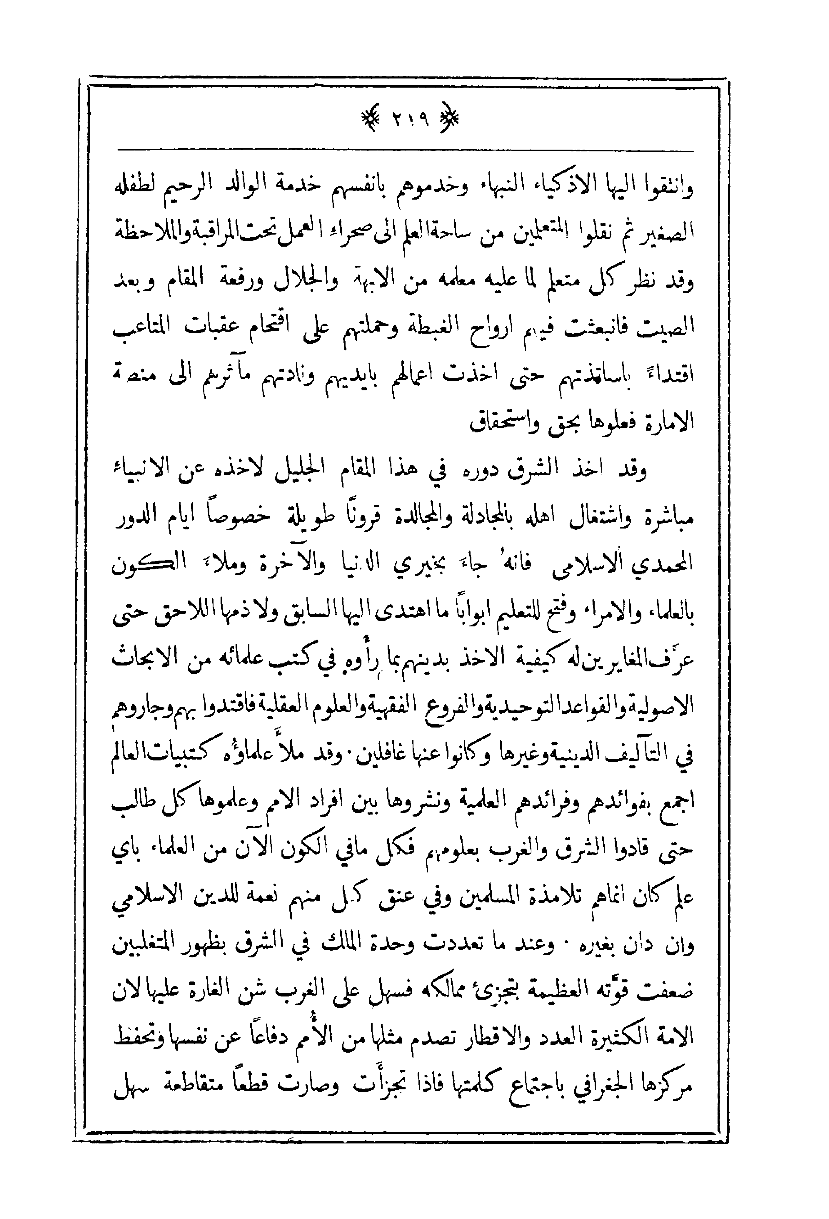 وقد أخذ الشرق دوره في هذا المقام الدليل لأخذه عن الأنبياء مباشرة واشتغال أهله بالمجادلة والمجادلة قروناً طويلة خصوصاً أيام الدور المحمدي الإسلامي فإنه جاء بخيري الدنيا والآخروة ملاء الكون بالعلماء والأمراء وفتح للتعليم أبواباً ما اهتداى إليها السابق ولا ذمها اللاحق حتى عرف المعايرين له كيفية الأخذ بدينهم بما رأواه في كتب علمائه من الأبحاث الأًولية والقواعد التوحيدية والفروع الفقهية والعلوم العقلية فاقتدوا بهم وجاروهم في التأليف الدينية وغيرها وكانوا عنها غافلين وقد ملأ علماؤه كتبيات العالم أجمع بفوائدهم وفرائدهم العلمية ونشروها بين أفراد الأمم وعلموها كل طالل حتى قادوا الشرق والغرب بعلومهم فكل ما في الكون الآن من العلماء بأي علم كان أنماهم تلامذة المسلمين وفي عنق كل منهم نعمة للدين الإسلامي وإن دان بغيره. وعند ما تعددت وحدة الملك في الشرق بظهور المتغلبين ضعفت قوته العظيمة بتجزئة ممالكه فسهل على الغرب شن الغارة عليها الآن الأمة الكثيرة العدد والأقطار تصدم مثلها من الأمم دفاعاً عن نفسها وتحفظ مركزها الجغرافي باجتماع كلمتها فإذا تجزأت وصارت قطعاً متقاطعة سهل