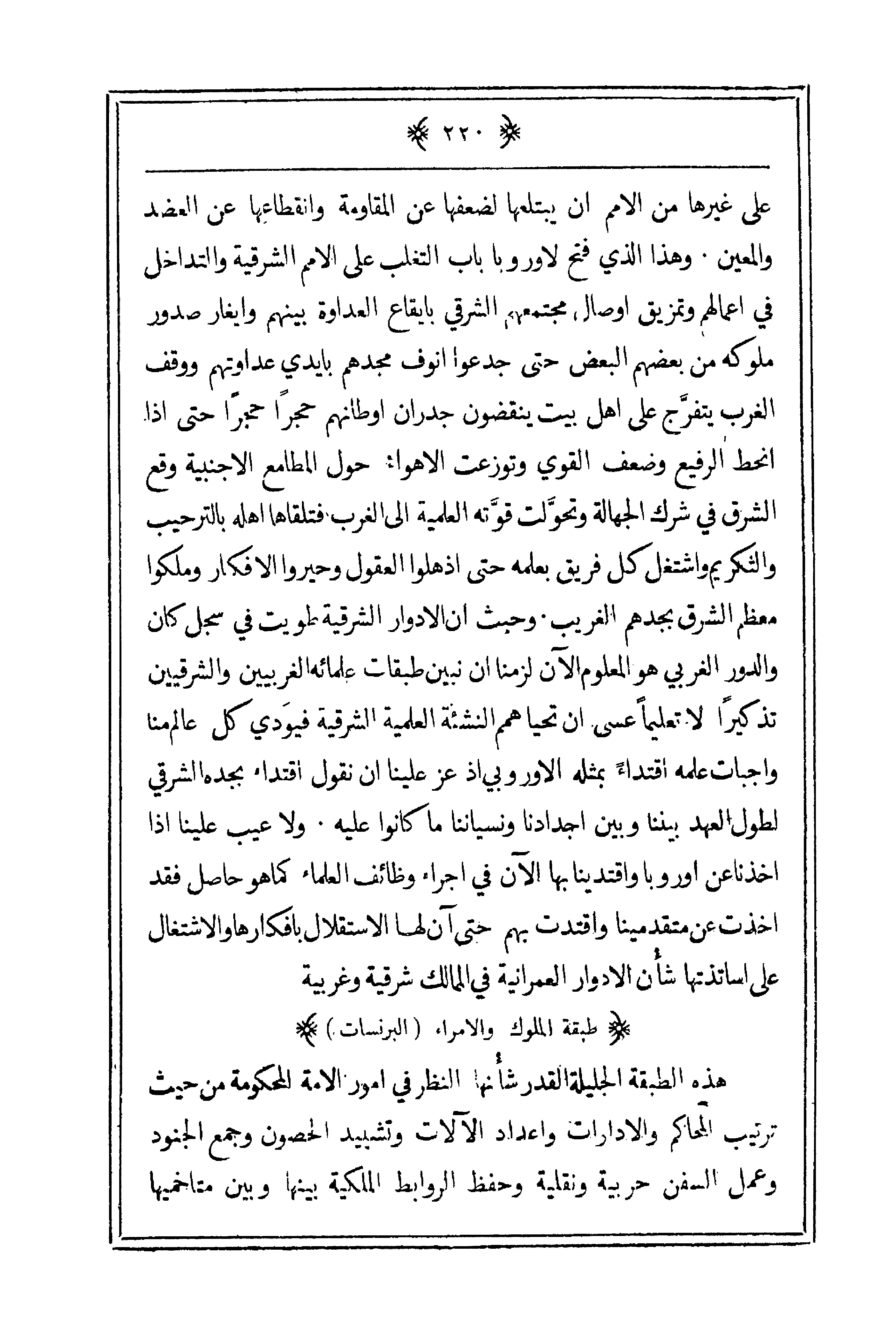 كل فريق بعلمه حتى أذهلوا العقول وحيروا الأفكار وملكوا معظم الشرق بجدهم الغريب. وحيث أن الأدوار الشرقية طويت في سجل كان والدور الغربي هو المعلوم الآن لزمنا أن نبين طبقات علمائه الغربيين والشرقيين تذكيراً لا تعليماً عسى أن تحيا همم النشئة الشرقية فيودي كل عالم منا واجبات علمه اقتداءً بمثله الأوروبي إذ عز علينا أن نقول اقتداء بجده الشرقي لطول العهد بيننا وبين أجدادنا ونسياننا ما كانوا عليه. ولا عيب علينا إذا أخذنا عن أوروبا واقتدينا بها الآن في إجراء وظائف العلماء كما هو حاصل فقد أخذت عن متقدمينا واقتدت بهم حتى آن لها الاستقلال بأفكارها والاشتغال على أساتذتها شأن الأدوار العمرانية في الممالك شرقية وغربية.