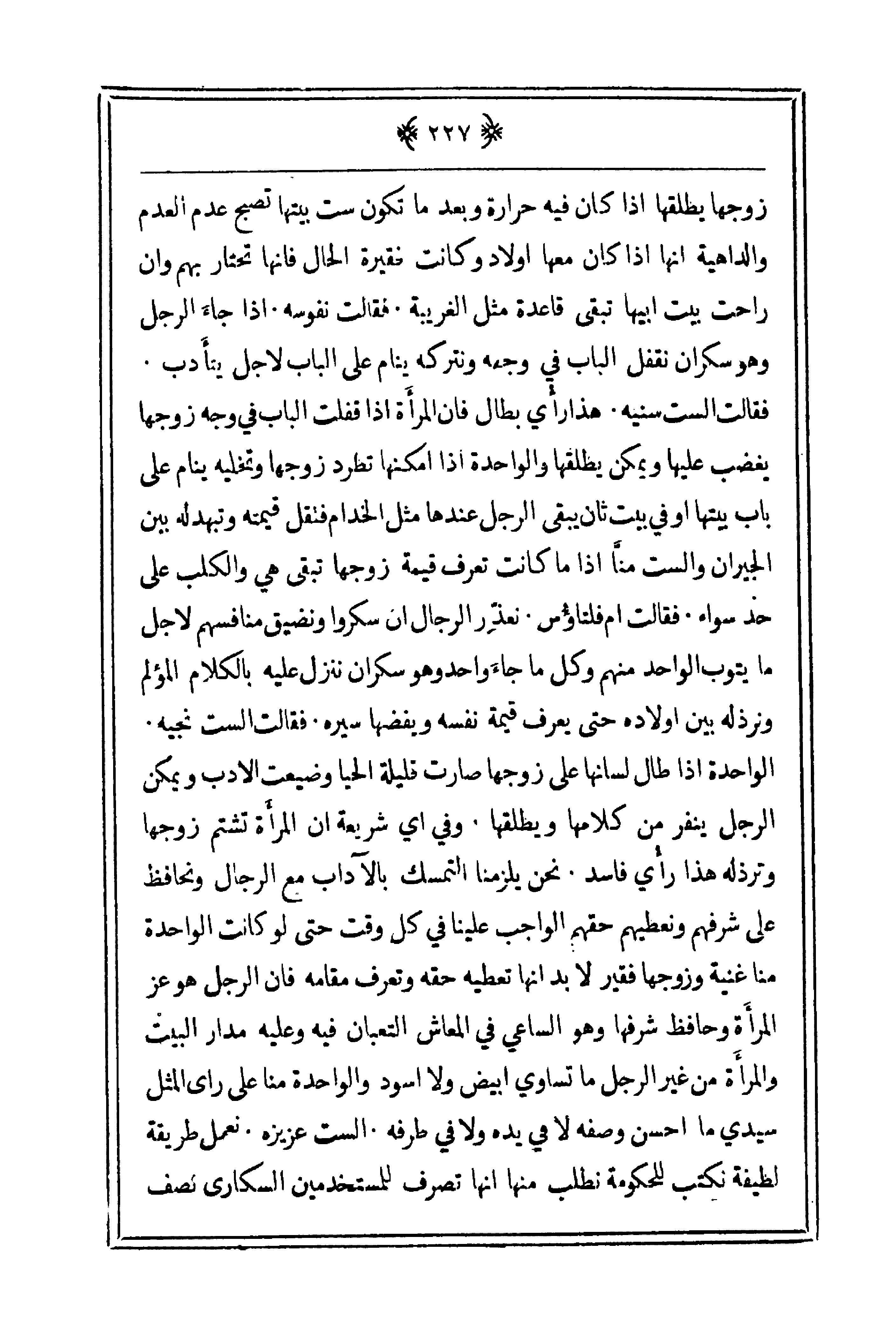 زوجها يطلقها إذا كان فيه حرارة وبعد ما تكون ست بيتها تصبح عدم العدم والداهية إنها إذا كان معها أولاد وكانت فقيرة الحال فإنها تحتار بهم وأن راحت بيت أبيها تبقى قاعدة مثل الغريبة. فقالت نفوسه. إذا جاء الرجل وهو سكران نقفل الباب في وجهه ونتركه ينام على الباب لأجل يتأدب. فقالت الست سنية. هذا رأي بطال فإن المرأة إذا قفلت الباب في وجه زوجها يغضب عليها ويمكن يطلقها والواحدة إذا أمكنها تطرد زوجها وتخليه ينام على باب بيتها أو في بيت ثان يبقى الرجل عندها مثل الخدام فتقل قيمته وتبهدله بين الجيران والست منا إذا