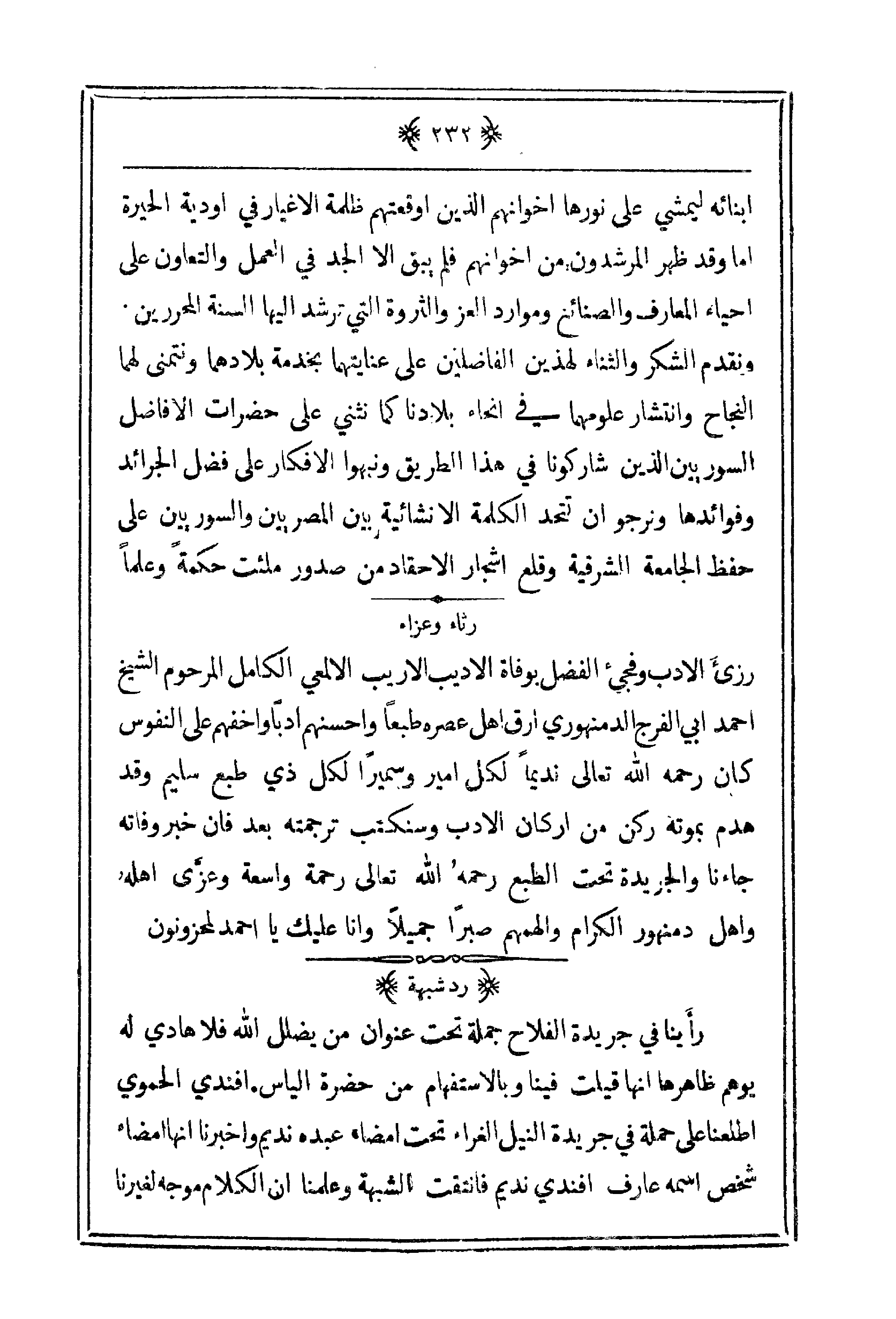 رزئَ الأدب وفجئ الفضل بوفاة الأديب الأريب الألمعي الكامل المرحوم الشيخ أحمد أبي الفرج الدمنهوري أرق أهل عصره طبعاً وأحسنهم أدباً وأخفهم على النفوس كان رحمه الله تعالى نديماً لكل أمير وسميراً لكل ذي طبع سليم وقد هدم بموته ركن من أركان الأدب وسنكتب ترجمته بعد فإن خبر وفاته جاءنا والجريدة تحت الطبع رحمه الله تعالى رحمة واسعة وعزّى أهله وأهل دمنهور الكرام وألهمهم صبراً جميلاً وأنا عليك يا أحمد لمحزونون.