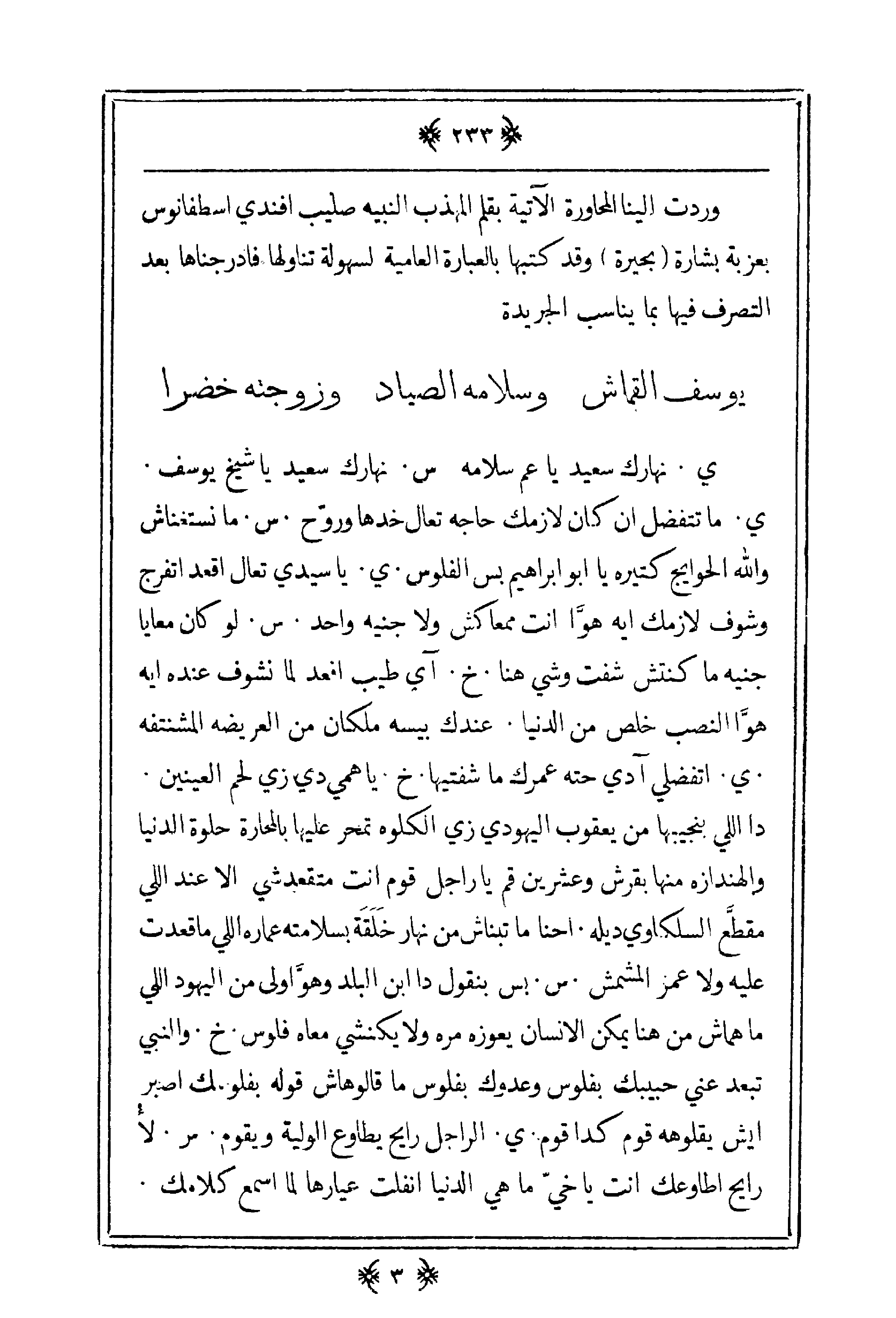 ي. نهارك سعيد يا عم سلامة س. نهارك سعيد يا شيخ يوسف. ي. ما تتفضل إن كان لازمك حاجة تعال خدها وروح. س. مانستغناش والله الحوايج كتيرة يا أبو إبراهيم بس الفلوس. ي. ياسيدي تعال اقعد اتفرج وشوف لازمك ايه هوا انت ممعاكش ولا جنيه واحد. س. لو كان معايا جنيه ما كنتش شفت وشي هنا. خ. آي طيب اقعد لما نشوف عنده ايه هوّا النصب خلص من الدنيا. عندك بيسه ملكان من العريضة المشنتفه. ي. اتفضلي آدي حته عمرك ما شفتيها. خ. يا همي دي زي لحم العينين. دا اللي بنحبيبها من يعقوب اليهودي زي الكلوه تمر عليها بالمحارة حلوة الدنيا والهندازه منها بقرش وعشرين قم يا راجل قوم انت متقعدشي إلا عند اللي مقطع السلكاوي ديله. احنا ما تبناش من نهار خلقة بسلامته عمارة اللي ما قعدت عليه ولا عمر المشمش. س. بس بنقول دا ابن البلد وهو أولى من اليهود اللي ما هماش من هنا يمكن الإنسان يعوزه مره ولا يكنشي معاه فلوس. خ. والنبي تبعد عني حبيبك بفلوس وعدوك بفلوس ما قالوهاش قوله بفلوسك اصبر ايش يقلوهه قوم كدا قوم. ي. الراجل رايح يطاوع الولية ويقوم. س. لأ رايح أطاوعك انت يا خي ما هي الدنيا انفلت عيارها لما اسمع كلامك.