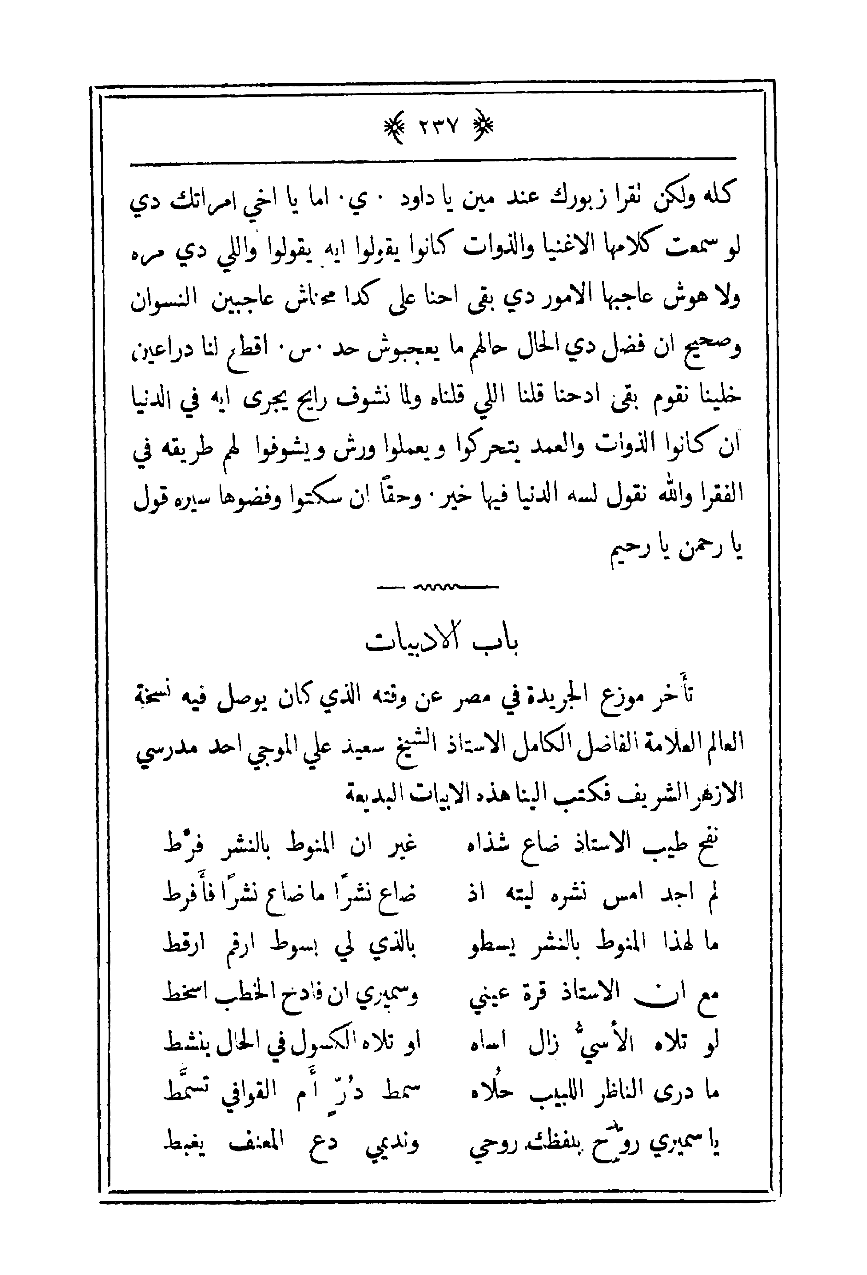 تأخر موزع الجريدة في مصر عن وقته الذي كان يوصل فيه نسخة العالم العلامة الفاضل الكامل الأستاذ الشيخ سعيد علي الموجي أحد مدرسي الأزهر الشريف فكتب إلينا هذه الأبيات البديعة: