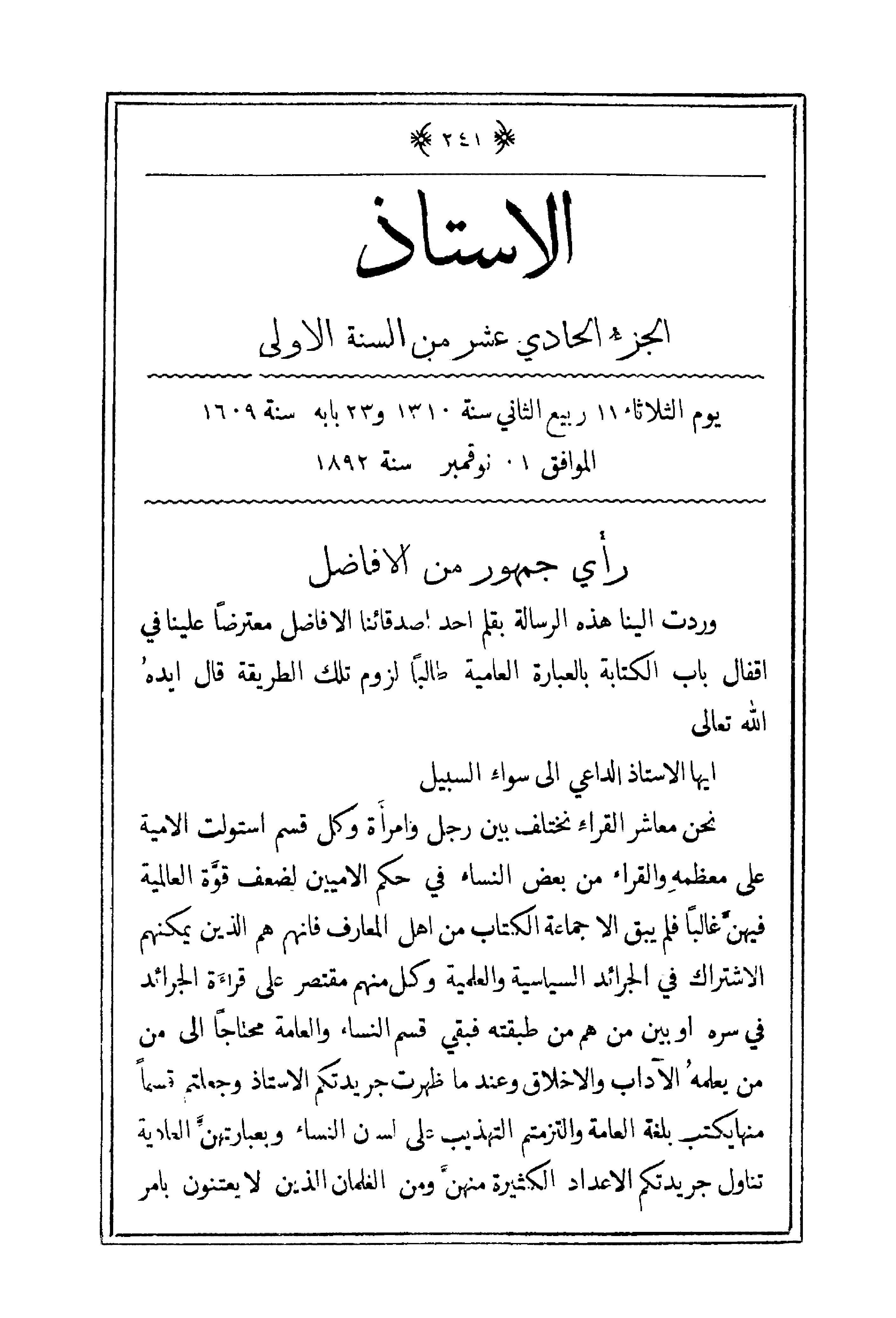 نحن معاشر القراء نختلف بين رجل وامرأة وكل قسم استولت الأمية على معظمه والقراء من بعض النساء في حكم الأميين لضعف قوة العالمية فيهن غالباً فلم يبق إلا جماعة الكتاب من أهل المعارف فإنهم هم الذين يمكنهم الاشتراك في الجرائد السياسية والعلمية وكل منهم مقتصر على قراءة الجرائد في سره أو بين من هم من طبقته فبقي قسم النساء والعامة محتاجاً إلى من يعلمه الآداب والأخلاق وعندما ظهرت جريدتكم الأستاذ وجعلتم قسماً منها يكتب بلغة العامة والتزميم التهذيب على لسان النساء وبعبارتهن العادية تناول جريدتكم الأعداء الكثيرة منهن ومن الغلمان الذين لا يعتنون بأمر