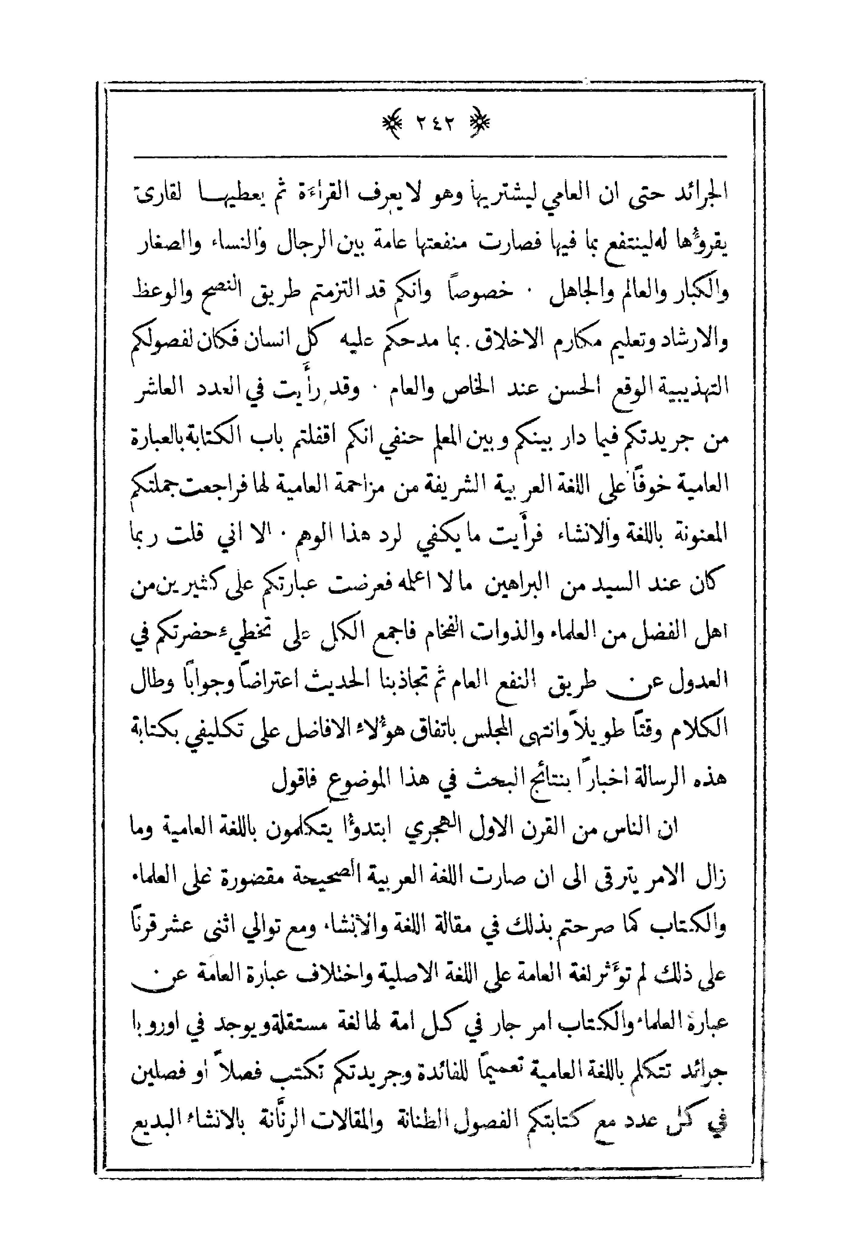 الجرائد حتى أن العامي ليشتريها وهو لا يعرف القراءة ثم يعطيها لقارئ يقرؤها له لينتفع بما فيها فصارت منفعتها عامة بين الرجال والنساء والصغار والكبار والعالم والجاهل. خصوصاً وأنكم قد التزمتم طريق النصح والوعظ والإرشاد وتعليم مكارم الأخلاق بما مدحكم عليه كل إنسان فكان لفصولكم التهذيبية الوقع الحسن عند الخاص والعام. وقد رأيت في العدد العاشر من جريدتكم فيما دار بينكم وبين المعلم حنفي أنكم أقفلتم باب الكتابة بالعبارة العامية خوفاً على اللغة العربية الشريفة من مزاحمة العامية لها فراجعت جملتكم المعنونة باللغة والإنشاء فرأيت ما يكفي لرد هذا الوهم. إلا أني قلت ربما كان عند السيد من البراهين ما لا أعلمه فعرضت عبارتكم على كثيرين من أهل الفضل من العلماء والذوات الفخام فأجمع الكل على تخطي حضرتكم في العدول عن طريق النفع العام ثم تجاذبنا الحديث اعتراضاً وجواباً وطال الكلام وقتاً طويلاً وانتهى المجلس باتفاق هؤلاء الأفاضل على تكليفي بكتابة هذه الرسالة أخباراً بنتائج البحث في هذا الموضوع فأقول