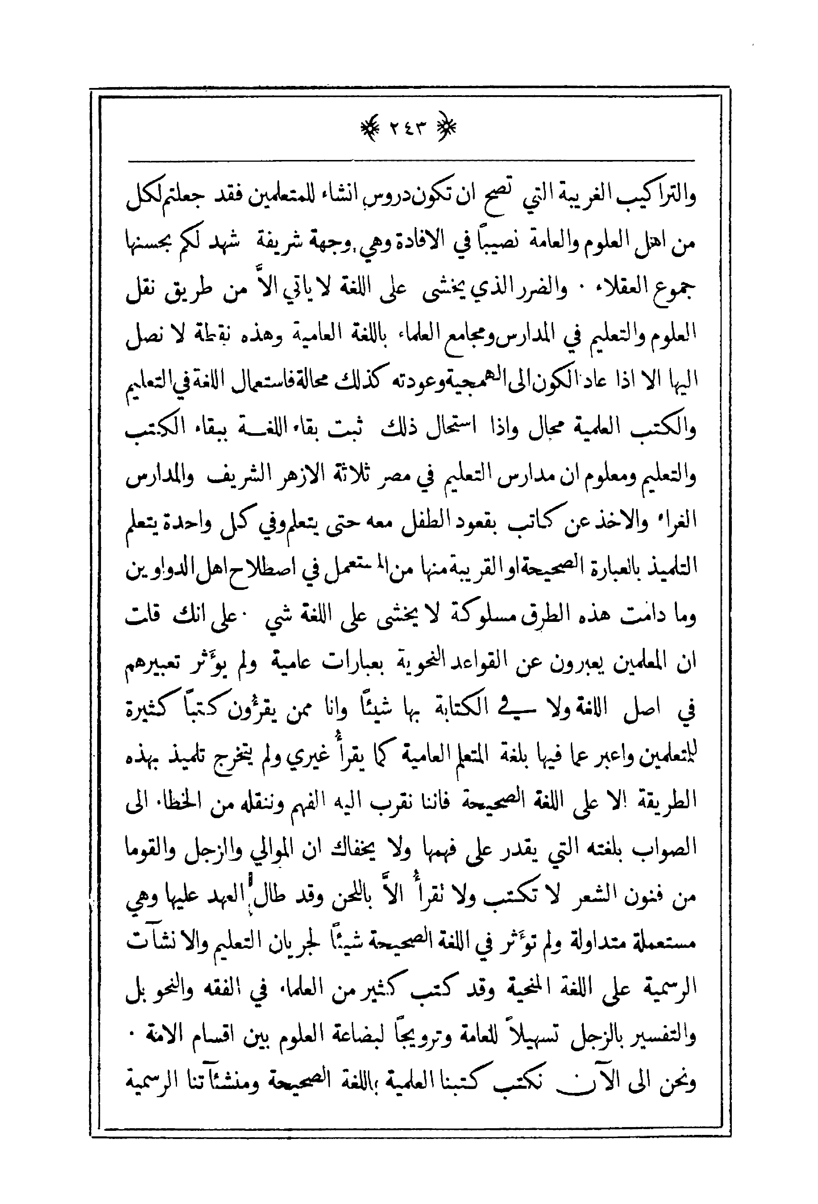 والتراكيب الغريبة التي تصح أن تكون دروس إنشاء للمتعلمين فقد جعلتم لكل من أهل العلوم والعامة نصيباً في الإفادة وهي وجهة شريفة شهد لكم بحسنها جموع العقلاء. والضرر الذي يخشى على اللغة لا يأتي إلا من طريق نقل العلوم والتعليم في المدارس ومجامع العلماء باللغة العامية وهذه نقطة لا نصل إليها إلا إذا عاد الكون إلى الهمجية وعودته كذلك محالة فاستعمال اللغة في التعليم والكتب العلمية مجال وإذا استحال ذلك ثبت بقاء اللغة ببقاء الكتب والتعليم ومعلوم أن مدارس التعليم في مصر ثلاثة الأزهر الشريف والمدارس الغراء والأخذ عن كاتب بقعود الطفل معه حتى يتعلم وفي كل واحدة يتعلم التلميذ بالعبارة الصحيحة أو القريبة منها من المستعمل في اصطلاح أهل الدواوين وما دامت هذه الطرق مسلوكة لا يخشى على اللغة شي. على أنك قلت أن المعلمين يعبرون عن القواعد النحوية بعبارات عامية ولم يؤثر تعبيرهم في أصل اللغة ولا في الكتابة بها شيئاً وأنا ممن يقرؤون كتباً كثيرة للمتعلمين وأعبر عما فيها بلغة المتعلم العامية كما يقرأ غيري ولم يتخرج تلميذ بهذه الطريقة إلا على اللغة الصحيحة فإننا نقرب إليه الفهم وننقله من الخطأ إلى الصواب بلغته التي يقدر على فهمها ولا يخفاك إن الموالي والزجل والقوما من فنون الشعر لا تكتب ولا تقرأ إلا باللحن وقد طال العهد عليها وهي مستعملة متداولة ولم تؤثر في اللغة الصحيحة شيئاً لجريان التعليم وإلا نشأت الرسمية على اللغة المنحية وقد كتب كثير من العلماء في الفقه والنحو بل والتفسير بالزجل تسهيلاً للعامة وترويجاً لبضاعة العلوم بين أقسام الأمة. ونحن إلى الآن نكتب كتبنا العلمية باللغة الصحيحة ومنشآتنا الرسمية