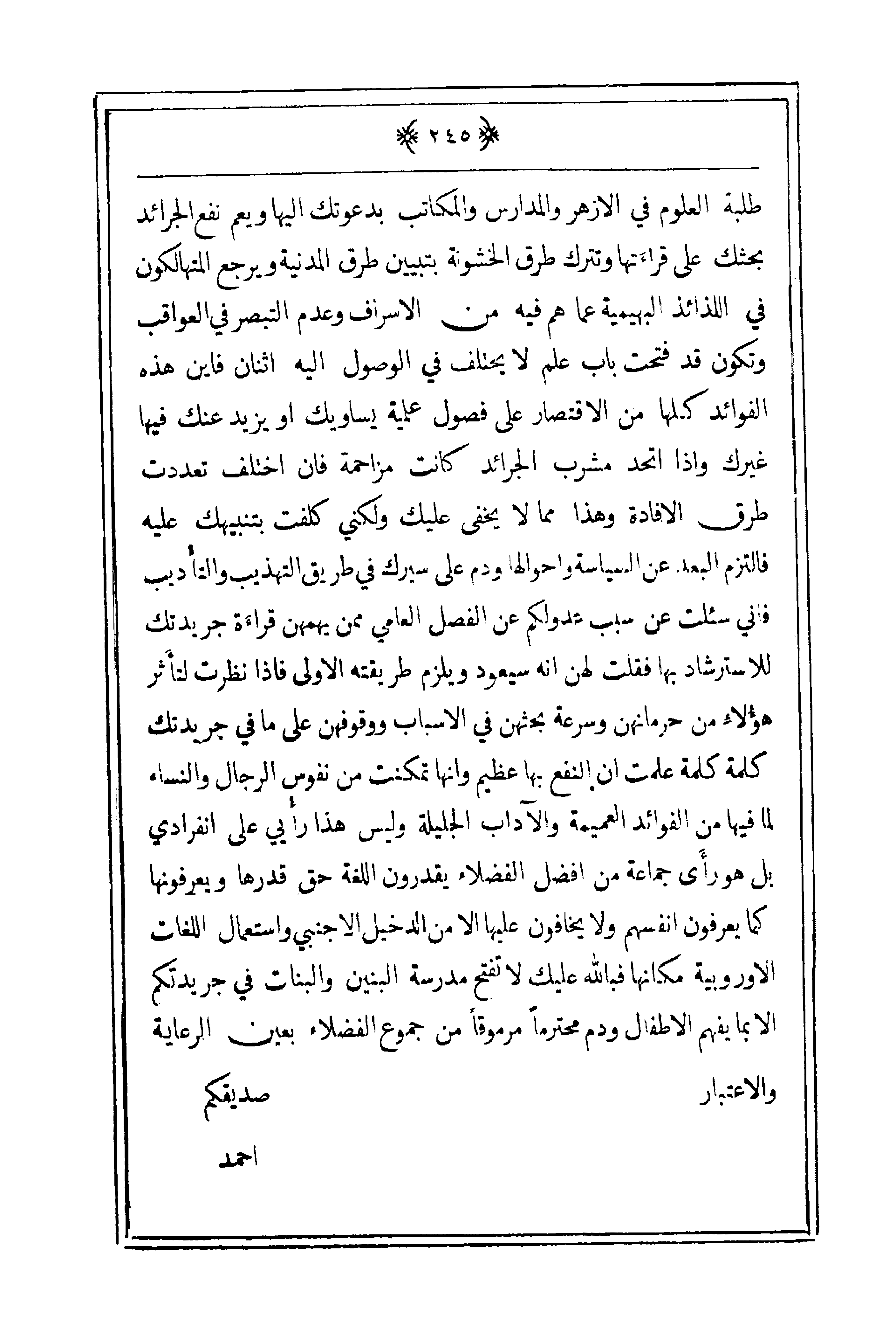 طلبة العلوم في الأزهر والمدارس والمكاتب بدعوتك إليها ويعم نفع الجرائد بحثك على قراءتها وتترك طرق الخشونة بتبييين طرق المدنية ويرجع المتهالكون في اللذائذ البهيمية عما هم فيه من الإسراف وعدم التبصر في العواقب وتكون قد فتحت باب علم لا يختلف في الوصول إليه اثنان فأين هذه الفوائد كلها من الاقتصار على فصول علمية يساويك أو يزيد عنك فيها غيرك وإذا اتحد مشرب الجرائد كانت مزاحمة فإن اختلف تعددت طرق الإفادة وهذا مما لا يخفى عليك ولكني كلفت بتنبيهك عليه فالتزم البعد عن السياسة وأحوالها ودم على سيرك في طريق التهذيب والتأديب فإني سئلت عن سبب عدولكم عن الفصل العامي ممن يهمهن قراءة جريدتك للاسترشاد بها فقلت لهن أنه سيعود ويلزم طريقته الأولى فإذا نظرت لتأثر هؤلاء من حرمانهن وسرعة بحثهن في الأسباب ووقوفهن على ما في جريدتك كلمة كلمة علمت أن النفع بها عظيم وأنها تمكنت من نفوس الرجال والنساء لما فيها من الفوائد العميمة والآداب الجليلة وليس هذا رأيي على انفرادي بل هو رأي جماعة من أفضل الفضلاء يقدرون اللغة حق قدرها ويعرفونها كما يعرفون أنفسهم ولا يخافون عليها إلا من الدخيل الأجنبي واستعمال اللغات الأوروبية مكانها فبالله عليك لا تفتح مدرسة البنين والبنات في جريدتكم إلا بما يفهم الأطفال ودم محترماً مرموقاً من جموع الفضلاء بعين الرعاية والاعتبار.