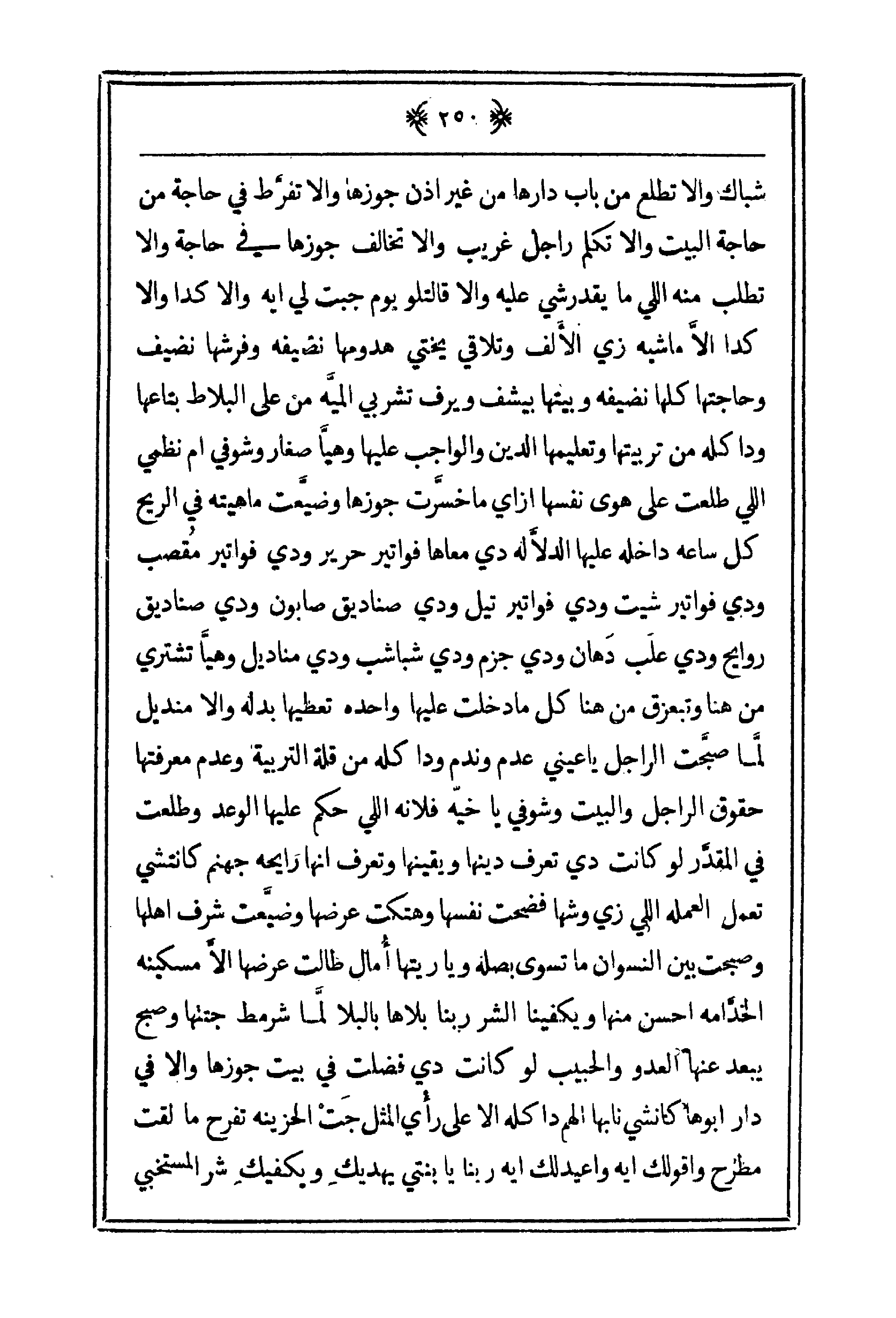شباك وإلا تطلع من باب دارها من غير جوزها وإلا تفرط في حاجة من حاجة البيت وإلا تكلم راجل غريب والا تخالف جوزها في حاجة في تطلب منه اللي ما يقدرشي عليه وإلا قالتلو بوم جبت لي ايه وإلا كدا وإلا كدا إلا ماية زي الألف وتلاقي يختي هدومها نضيفه وفرشها نضيف وحاجتها كلها نضيفة وبيتها بيشف وبرف تشربي الميه من على البلاط بتاعها ودا كله من تربيها وتعليمها الدين والواجب عليها وهيا صغار وشوفي أم نظمي اللي طلعت على هوى نفسها أزاي ما خسرت جوزها وضيعت ماهيته في الريح كل ساعة داخله عليها الدلاله دي معاها فواتير حرير ودي فواتير مقصب ودي فواتير شيت ودي فواتير تيل ودي صناديق صابون ودي مناديل وهيا تشتري من هنا وتبعزق من هنا كل ما دخلت عليها واحدة تعطيها بدله وإلا منديل لما صبحت الراجل يا عيني عدم وندم ودا كله من قلة التربية وعدم معرفتها حقوق الراجل لو كانت دي تعرف دينها ويقينها وتعرف أنها رايحة جهنم كانتشي تهمل
