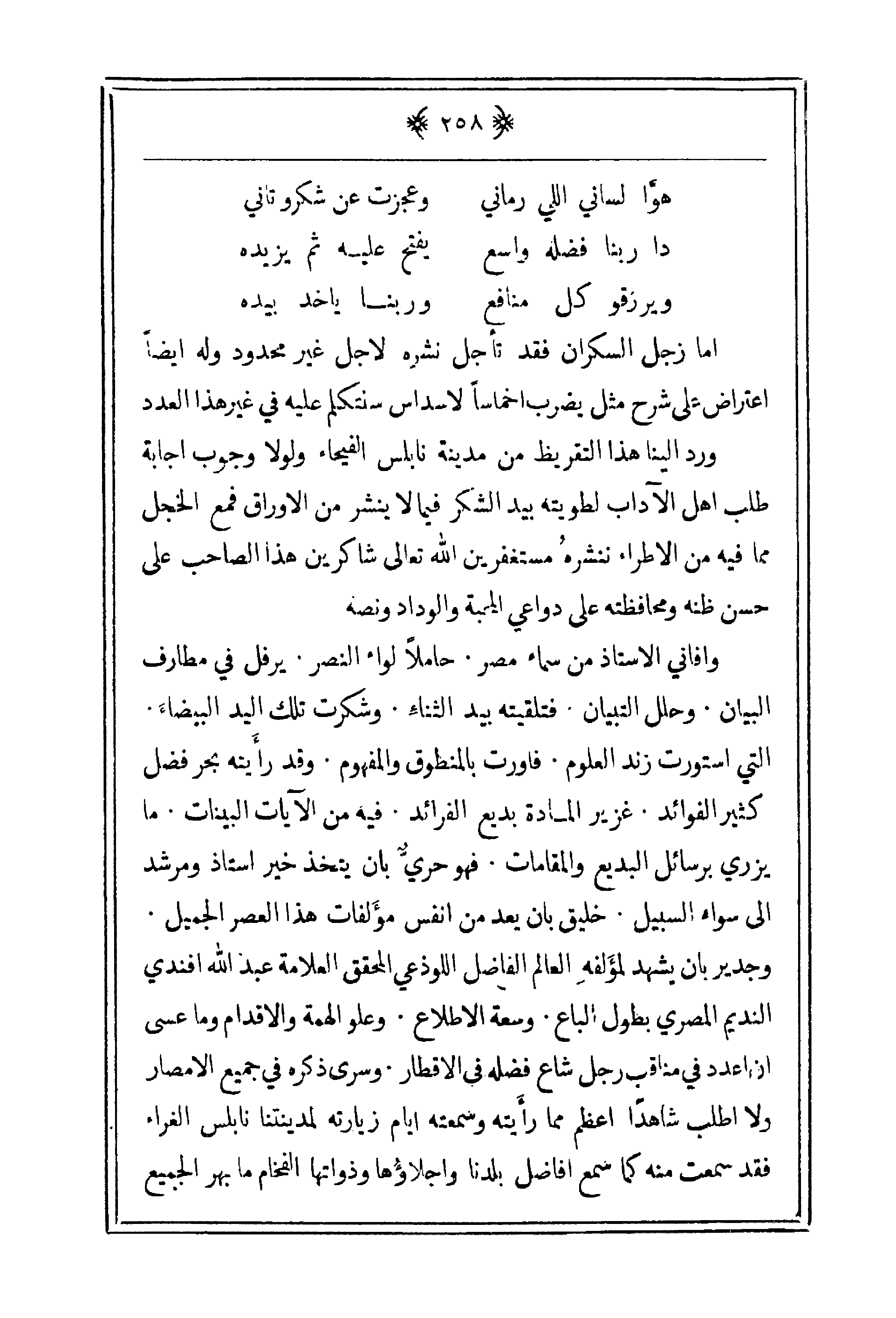 وافاني الأستاذ من سماء مصر. حاملاً لواء النصر. يرفل في مطارف البيان. وحلل التبيان. فتلقيته بيد الثناء. وشكرت تلك اليد البيضاء. التي استورت زند العلوم. فاورت بالمنطوق والمفهوم. وقد رأيته بحر فضل كثير الفوائد. غزير المادة بديع الفرائد. فيه من الآيات البينات. ما يزري برسائل البديع والمقامات. فهو حري بأن يتخذ خير أستاذ ومرشد إلى سواء السبيل. خليق بأن يعد من أنفس مؤلفات هذا العصر الجميل. وجدير بأن يشهد لمؤلفه العالم الفاضل اللوذعي المحقق العلامة عبد الله أفندي النديم المصري بطول الباع. وسعة الإطلاع. وعلو الهمة والإقدام وما عسى أن أعدد في مناقب رجل شاع فضله في الأقطار. وسرى ذكره في جميع الأمصار ولا أطلب شاهداً أعظم مما رأيته وسمعته أيام زيارته لمدينتنا نابلس الغراء فقد سمعت منه كما سمع أفاضل بلدنا وإجلاؤها وذواتها الفخام ما بهر الجميع