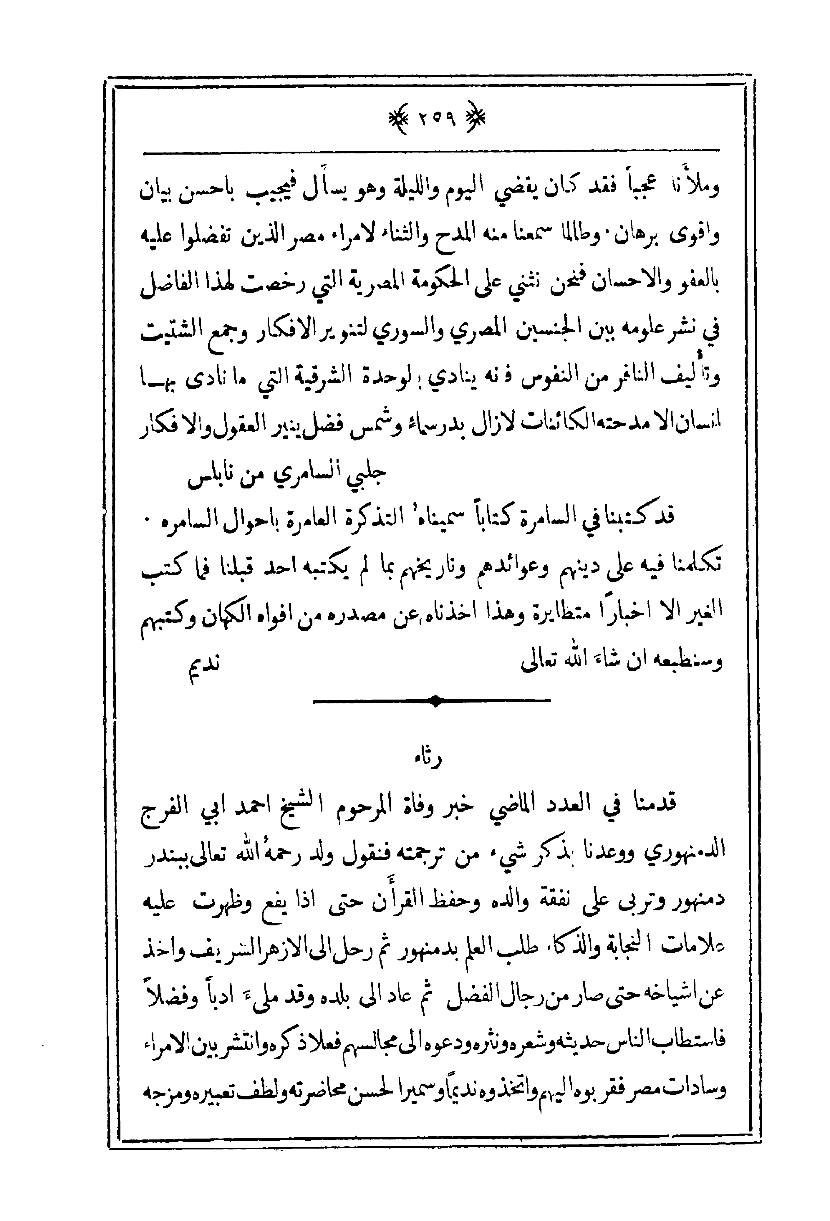 وملأنا عجباً فقد كان يقضي اليوم والليلة وهو يسأل فيجيب بأحسن بيان وأقوى برهان. وطالما سمعنا منه المدح والثناء لأمراء مصر الذين تفضلوا عليه بالفو والإحسان فنحن نثني على الحكومة المصرية التي رخصت لهذا الفاضل في نشر علومه بين الجنسين المصري والسوري لتنوير الأفكار وجمع الشتيت وتأليف النافر من النفوس فإنه ينادي بالوحدة الشرقية التي ما نادى بها إنسان إلا مدحته الكائنات لازال بدرسماء وشمس فضل ينير العقول والأفكار.
