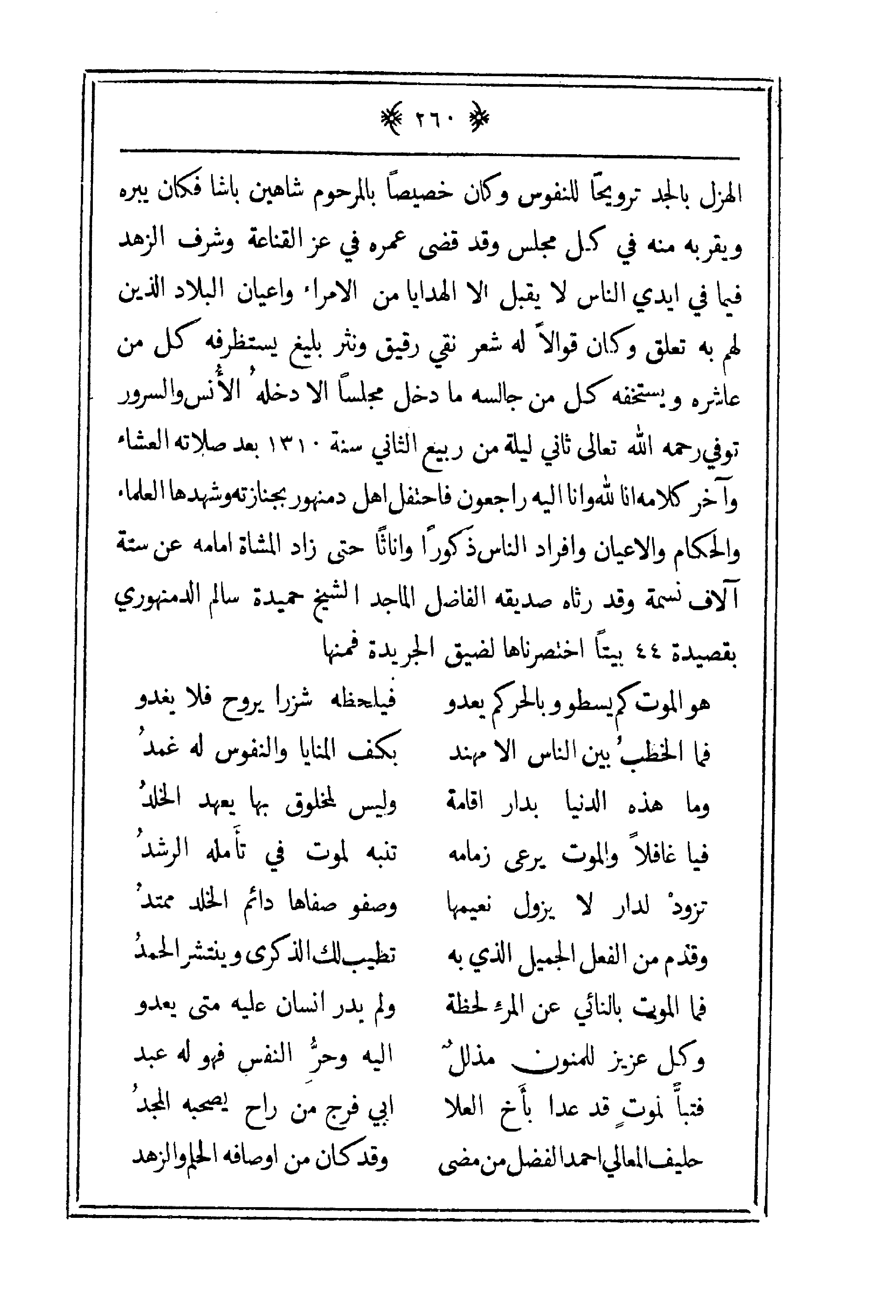الهزل بالجد ترويحاً للنفوس وكان خصيصاً بالمرحوم شاهين باشا فكان يبره ويقربه منه في كل مجلس وقد قضى عمره في عز القناعة وشرف الزهد فيما في أيدي الناس لا يقبل إلا الهدايا من الأمراء وأعيان البلاد الذين لهم به تعلق وكان قوالاً له شعر نقي رقيق ونثر بليغ يستظرفه كل من عاشره ويستخفه كل من جالسه ما دخل مجلساً إلا دخله الأنس والسرور توفي رحمه الله ثاني ليلة من ربيع الثاني سنة 1310 بعد صلاته العشاء وآخر كلامه إنا لله وإنا إليه راجعون فاحتفل أهل دمنهور بجنازته وشهدها العلماء والحكام والأعيان وأفراد الناس ذكوراً وإناثاً حتى زاد المشاة أمامه عن ستة آلاف نسمة وقد رثاه صديقه الفاضل الماجد الشيخ حميدة سالم الدمنهوري بقصيدة 44 بيتاً اختصرناها لضيق الجريدة فمنها: