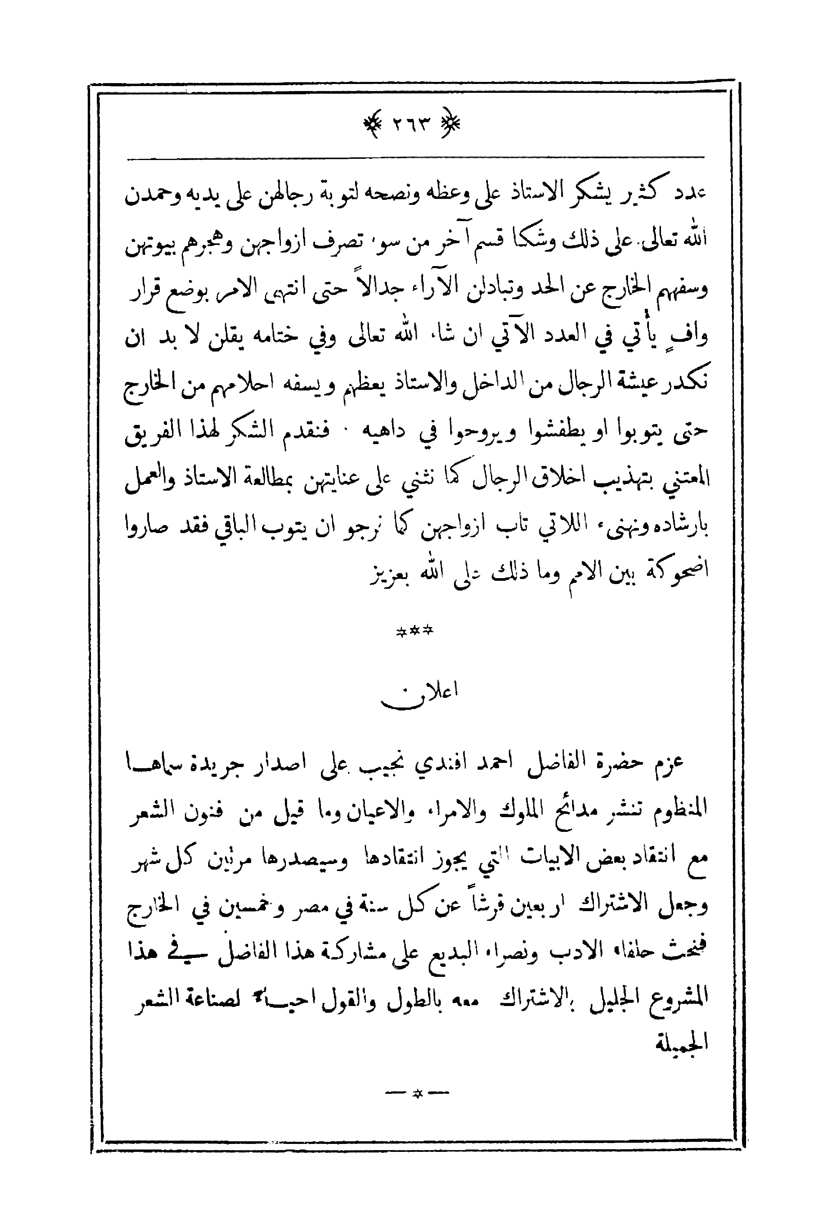 عدد كثير يشكر الأستاذ على وعظه ونصحه لتوبة رجالهن على يديه وحمدن الله تعالى على ذلك وشكا قسم آخر من سوء تصرف أزواجهن وهجرهم بيوتهن وسفههم الخارج عن الحد وتبادلن الآراء جدالاً حتى انتهى الأمر بوضع قرار وافٍ يأتي في العدد الآتي إن شاء الله تعالى وفي ختامه يقلن لابد أن نكدر عيشة الرجال من الداخل والأستاذ يعظهم ويسفه أحلامهم من الخارج حتى يتوبوا أو يطفشوا ويروحوا في داهيه. فنقدم الشكر لهذا الفريق المعتني بتهذيب أخلاق الرجال كما نثني على عنايتهن بمطالعة الأستاذ والعمل بإرشاده ونهنئ اللاتي تاب أزواجهن كما نرجو أن يتوب الباقي فقد صاروا أضحوكة بين الأمم وما ذلك على الله بعزيز.