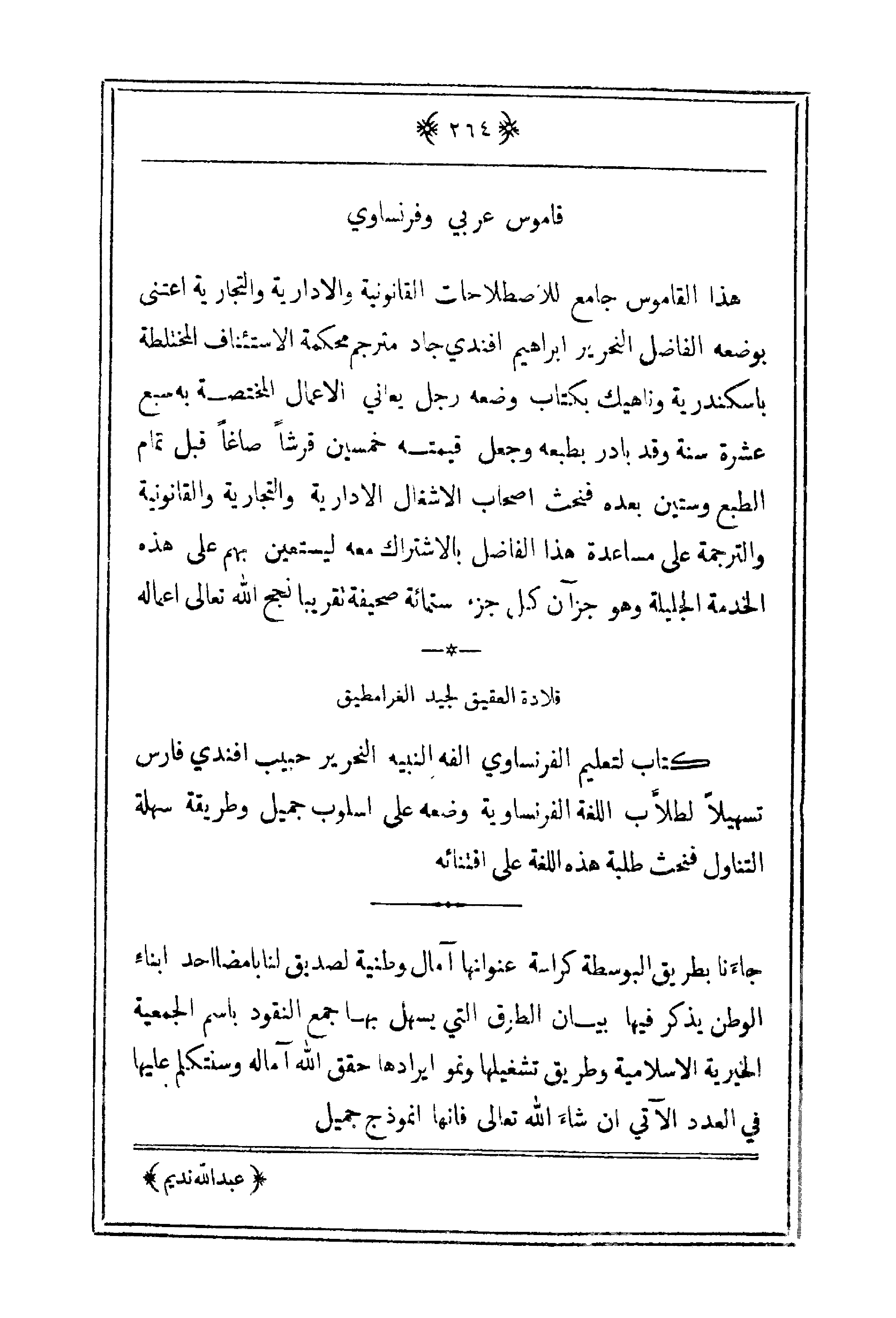 هذا القاموس جامع للاصطلاحات القانونية والإدارية والتجارية اعتنى بوضعه الفاضل التحرير إبراهيم أفندي جاد مترجم محكمة الاستئناف المختلطة باسكندرية وناهيك بكتاب وضعه رجل يعاني الأعمال المختصة به سبع عشر سنة وقد بادر بطبعه وجعل قيمته خمسين قرشاً صاغاً قبل تمام الطبع وستين بعده فنحث أصحاب الأشغال الإدارية والتجارية والقانونية والترجمة على مساعدة هذا الفاضل بالاشتراك معه ليستعين بهم على هذه الخدمة الجليلة وهو جزآن كل جزء ستمائة صحيفة تقريباً نجح الله تعالى أعماله.
