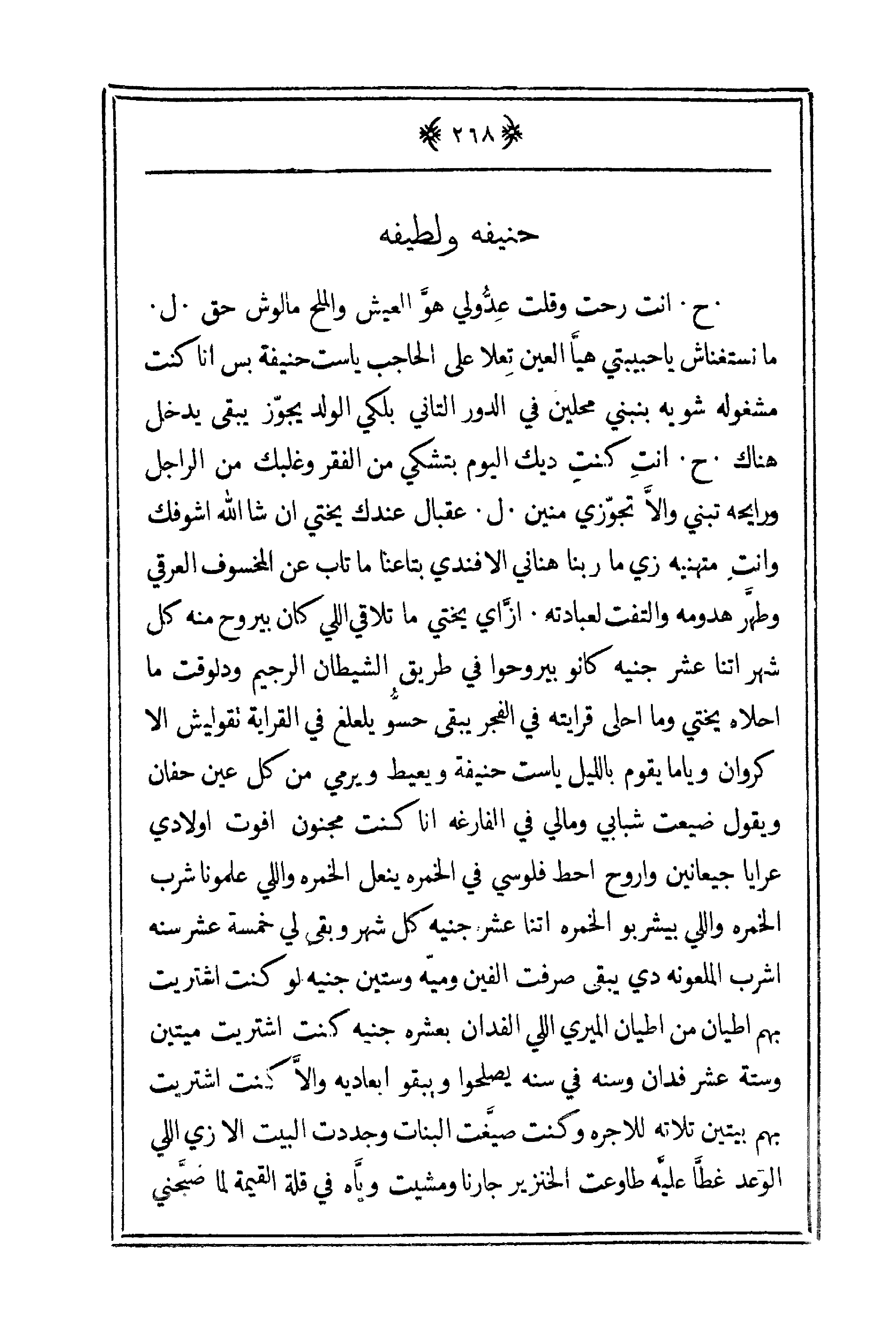 . ح. أنت رحت قلت عدّ! ُولي هو العيش والملح مالوش حق. ل. ما نستغناش يا حبيبتي هياَّ العين تعلا على الحاجب يا ست حنيفة بس أنا كنت مشغولة شوية بنبني محلين في الدور التاني بلكي الولد يجوز يبقى يدخل هناك. ح. أنتِ كن01تِ ديك اليوم بتشكي من الفقر وغلبك من الرجل ورايحه تبني وإلا يجوزي مني. ل. عقبال عندك بختي إن شاء الله اشوفك وأنت متهنية زي ما ربنا هناني الأفندي بتاعنا ما تاب عن المخسوف العرقي وطهر هدومه والتفت لعبادته. ازاي بختي ما تلاقي اللي كا بيروح منه كل شهر اتنا عشر جنيه كانوا بيروحوا في طريق الشيطان الرجيم ودلوقت ما احلاه يختي وما احلى قرايته في الفجر حسو يلعلع في القراية تقوليش إلا كروا وياما يقوم بالليل يا ست حنيفة ويعيط ويرمي من كل عين حفان ويقول ضيعت شبابي ومالي في الفارغة أناا كنت مجنون أفوت أولادي عرايا جيعانين واروح احط فلوسي في الخمر ينعل الخمرة واللي علمونا شرب الخمرة وللي بيشربوا الخمرة اتنا عشر جنيه كل شهر ويبقى لي خمسة عشر سنة اشرب الملعونة دي يبقى صرفت الفين وميه وستين جنية لو كنت اشتريت بهم أطيان من أطيان الميري اللي الفدان بعشرة جنيه كنت اشتريت ميتين وستة عشر فدان وسنة يصلحوا ويبقوا بعاديه وإلا كنت اشتريت بهم بيتين تلاتة للأجرة ونت صيغت البنات وجددت البيت إلا زي اللي الوعد غطَّا عليه طاوعت الخنزير جارنا ومشيت وياَّه في قلة القيمة لما صبحني