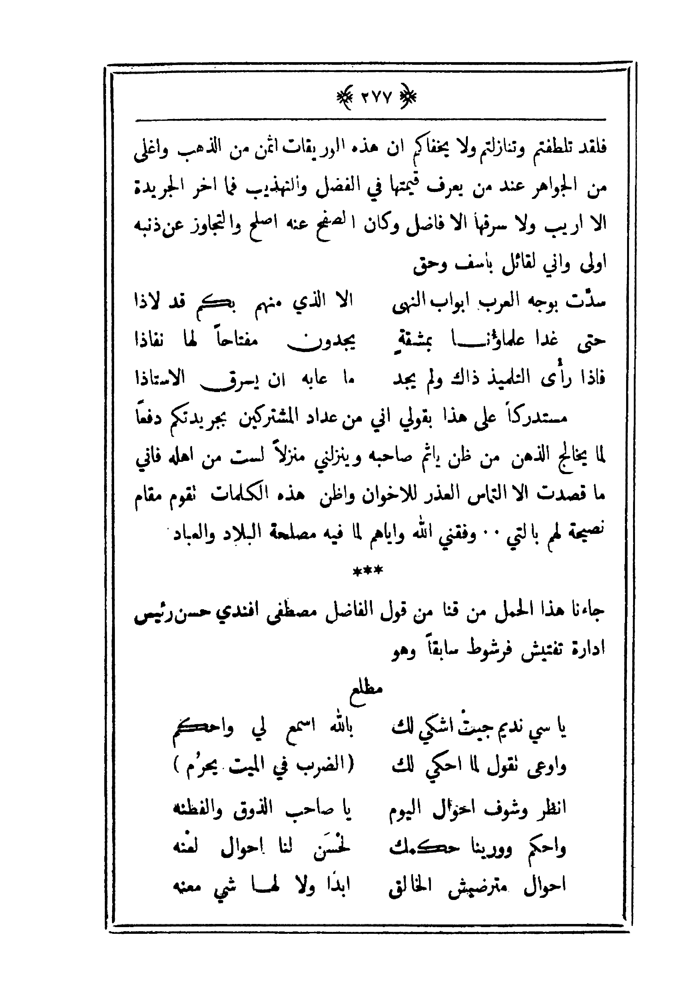 فقد تلطفتم وتنازلتم ولا يخفاكم إن هذه الوريقات أثمن من الذهب وأغلى من الجواهر عند من يعرف قيمتها في الفضل والتهذيب فما أخر الجريدة إلا أريب ولا سرقها إلى فاضل وكان الصفح عنه أصلح والتجاوز عن ذنبه أولى وإني لقائل بأسف وحق