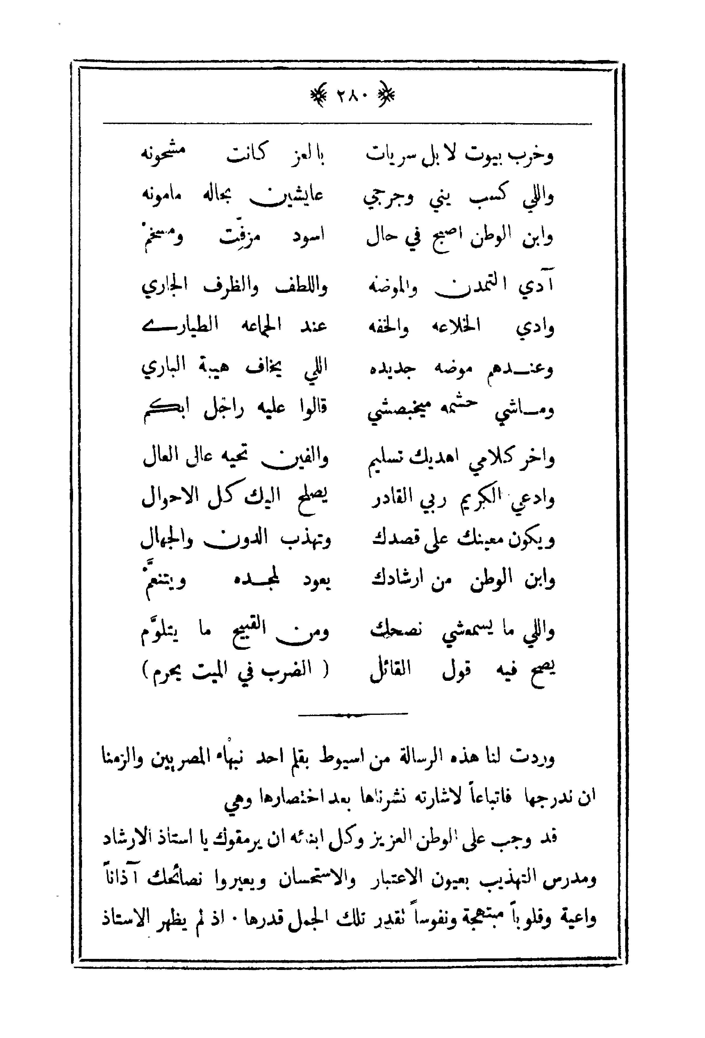 قد وجب على الوطن العزيز وكل أبنائه أن يرمقوك يا أستاذ الإرشاد ومدرس التهذيب بعيون الاعتبار والاستحسان ويعيروا نصائحك آذااً واعية وقلوباً مبتهجة ونفوساً تقدر تلك الجمل قدرها. إذ لم يظهر الأستاذ