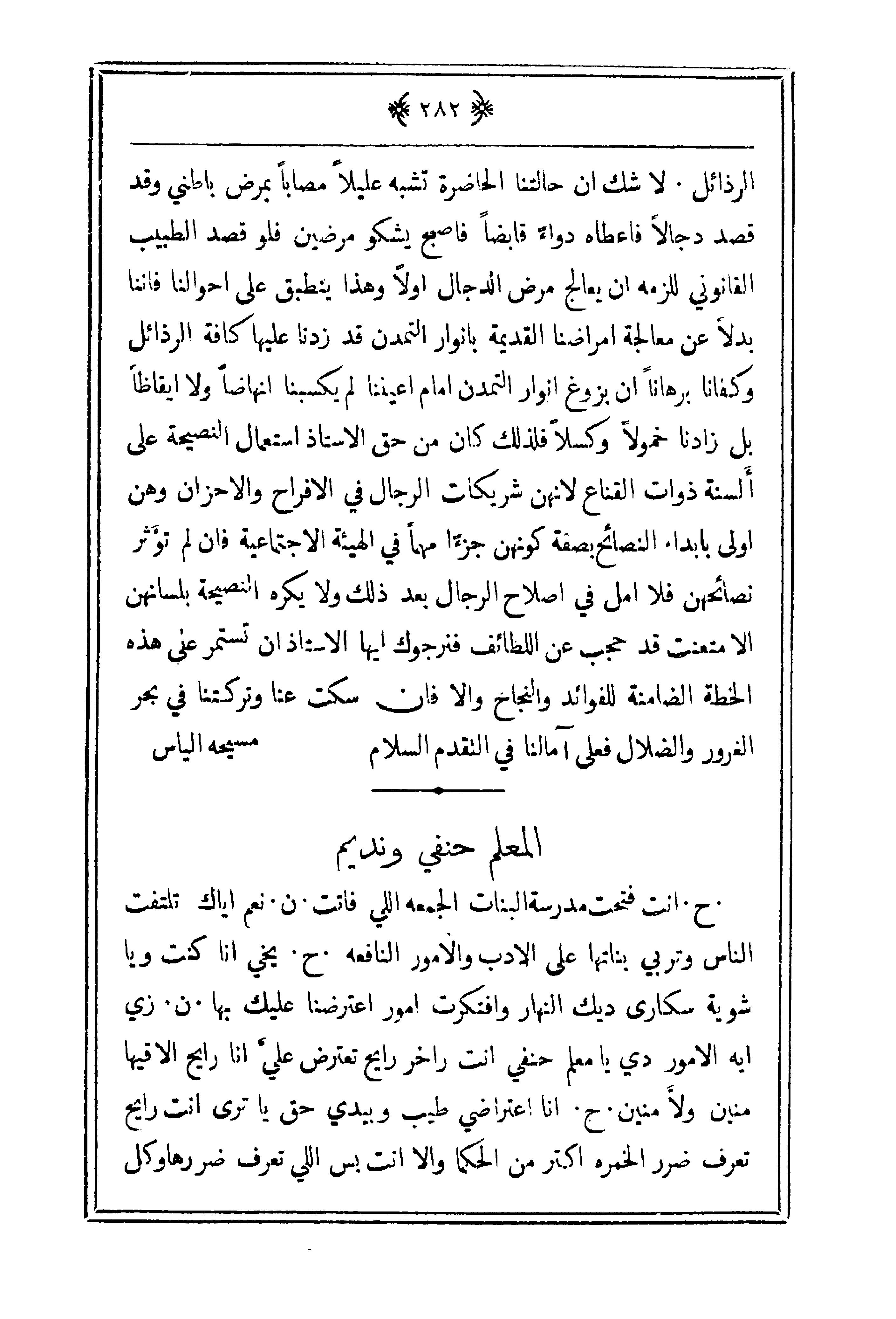 أعيننا لم يكسبنا انهاضاً ولا إيقاظاً بل زادنا خمولاً وكسلاً فلذلك كان من حق الأستاذ استعمال النصيحة على ألسنة ذوات القناع لأنهن شريكات الرجال في الأفراح والأحزان وهن أولى بابداء الصائح كونهن جزءاً مهماً في الهيئة الاجتماعية فإن لم تؤثر نصائحهن فلا أمل في إصلاح الرجال بعد ذلك ولا يكره الصيحة بلسانهن إلا متعنت قد حجب عن اللطائف فنرجوك أيها الأستاذ أتستمر على هذه الخطة الضامنة للفوائد والنجاح وإلا فإن سكت عنا وتركتنا في بحر الغرور والضلال فعلى آمالنا في التقدم السلام