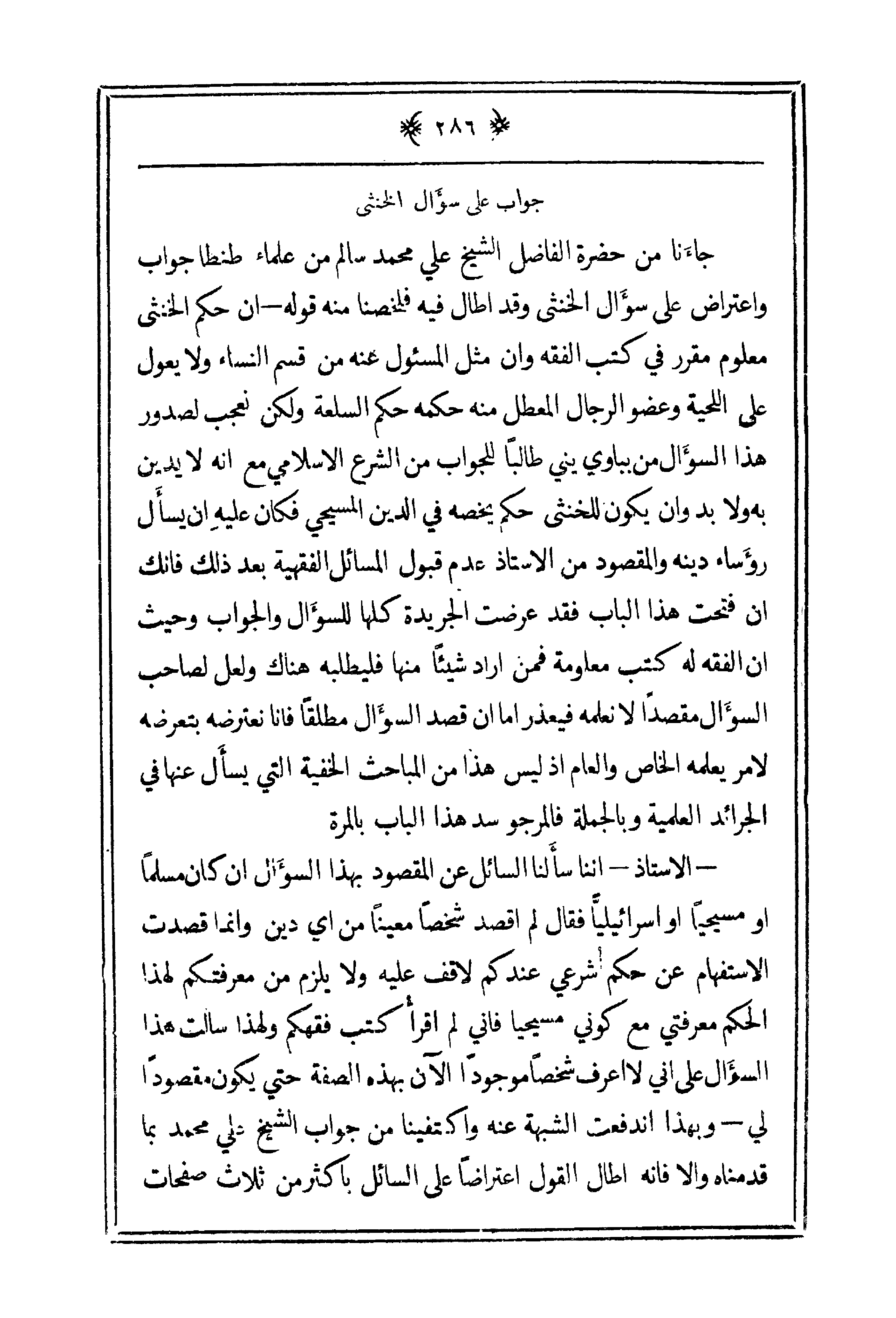 ـ الأستاذ ـ اننا سأّلنا السائل ع المقصود بهذا السؤال إن كان مسلماً أو مسيحياً أو اسرائيلياً فقال لم أقصد شخصاً معيناً من أي دين وإنما قصدت الاستفهام ع حكم شرعي عندكم لاقف عليه ولا يلزم من معرفتكم لهذا الحكم معرفتي مع كوني مسيحياً فإني لم اقرأ كتب فقهكم ولهذا سالت هذا السؤال على أني لا أعرف شخصاً موجوداً الآن بهذه الصفة حتى يكون مقصوداً لي ـ وبهذا اندفعت الشبهة عنه واكتفينا من جواب الشيخ علي محمد بما قدمناه وإلا فإنه اطال القول اعتراضاً على السائل باكثر من ثلاث صفحات
