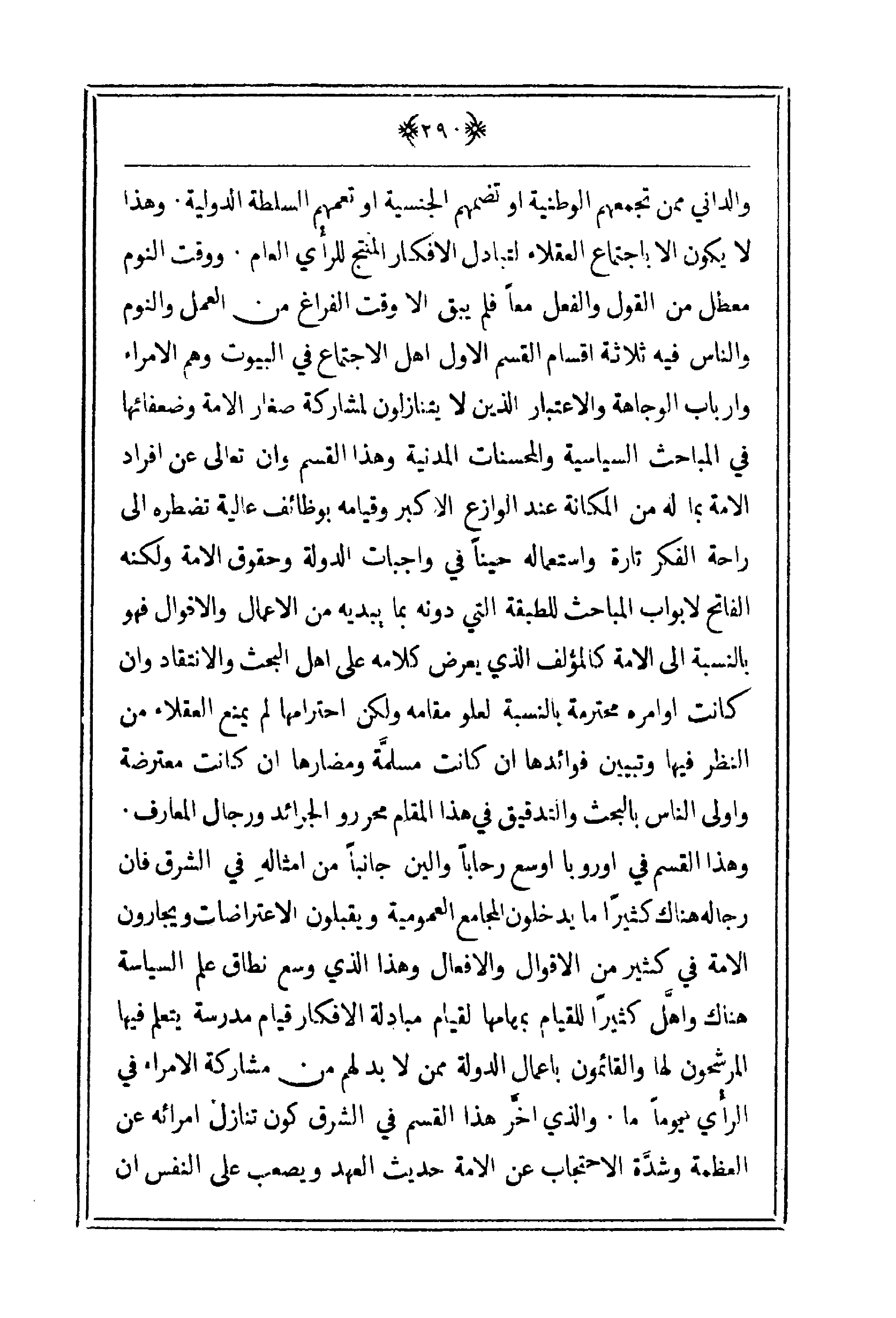 والداني ممن تجمعهم الوطنية أو تضمهم الجنسية او تعمهم السلطة الدولية. وهذا لا يكون إلا باجتماع العقلاء لتبادل الأفكار المنتج للرأي العام. ووقت النوم والناس فيه ثلاثة أقسام القسم الأول أهل الاجتماع في البيوت وهم الأمراء وأرباب الوجاهة والاعتبار الذي لا يتنازلون لمشاركة صغار امة وضعفائها في المباحث السياسية والمحسنات المدنية وهذا القسم وإن تعالى عن أفراد الأمة بما له من المكانة عند الوازع الأكبر وقيامه بوظائف عالية تضطره إلى راحة الفكر تارة واستعماله حيناً في واجبات الدولة وحقوق الأمة ولكنه الفاتح لأبواب المباحث للطبقة التي دونه بما يبديه من الأعمال والأقوال فهو بالنسبة إلى الأمة كالمؤلف الذي يعرض كلامه على أهل البحث والانتقاد وإن كانت أوامره محترمة بالنسبة لعلو مقامه ولكن احترامها لم يمنع العقلاء من النظر فيها وتبين فوائدها إن كانت مسلمَّة ومضارها إن كانت معترضة وأولى الناس بالبحث والتدقيق في هذا المقام محروو الجرائد ورجال المعارف. وهذا القسم في أوروبا أوسع رحاباً والي جانباً من أمثاله في الشرق فإن رجاله هناك كثيراً ما يدخلون المجامع العمومية ويقبلون الاعتراضات ويجارون الأمة في كثير من الأقوال والأفعال وهذا الذي وسع نطاق علم السياسة هناك واهَّل كثيراً للقيام بمهامها لقيام مبادلة الأفكار قيام مدرسة يتعلم فيها المرشحون لها والقائمون بأعمال الدولة ممن لابد لهم من مشاركة الأمراء في الرأي يوماً ما. والذي اخَّر هذا القسم في الشرق كون تنازل امرائه عن العظمة وشدَّة الاحتجاب عن