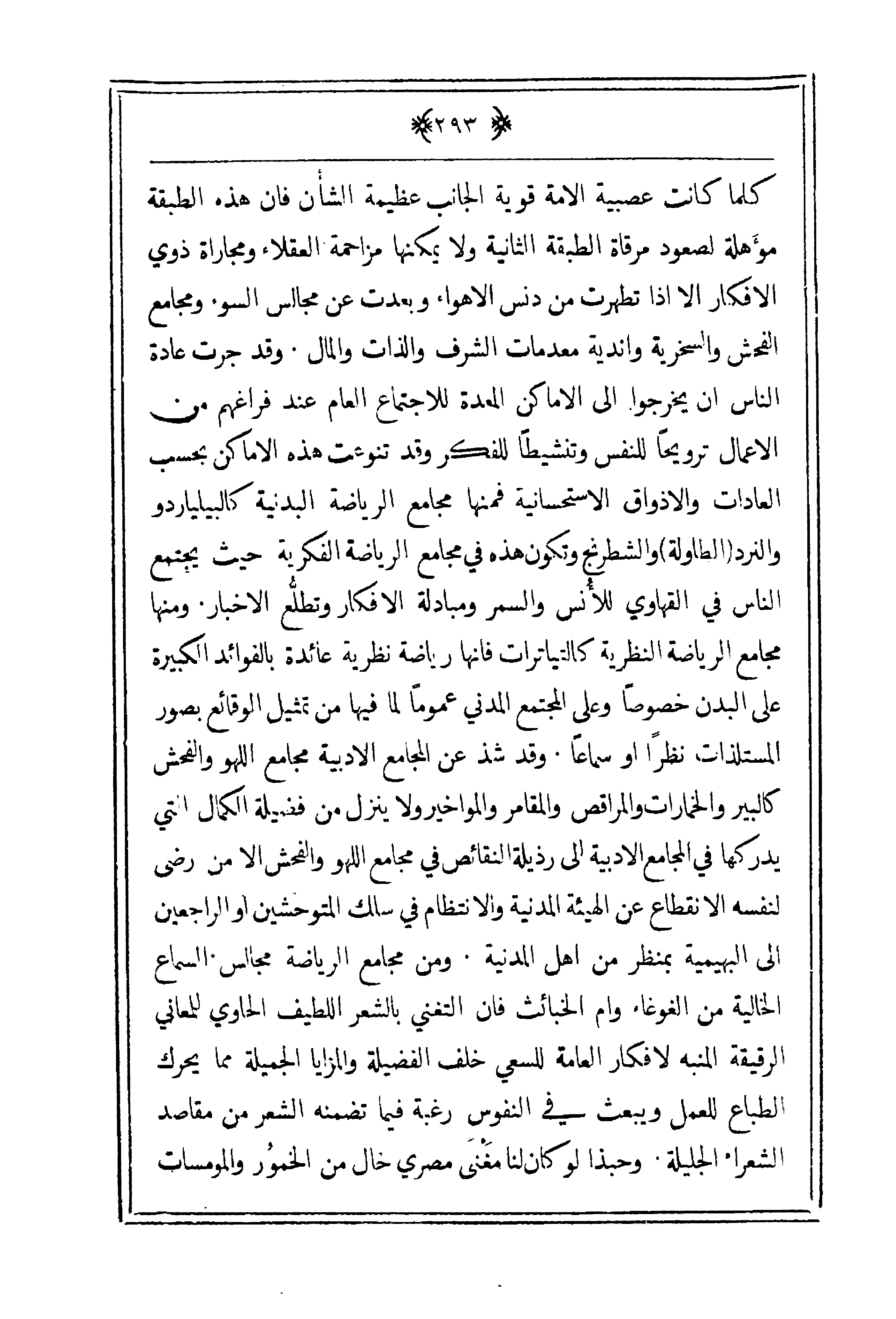 كلما كانت عصبية الأمة قوية الجانب عظيمة الشأن فإن هذه الطبقة مؤهلة لصعود مرقاة الطبقة الثانية ولا يمكنها مزاحمة العقلاء ومجاراة ذوي الأفكار إلا إذا تطهرت من دنس الأهواء وبعدت عن مجالس السوء ومجامع الفحش والسخرية واندية معدمات الشرف والذات والمال. وقد جرت عادة الناس إن يخرجوا إلى الأماكن المعدة للاجتماع العام عند فراغهم من الأعمال ترويحاً للنفس وتنشيطاً للفكر وقد تنوعت هذه الأماكن بحسب العادات والأذواق الاستحسانية فمنها مجامع الرياضة البدنية كالبيلياردو والنرد (الطاولة) والشطرنج وتكون هذه في مجامع الرياضة الفكرية حيث يجتمع الناس في القهاوي للأنس والسمر ومبادلة الأفكار وتطلع الأخبار ومنها مجامع الرياضة النظرية كالتياترات فإنها رياضة نظرية عائدة بالفوائد الكبيرة على البدن خصوصاً وعلى المجتمع الداني عموماً لما فيها من تمثيل الوقائع بصور المستلذات نظراً او سماعاً. وقد شذ عن المجامع الأدبية مجامع اللهو والفحش كالبير والخمارات والمراقص والمقامر والمواخير ولا ينزل من فضيلة الكمال التي يدركها في المجامع الأدبية إلى رذيلة النقائص في مجامع اللهو والفحش إلا من رضى لنفسه الانقطاع عن الهيئة المدنية والانتظام في سلك المتوحشين أو الراجعين إلى البهيمية بمنظر من أهل المدينة. ومن مجامع الرياضة مجالس السماع الخالية من الغوغاء وأم الخبائث فإن التغني بالشعر اللطيف الحاوي للمعاني الرقيقة