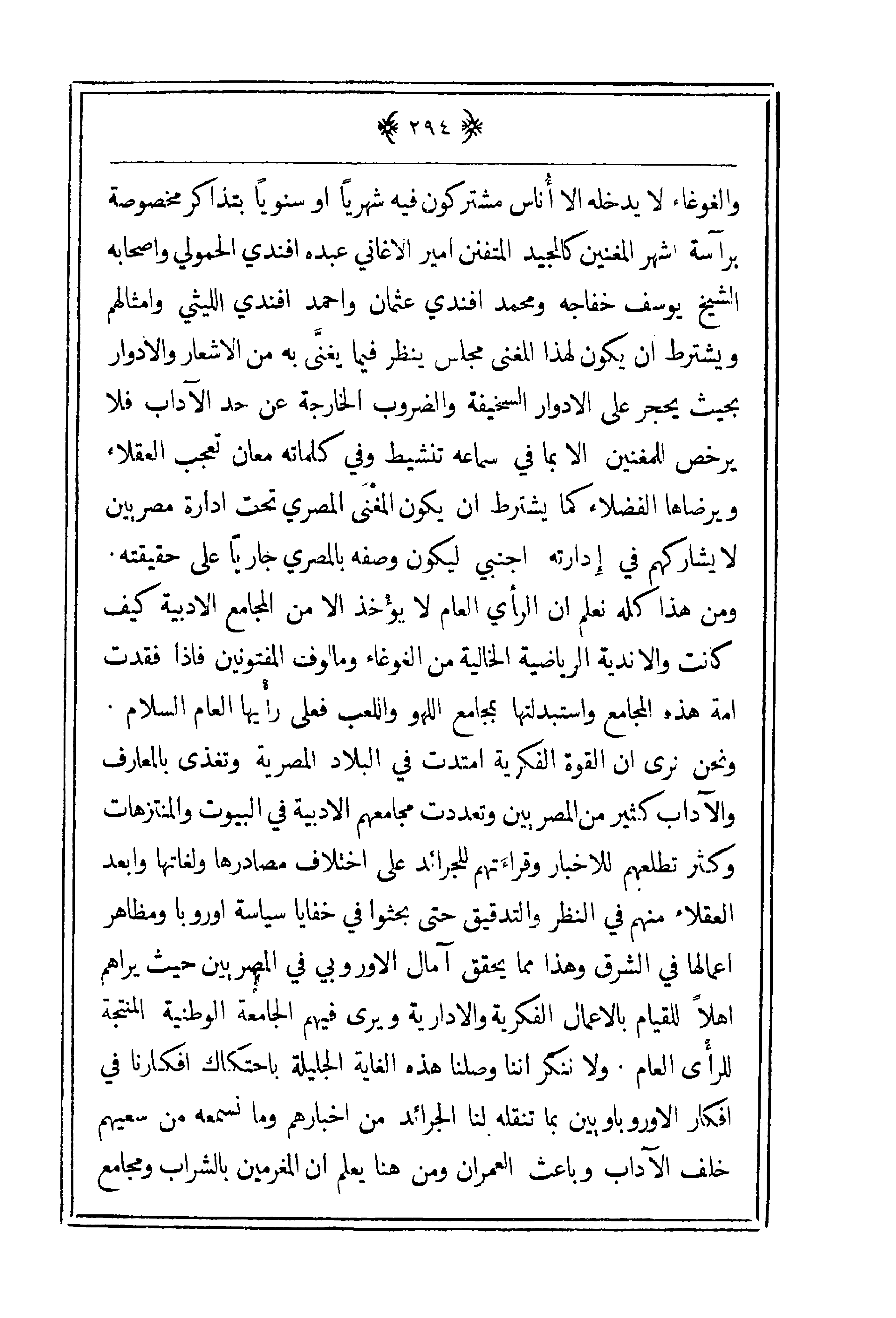 والغوغاء لا يدخله إلا أناس مشتركون فيه شهرياً أو سنوياً بتذاكر مخصوصة برآسة أشهر المغنين كالمجيد المتفنن أمير الأغاني عبده أفندي الحمولي وأصحابه الشيخ يوسف خفاجة ومحمد أفندي عثمان وأحمد أفندي الليثي وأمثالهم ويشترط أن يكون لهذا المغنى مجلس ينظر فيما يغنَّى به من الأشعار والأدوار بحيث يحجر على الأدوار السخيفة والضروب الخارجة عن حد الآداب فلا يرخص للمغني إلا بما في سماعه تنشيط وفي كلماته معان تعجب العقلاء ويرضاها الفضلاء كما يشترط أن يكون المغني المصري تحت إدارة مصريين لا يشاركهم في إدارته أجنبي ليكون وصفه بالمصري جارياً على حقيقته ومن هذا كله نعلم أن الرأي العام لا يؤخذ إلا من المجامع الأدبية كيف كانت هذه المجامع واستبدلتها بمجامع اللهو واللعب فعلى رأيها العام السلام. ونحن نرى أن القوة الفكرية امتدت في البلاد المصرية وتغذى بالمعارف والآداب كثير من المصريين وتعددت مجامعهم الأدبية في البيوت والمنتزهات وكثر تطلعهم للأخبار وقراءتهم للجرائد على اختلاف مصادرها ولغاتها وأبعد العقلاء منهم في النظر والتدقيق حتى بحثوا في خفايا سياسية أوروبا ومظاهر أعمالها في الشرق وهذا مما يحقق آمال الأوروبي في المصريين حيث يراهم أهلاً للقيام بالأعمال الفكرية والإدارية ويرى فيهم الجامعة الوطنية المنتجة للرأي العام. ولا نكر أننا وصلنا هذه الغاية الجليلة باحتكاك أفكارنا في أفكار الأوروباويين بما تنقله لنا الجرائد من أخبارهم وما سمعه من سعيهم خلف الآداب وباعث العمران ومن هنا يعلم أالمغرمين بالشراب ومجامع
