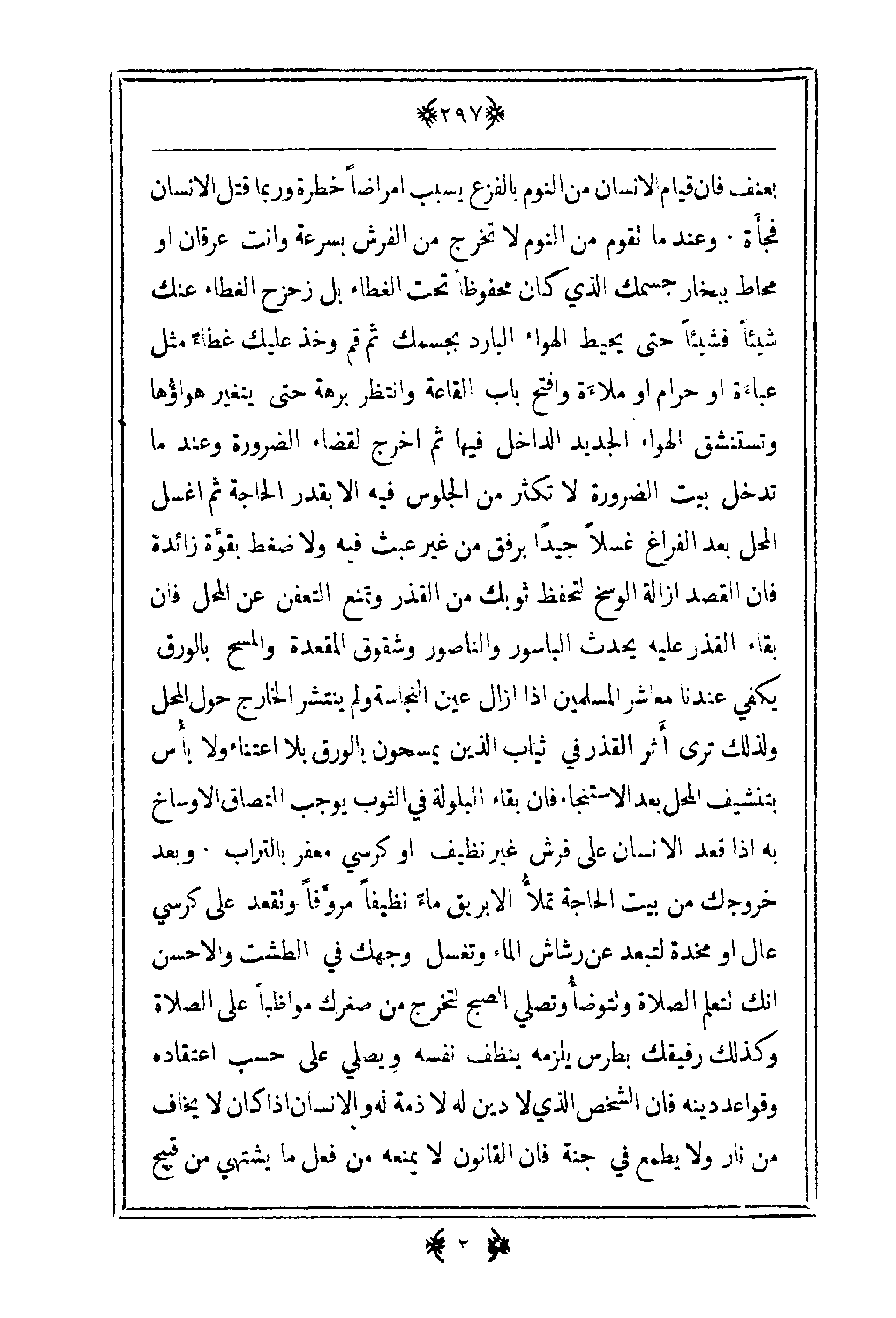 بعنف فإن قيام الإنسان من النوم بالفزع يسبب أمراضاً خطرة وربما قتل الإنسان فجأة. وعندما تقوم من النوم لا تخرج من الفرش بسرعة وأنت عرقا أو محاط ببخار جسمك الذي كان محفوظاً تحت الغطاء بل زحزح الغطاء عنك شيئاً فشيئاً حتى يحيط الهواء البارد بجسمك ثم قم وخذ عليك عطاءً مثل عباؤة أو حرام أو ملاءة وافتح باب القاعة وانتظر برهة حتى يتغير هواؤها وتستنشق الهواء الجديد الداخل من الجلوس فيه الا بقدر الحاجة ثم اغسل المحل بعد الفراغ غسلاً جيداً برفق من غير عبث فيه ولا ضغط بقوة زائدة فإن القصد إزالة الوسخ لحفظ ثوبك من القذر وتمنع التعفن عن المحل فإن بقاء القذر عليه يحدث الباسور والناصور وشقوق المقعدة والمسح بالورق يكفي عندنا معاشر المسلمين إذا ازال عين النجاسة ولم ينتشر الخارج حول المحل ولذلك ترى أثر القذر في ثياب الذين يمسحون بالورق بلا اعتناء ولا بأس يتنشيف المحل بعد الاستنجاء فإن بقاء البلولة في الثوب يوجب التصاق الأوساخ به إذا قعد الإنسان على فرش غير نظيف أو كرسي معفر بالتراب. وبعد خروجك من بيت الحاجة تملأُ الإبريق ماءً نظيف مروفاً وتقعد على كرسي عال او مخدة لتبعد عن رشاش الماء وتغسل وجهك في الطشت والحسن أنك تتعلم الصلاة وتتوضأ وتصلي الصبح لتخرج من صغرك مواظباً على الصلاة وكذلك رفيقك بطرس يلزمه ينظف نفسه ويصلي على حسب اعتقاده وقواعد دينه فإن الشخص الذي لا دين له لا ذمة له والإنسان إذا كان لا يخاف من نار ولا يطمع في جنة فإن القانون لا يمنعه من فعل ما يشتهي من قبيح