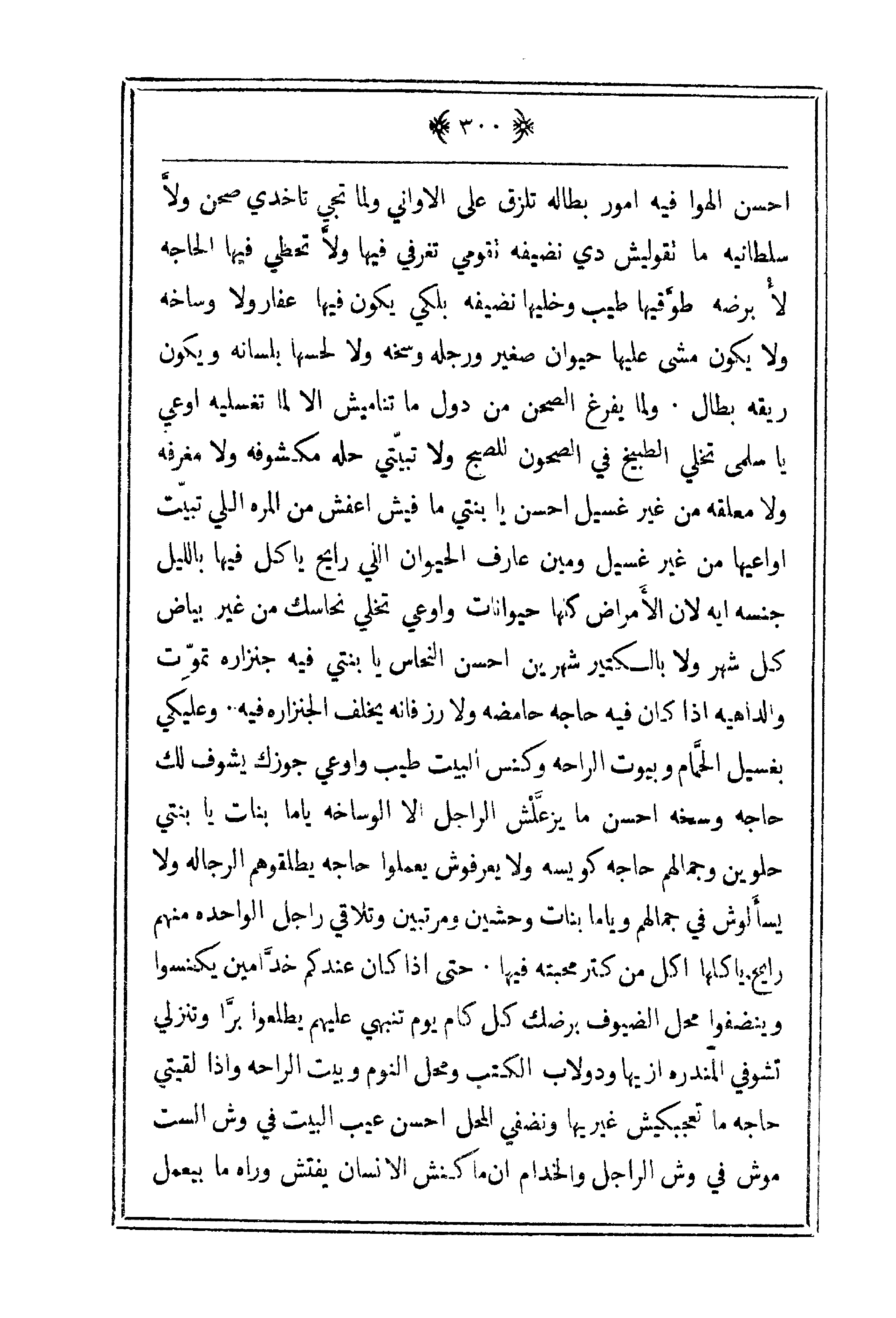 احسن الهواء فيه أمور بطاله تلزق على الأواني ولما تجي تاخذي صحن ولاَّ سلطانية ما تقوليش دي نضيفه تقومي تغرفي فيها ولا تحطي فيها الحاجة لا برضه طوَّقيها طيب وخليها نضيفة بلكي يكون فيها عفارة ولا وساخة ولا يكون مشي عليها حيوان صغير ورجله وسخة ولا لحسها بلسانه ويكون ريقه بطال. ولما يفرغ الصحن من دول ما تناميش إلا لما تغسليه أوعي يا سلمى تخلي الطبيخ في الصحو للصبح ولا تبيتي حله مكشوفة ولا مغرفة ولا معلقة من غير غسيل احسن يا بنتي ما فيش اعفش من المرة اللي تبيت أواعيها من غير غيسل ومن عارف الحيوان اللي رايح يأكل فيها بالليل جنسه ايه لأن الأمراض كلها حيوانات وأواعي تخلي نحاسك من غير بياض كل شهر ولا بالكتير شهرين احسن النحاس يا بنتي فيه جنزاره تموت والداهية إذا كان فيه حاجة وسخة احسن ما يزعَّلش الراجل إلا الوساخة ياما بنات يا بنتي حلوين وجمالهم وياما بنات وحشين ومرتبين وتلاقي راجل الواحدة منهم رايح ياكلها اكل من كتر محبته فيها. حتى إذا كان عندكم خدّامين يكنسوا وينضفوا محل الضيوف برضك كل كم يوم تنتبهي عليهم يطعلوا برّضا وتنزلي تشوفي المندرة ازيها ودولاب الكتب ومحل النوم وبيت الراحة وإذا لقيتي حاجة ما تعجبكيش غيريها ونضفي المحل احسن عيب البت في وش الست موش في وش الراجل والخدام إن كا كنش الإسان بفتش وراه ما بيعمل