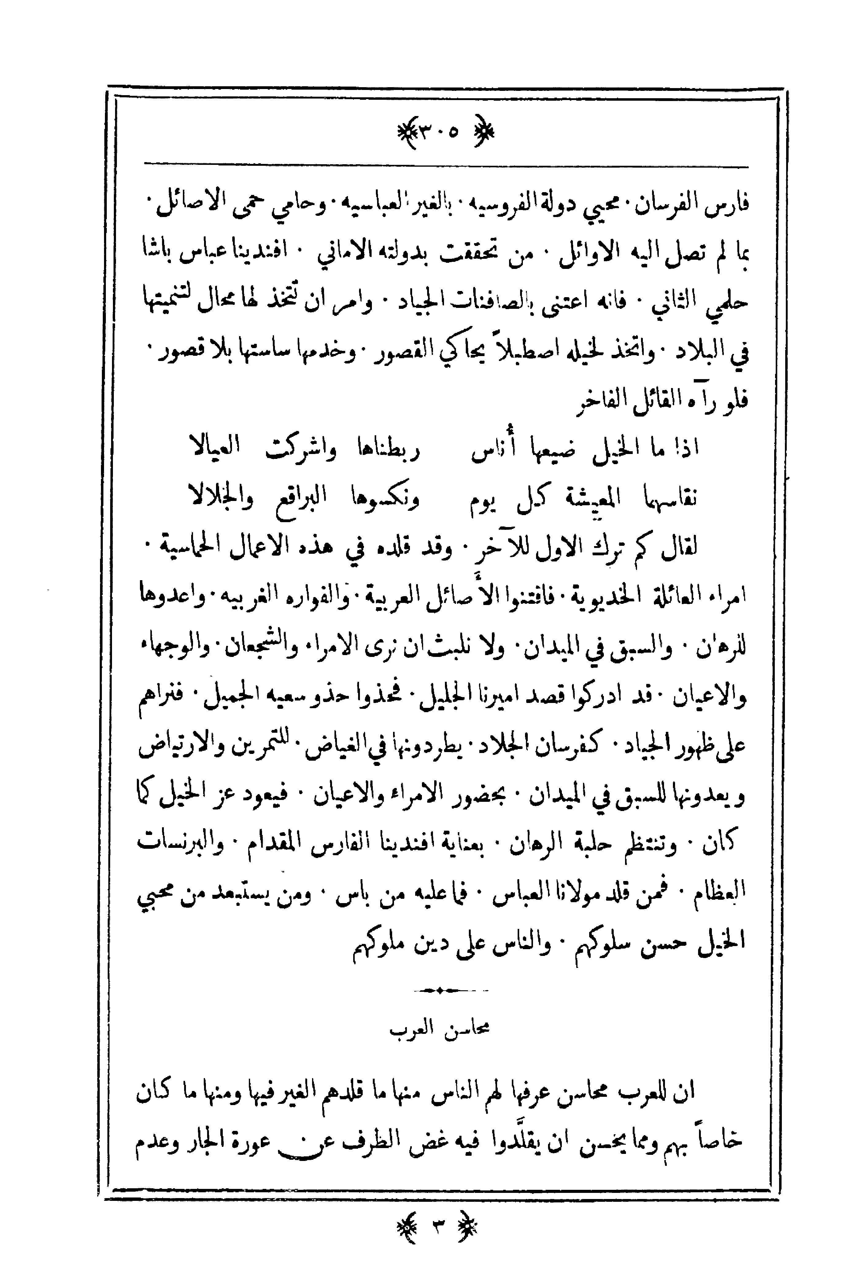 لقال كم ترك الأول للآخر. وقد قلده في هذه الأعمال الحماسية. امراء العائلة الخديوية. فافتنوا الأصائل العربية. والفواره الغربية. واعدوها للرهان. والسبق في الميدان. ولا نلبث أن نرى الامرا والشجعان. والوجهاء والاعيان. قد ادركوا قصد أميرنا الجليل. فحذوا حذو سعيه الجميل. فنراهم على ظهور الجياد. كفرسان الجلاد. يطردونها في الغياض. للتمرين والارتياض ويعدونها للسبق في الميدان. بحضور الأمراء والأعيان. فيعود عز الخيل كما كان. وتنتظم حلبة الرهان. بعناية افندينا الفارس باس. ومن يستبعد من محبي الخيل حسن سلوكهم. والناس على دين ملوكهم.