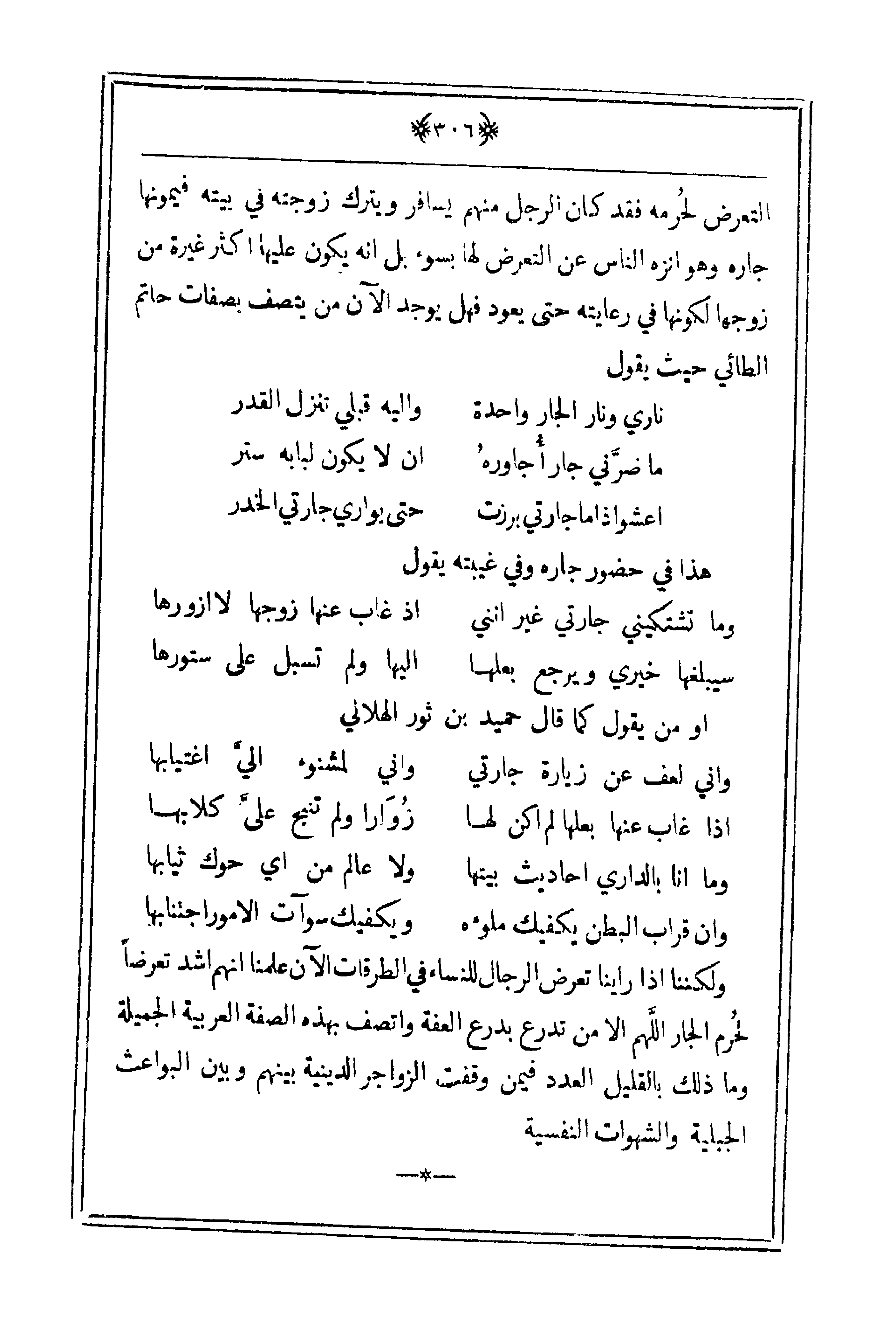 ولكننا إذا رأينا تعرض الرجال للنساء في الطرقات الآن علمنا أنهم أشد تعرضاً لحُرم الجار اللَّهم الا من تدرع بدرع العفة واتصف بهذه الصفة العربية الجميلة وما ذلك بالقليل العدد فيمن وقفت الزواجر الدينية بينهم وبين البواعث الجبلية والشهوات النفسية.