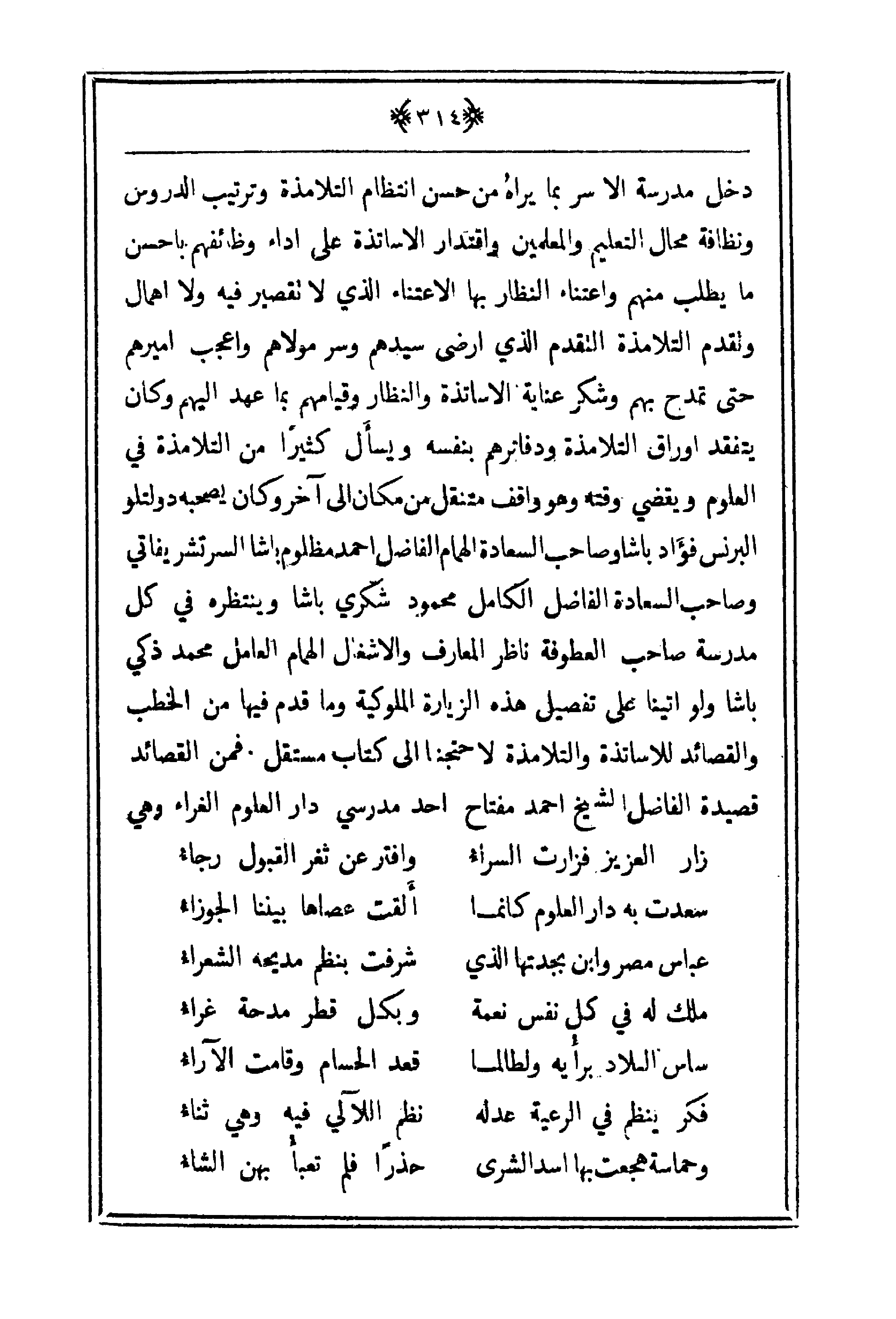 دخل مدرسة الأسر بما يراهُ من حسن انتظام التلامذة وترتيب الدروس ونظافة محال التعليم والمعلمين واقتدار الأساتذة على أداء وظائفهم بأحسن ما يطلب منهم واعتناء النظار بها الاعتناء الذي لا تقتصير فيه ولا إهمال ولقدم التلامذة التقدم الذي أرضى سيدهم وسر مولاهم وأعجب أميرهم حتى تمدح بهم وشكر عناية الأساتذة والنظار وقيامهم بما عهد إليهم وكان يتفقد أوراق التلامذة ودفاترهم بنفسه ويسأل كثيراً من التلامذة في العلوم ويقضي وقته وهو واقف مشتغل من مكان إلى آخر وكان يصبحه دولتلو البرنس فؤاد باشا وصاحب السعادة الهمام الفاضل أحمد مظلوم باشا السرتشر يفاتي وصاحب السعادة الفاضل الكامل محمود شكري باشا وينتظره في كل مدرسة صاحب العطوفة ناظر المعارف والأشغال الهمام العامل محمد ذكي باشا ولو اتينا على تفصيل هذه الزيارة الملوكية وما قدم فيها من الخطب والقصائد للأساتذة والتلامذة لاحتجنا إلى كتاب مستقل فمن القصائد قصيدة الفاضل الشيخ أحمد مفتاح أحد مدرسي دار العلوم الغراء وهي