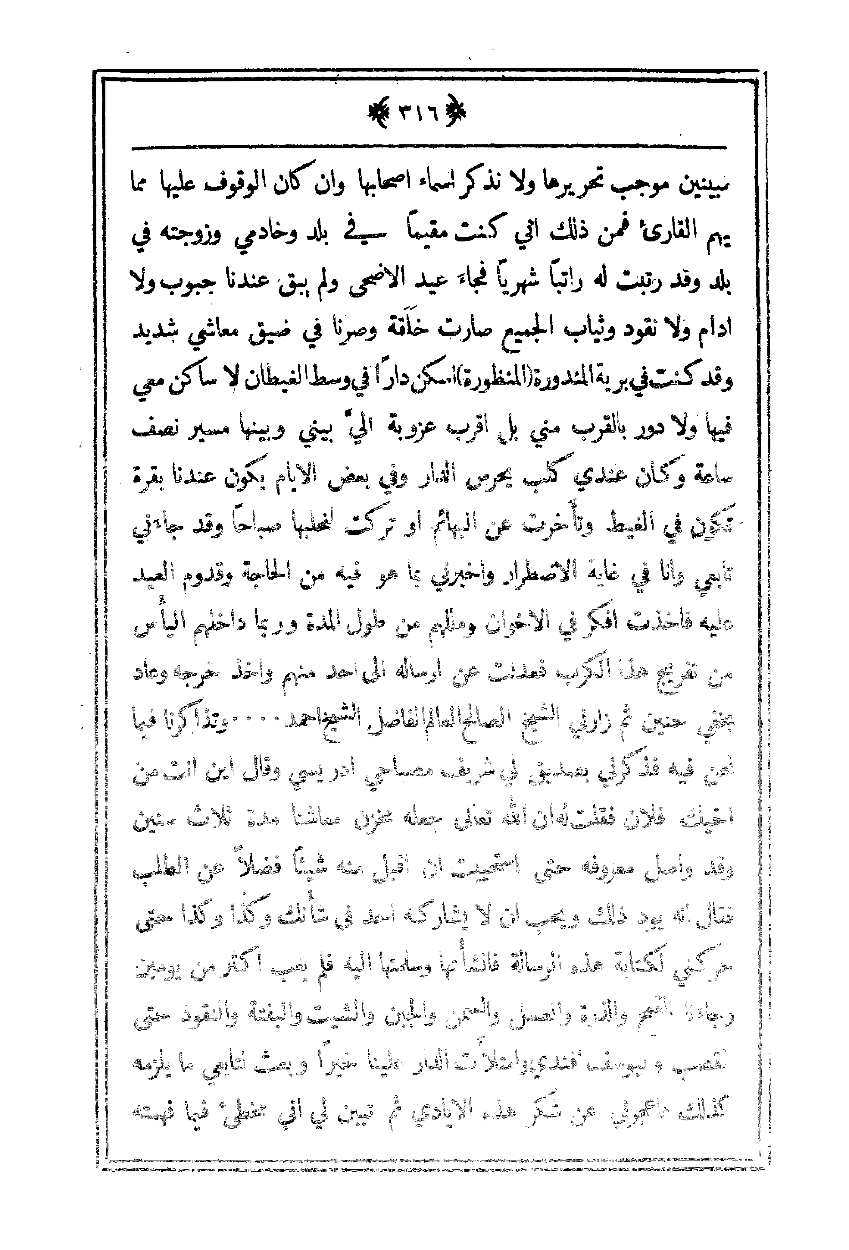 مبينين موجب تحريرها ولا نذكر أسماء أصحابها وإن كان الوقوف عليها مما يهم القارئ فمن ذلك أني كنت مقيماً في بلد وخادمي وزوجته في بلد وقد رتبت له راتباً شهرياً فجاء عيد الأضحى ولم يبقى عندنا جبوب ولا أدام ولا نقود وثياب الجميع صارت خلقة وصرنا في ضيق معاشي شديد وقد كنت في برية المندورة (المنظورة) اسكن داراً في وسط الغيطان لا ساكن معي فيها ولا دور بالقرب مني بل اقرب عزوبة إليَّ بيني وبينها مسير نصف ساعة وكان عندي كلي يحرس الدار وفي بعض الأيام يكون عندنا بقرة تكون في الغيط وتأخرت عن البهائم أتركت لنحلبها صباحاً وقد جاءني تابعي وأنا في غاية الاضطرار وأخبرني بما هو فيه من الحاجة وقدوم العيد عليه فأخذت افكر في الأخوان ومللهم من طول المدة وربما داخلهم اليأُس من تفريج هذا الكرب فعدلت عن إرساله إلى أحد منهم وأخذ خرجه وعاد يخفي حنين ثم زارني الشيخ الصالح العالم الفاضل الشيخ أحمد. . . . وتذاكرنا فيما نحن فيه فذكرني بصديق لي شريف مصباحي ادريسي وقال أين أنت من أخيك فلان فقلت له أن الله تعالى جعله مخزن معاشنا مدة ثلاث سنين وقد واصل معروفه حتى استحييت أن اقبل منه شيئاً وكذا وكذا حتى حركني لكتابة هذه الرسالة فانشأتها وسلمتها إليه فلم يغب أكثر من يومين وجاءنا الفتح القمح والذرة والعسل والسمن والجنب والشيت والبفتة والنقود حتى القصب واليوسف افندي وامتلأت الداء علينا خيراً وبعث لتابعي ما يلزمه كذلك فاعجزني عن شكر هذه الأيادي ثم تبين لي أني مخطئ فيما فهمته