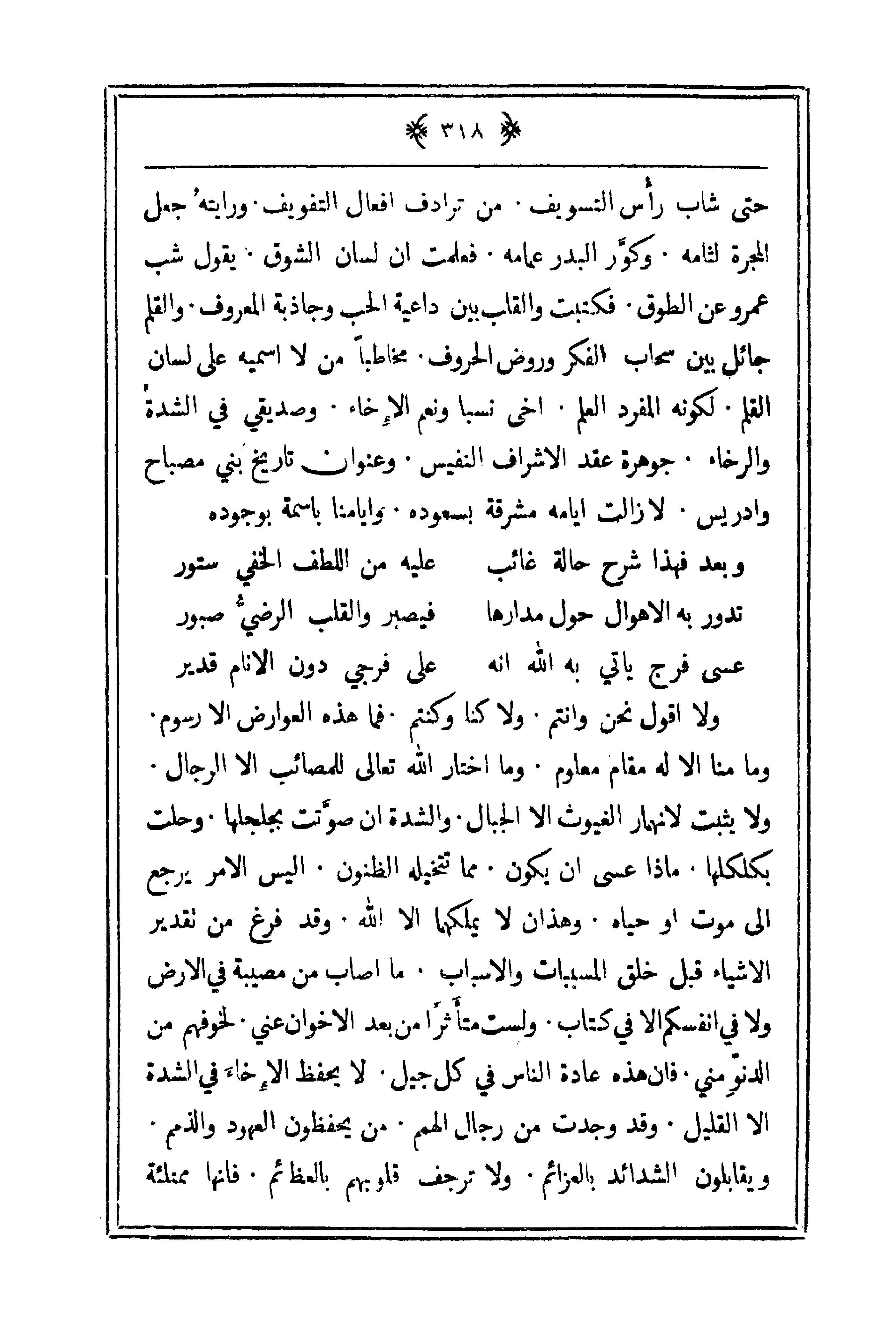 حتى شاب رأس التسويف. من ترادف أفعال التفويف. ورايتهُ جعل المجرة لثامة. وكوَّر البدر عمامة. فعلمت أن لسان الشوق يقول شب عمرو عن الطوق. فكتبت والقلب بين داعية الحب وجاذبة المعروف والقلم جائل بين سحاب الفكر وروض الحروف. مخاطباً من لا اسميه على لسان القلم. لكونه المفرد العلم. أخي نسبا ونعم الإخاء. وصديقي في الشدة والرخاء. جوهرة عقد الاشراف النفيس. وعنوان تاريخ بني مصباح وادريس. لإزالت أيامه مشرقة بسعوده وايامنا باسمة بوجوده