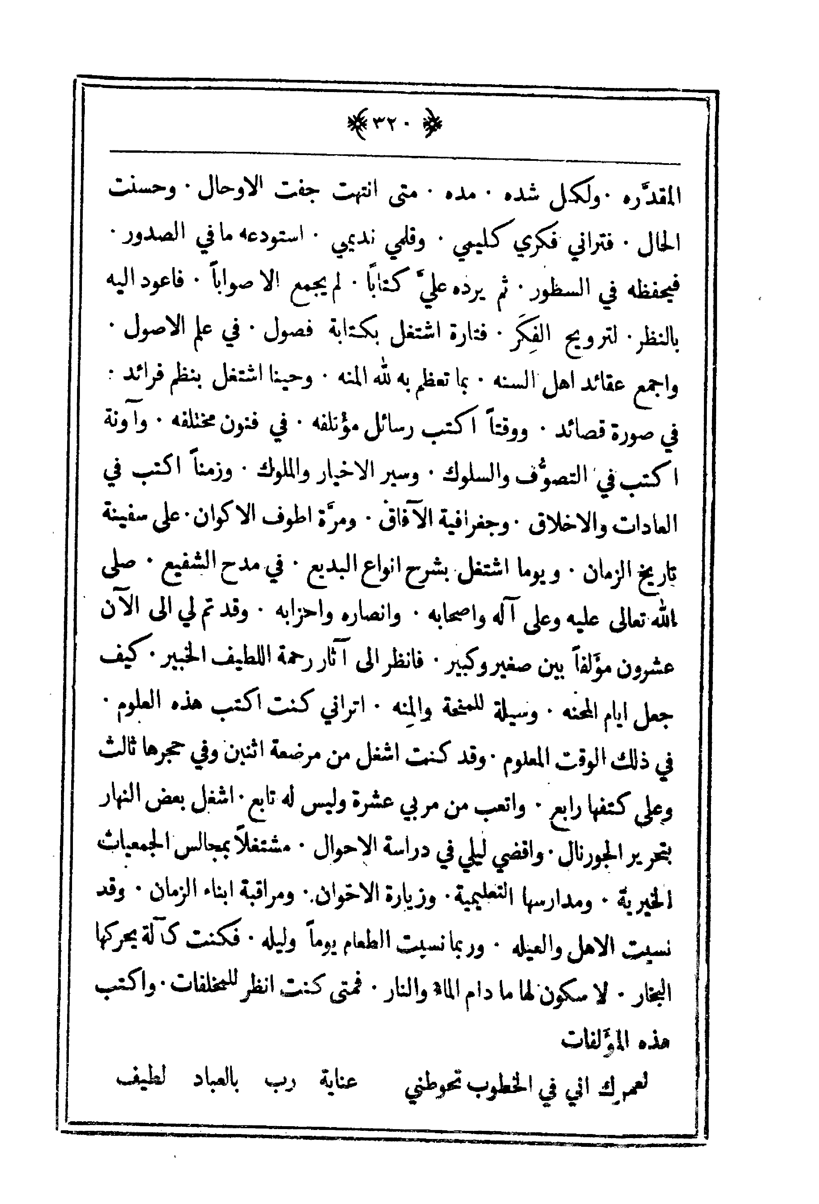 بشرح الأنواع البديع. في مدح الشفيع. صلى الله تعالى عليه وعلى آله واصحابه. وأنصاره وأحزابه. وقد تم لي إلا الآن عشرون مؤلفاً بين صغير وكبير. فانظر إلى آثار رحمة اللطيف الخبير. كيف جعل ايم المحتة. وسيلة للمنحة والمنة. اتراني كنت اكتب هذه العلوم. في ذلك الوقت المعلوم وقد كنت اشغل من مرضعة اثنين وفي حجرها ثالث وعلى كتفها رابع. واتعب من مربي عشر وليس له تابع. اشغل بعض النهار بتحرير الجورنال. واقضي ليلي في دراسة الأحوال. مشتغلاً بمجالس الجمعيات الخيرية. ومدارسها وزيارة الأخوان ومراقبة أبناء الزمان. وقد نسيت الأهل والعيله. وربما نسيت الطعام يوماً وليله. فكنت كآلة يحركها البخار. لا سكون لها مادا الماء والنار. فمتى كنت انظر للمخلفات. واكتب هذه المؤلفات