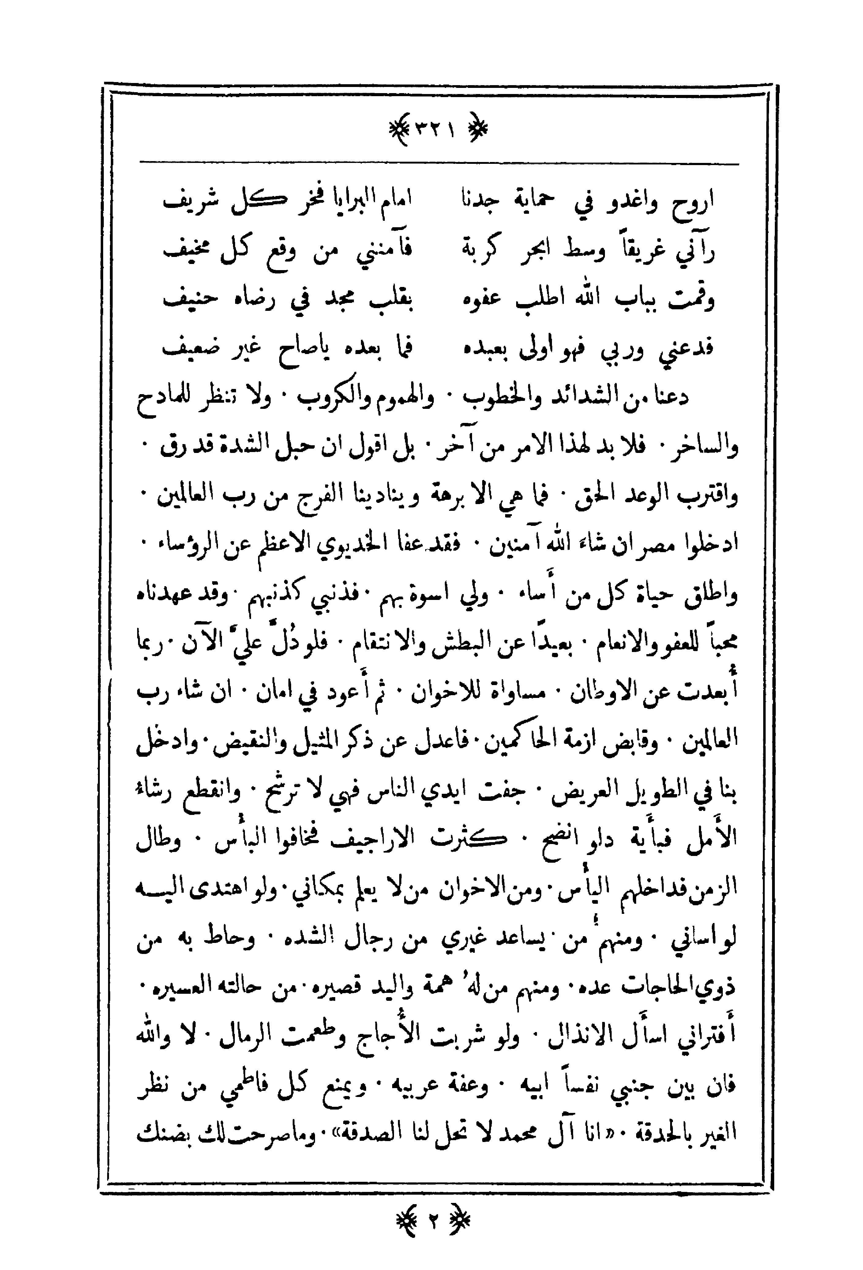 بين جنبي نفساً ابيه. وعفة عربية ويمنع كل فاطمي من نظر الغير بالحدقة. (أنا آل محمد لا تحل لنا الصدقة). وما صرحت لك بضنك