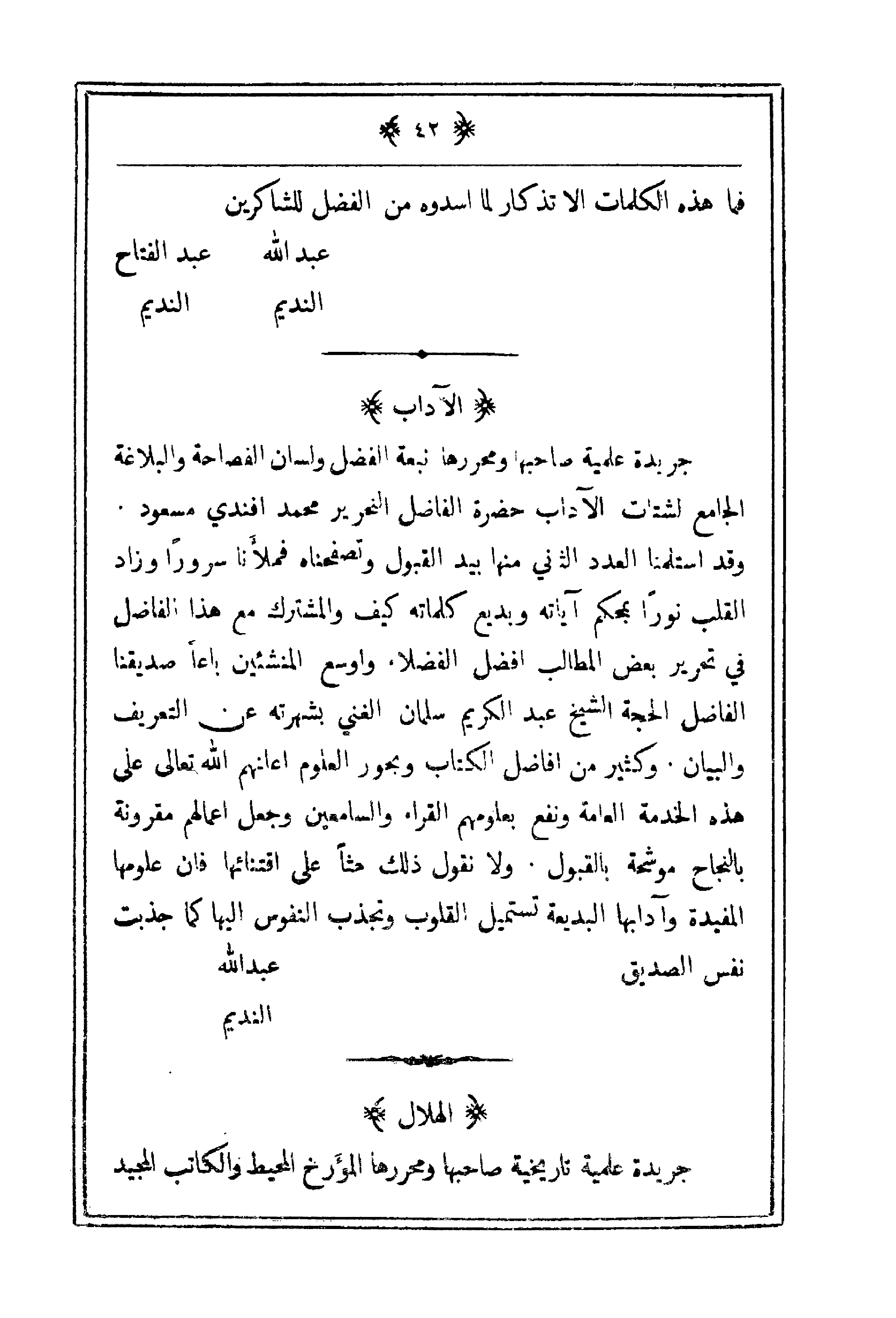 جريدة علمية صاحبها ومحررها نبعة الفضل ولسان الفصاحة والبلاغة الجامع لشتات الآداب حضرة الفاضل التحرير محمد أفندي مسعود. وقد استلمنا العدد الثاني منها بيد القبول وتصفحناه فملأنا سروراً وزاد القلب نوراً بمحكم آياته وبديع كلماته كيف والمشترك مع هذا الفاضل في تحرير بعض المطالب أفضل الفضلاء وأوسع المنشئين باعاً صديقنا الفاضل الحجة الشيخ عبد الكريم سلمان الغني بشهرته عن التعريف والبيان. وكثير من أفاضل الكتاب وبحور العلوم أعانهم الله تعالى على هذه الخدمة العامة ونفع بعلومهم القراء والسامعين وجعل أعمالهم مقرونة بالنجاح موشحة بالقبول. ولا نقول ذلك حثاً على اقتنائها فإن علومها المفيدة وآدابها البديعة تستميل القلوب وتجذب النفوس إليها كما جذبت نفس الصديق.