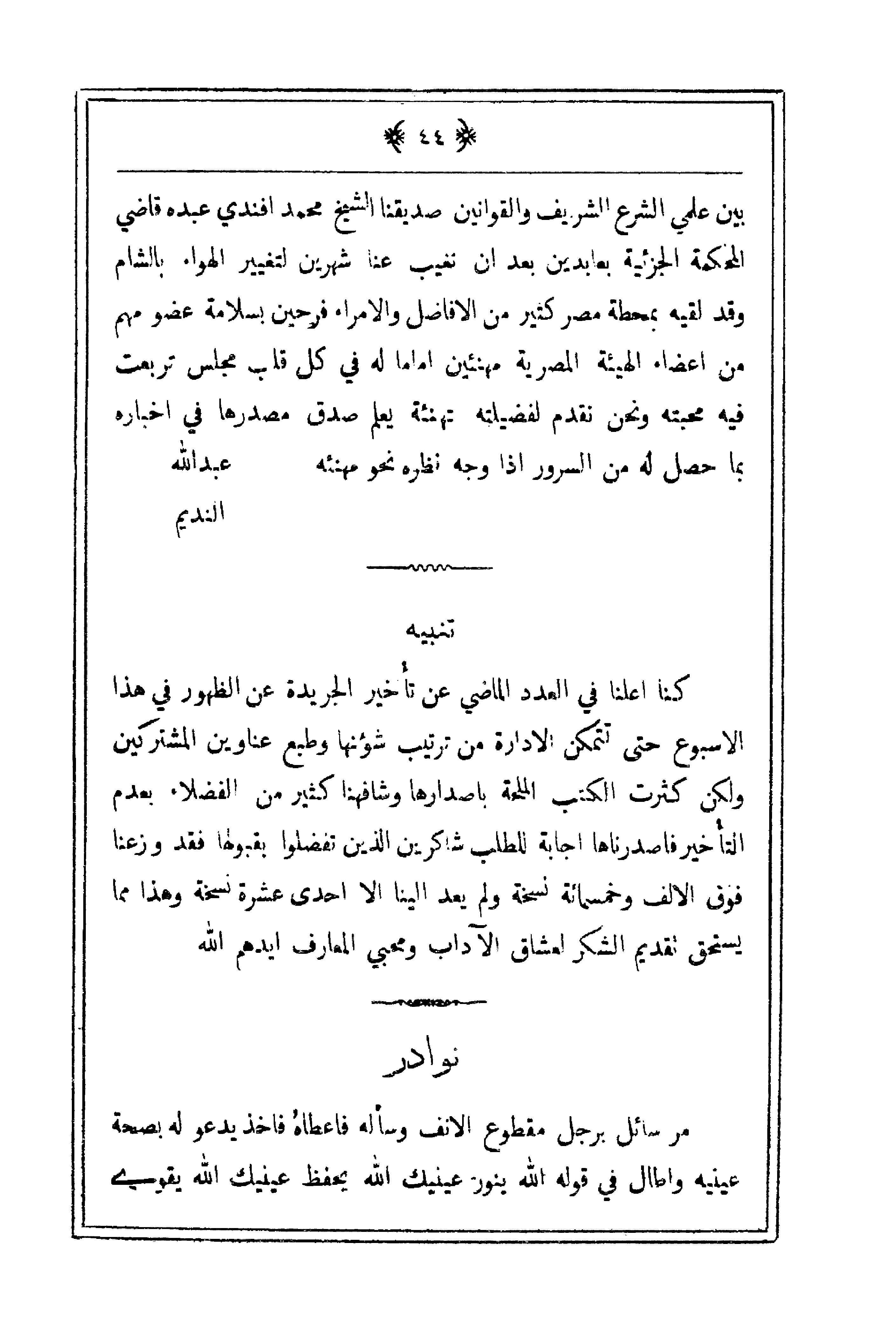 بين علمي الشرع الشريف والقوانين صديقنا الشيخ محمد أفندي عبده قاضي المحكمة الجزئية بعابدين بعد أن تغيب عنا شهرين لتغيير الهواء بالشام وقد لقيه بمحطة مصر كثير من الأفاضل والأمراء فرحين بسلامة عضو مهم من أعضاء الهيئة المصرية مهنئين إماماً له في كل قلب مجلس تربعت فيه محبته ونحن نقدم لفضيلته تهنئة يعلم صدق مصدرها في أخباره بما حصل له من السرور إذا وجه نظرة نحو مهنئه.