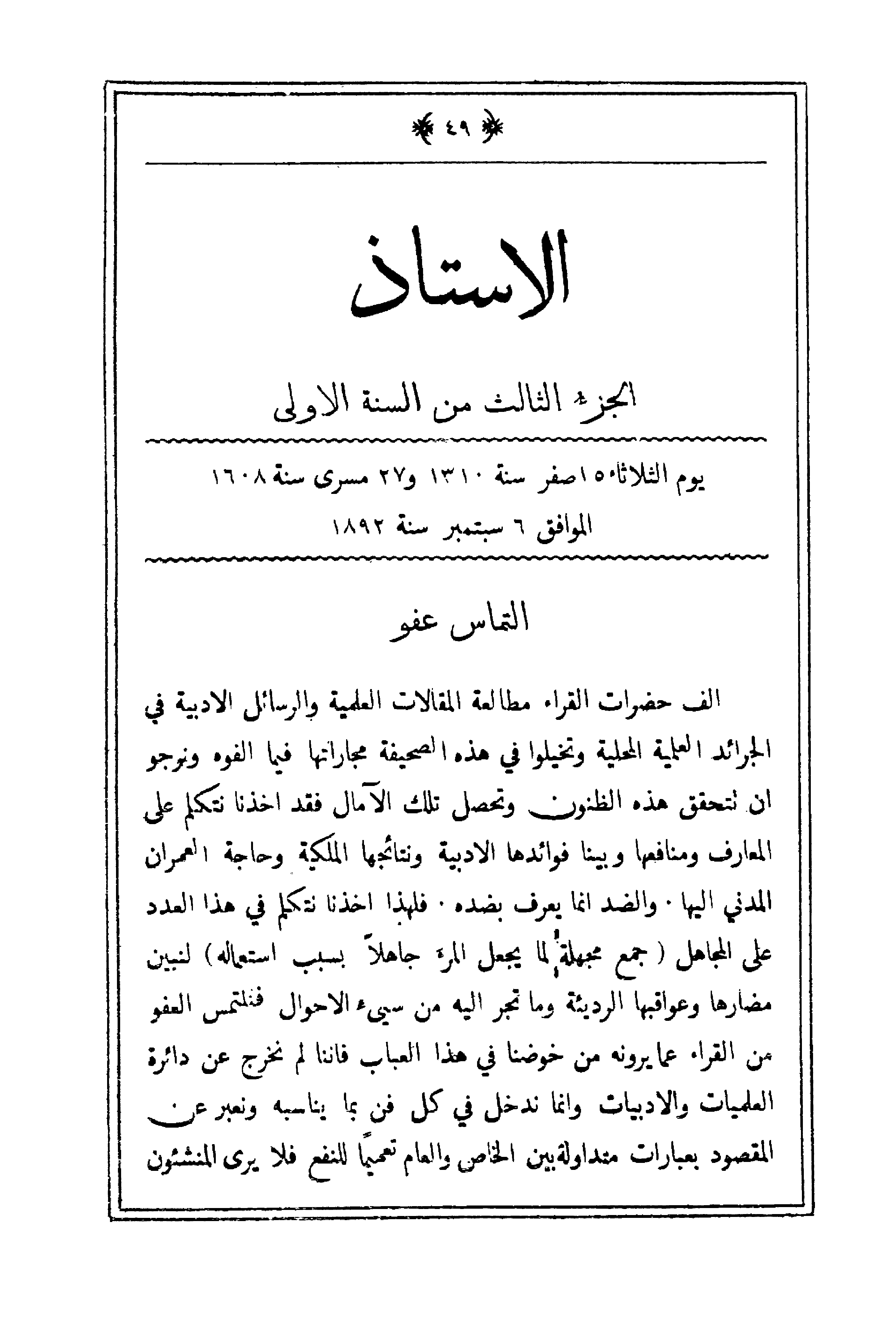 ألف حضرات القراء مطالعة المقالات العلمية والرسائل الأدبية في الجرائد العلمية المحلية وتخيلوا في هذه الصحيفة مجاراتها فيما ألفوه ونرجو أن تتحقق هذه الظنون وتحصل تلك الآمال فقد أخذنا نتكلم على المعارف ومنافعها وبينا فوائدها الأدبية ونتائجها الملكية وحاجة العمران المدني إليها. والضد إنما يعرف بضده. فلهذا أخذنا نتكلم في هذا العدد على المجاهل (جمع مجهلة لما يجعل المرءَ جاهلاً بسبب استعماله) لنبين مضارها وعواقبها الرديئة وما تجر إليه من سيء الأحوال فنلتمس العفو من القراء عما يرونه من خوضنا في هذا العباب فإننا لم نخرج عن دائرة العمليات والأدبيات وإنما ندخل في كل فن بما يناسبه ونعبر عن المقصود بعبارات متداولة بين الخاص والعام تعميماً للنفع فلا يرى المنشئون
