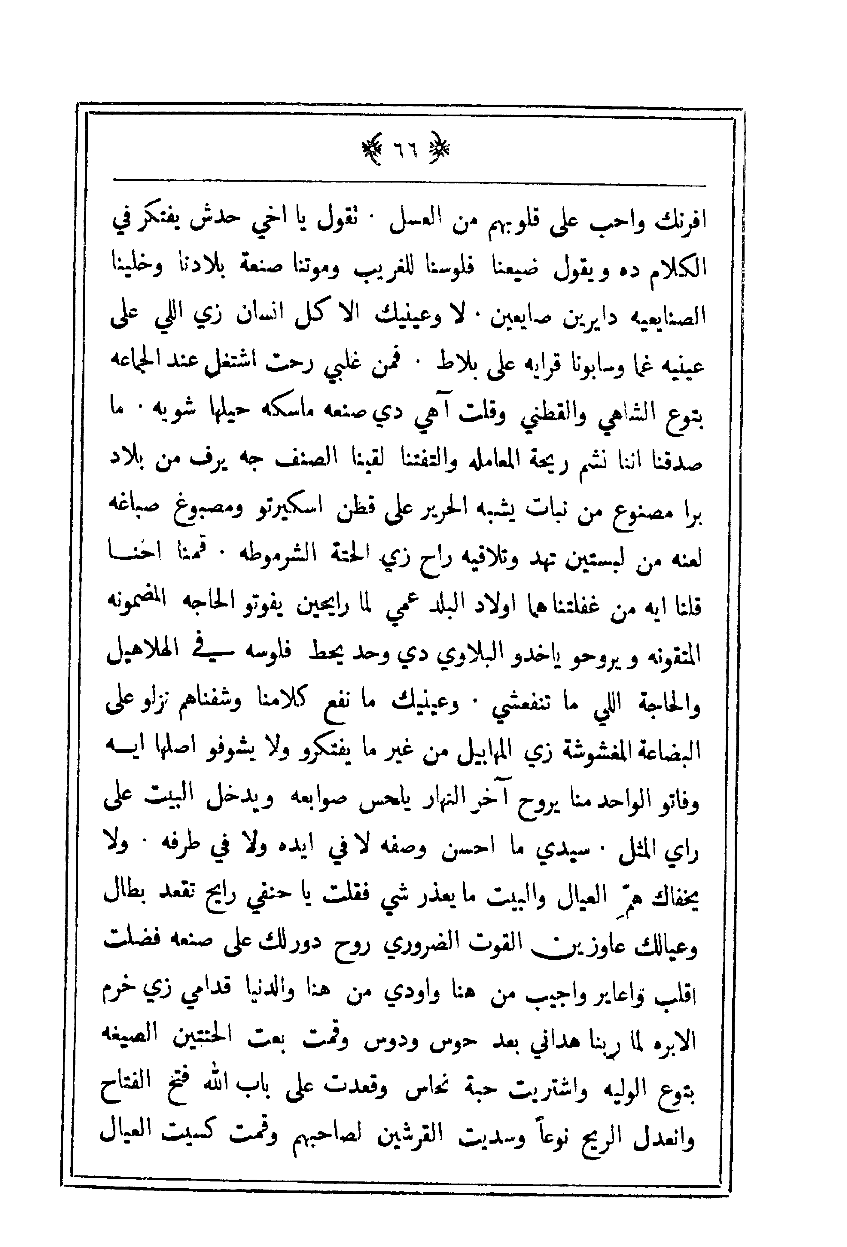 افرنك وأحب على قلوبهم من العسل. تقول يا أخي حدش يفتكر في الكلام ده ويقول ضيعنا فلوسنا للغريب وموتنا صنعة بلادنا وخلينا الصنايعيه دايرين صايعين. لا وعينيك إلا كل إنسان زي اللي على عينيه غما وسابونا قرايه على بلاط. فمن غلبي رحت أشتغل عند الجماعة بتوع الشاهي والقطني وقلت آهي دي صنعة ماسكه حيلها شويه. ما صدقنا إننا نشم ريحة المعاملة والتفتنا لقينا الصنف جه يرف من بلاد برا مصنوع من نبات يشبه الحرير على قطن اسكيرتو ومصبوغ صباغه لعنه من لبستين تهد وتلاقيه راح زي الحتة الشرموطه. قمنا إحنا قلنا إيه من غفلتنا هما أولاد البلد عمي لما رايحين يفوتو الحاجه المضمونة المتقونه ويروحو يا خدو البلاوي دي وحد يحط فلوسه في الهلاهيل والحاجة اللي ما تنفعشي. وعينيك ما نفع كلامنا وشفناهم نزلو على البضاعة المغشوشة زي المهابيل من غير ما يفتكرو ولا يشوفو أصلها إيه وفاتو الواحد منا يروح آخر النهار يلحس صوابعه ويدخل البيت على رأي المثل. سيدي ما أحسن وصفه لا في أيده ولا في طرفه. ولا يخفاك