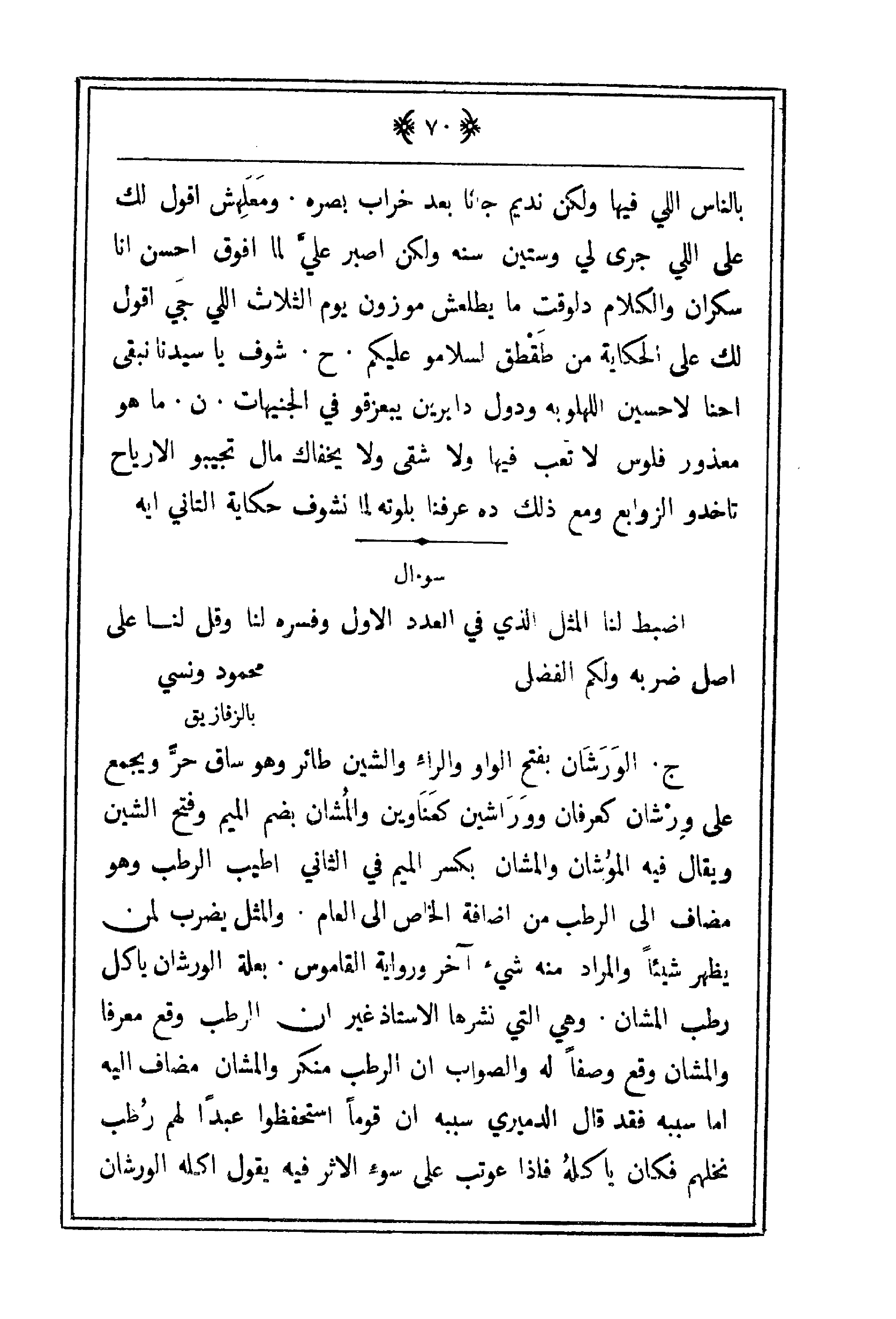 ج. الوَرَشَان بفتح الواو والراء والشين طائر وهو ساق حرّ ويجمع على وِرْشان كعرفان ووَرَاشين كعَنَاوين والمُشان بضم الميم وفتح الشين ويقال فيه المُوشان والمشان بكسر الميم في الثاني أطيب الرطب وهو مضاف إلى الرطب من إضافة الخاص إلى العام. والمثل يضرب لمن يظهر شيئاً والمراد منه شيء آخر ورواية القاموس. بعلة الورشان باكل رطب المشان. وهي التي نشرها الأستاذ غير أن الرطب وقع معرفا والمشان وقع وصفاً له والصواب أن الرطب منكر والمشان مضاف إليه أما سببه فقد قال الدميري سببه أن قوماً استحفظوا عبداً لهم رُطب نخلهم فكان يأكلهُ فإذا عوتب على سوءِ الأثر فيه يقول أكله الورشان