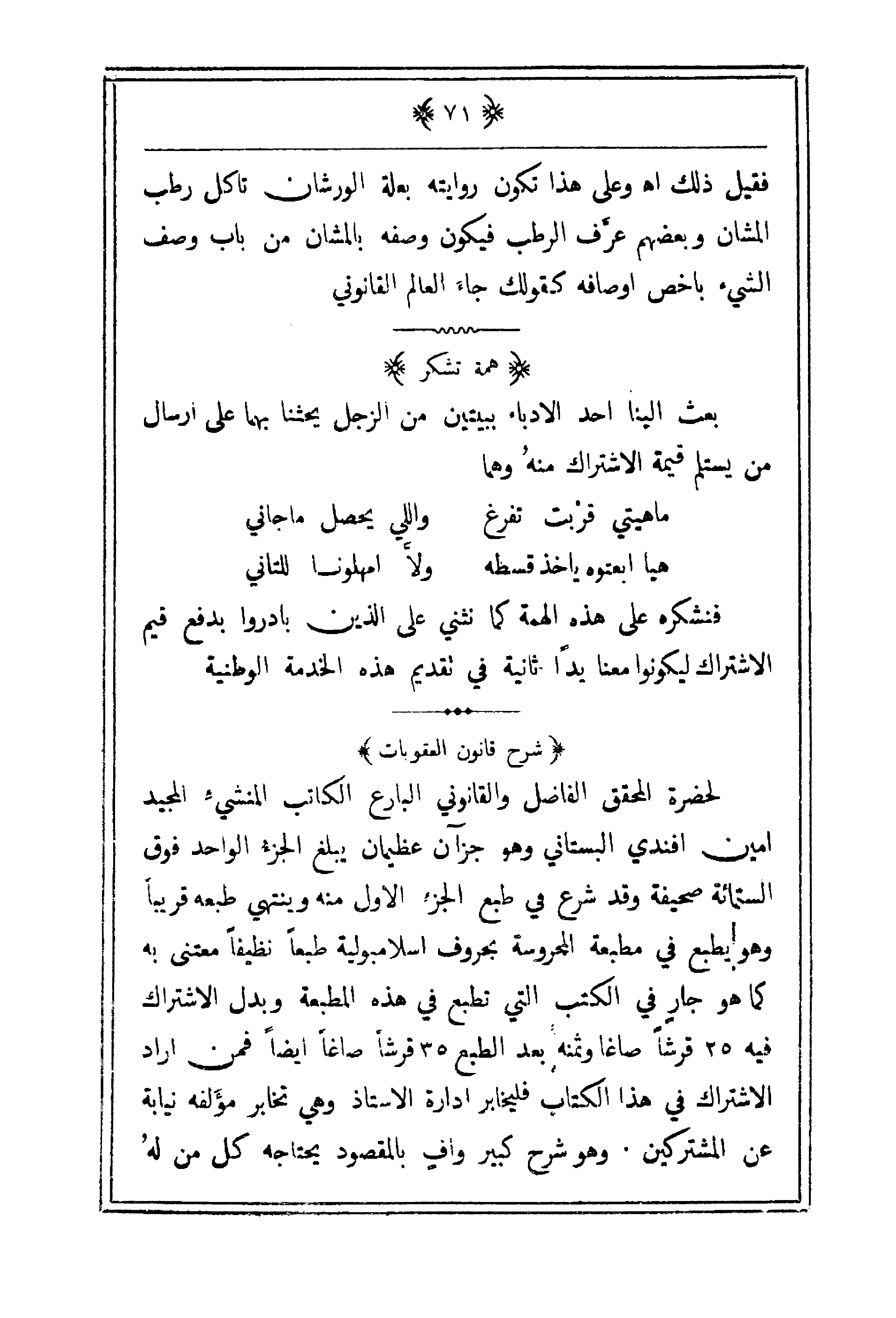لحضرة المحقق الفاضل والقانون البارع الكاتب المنشيء المجيد أمين أفندي البستاني وهو جزآن عظيمان يبلغ الجزءُ الواحد فوق الستمائة صحيفة وقد شرع في طبع الجزء الأول منه وينتهي طبعه قريباً وهو يطبع في مطبعة المحروسة بحروف اسلامبولية طبعاً نظيفاً معتنى به كما هو جارٍ في الكتب التي تطبع في هذه المطبعة وبدل الاشتراك فيه 25 قرشاً صاغاً وثمنه بعد الطبع 35 قرشاً صاغاً أيضاً فمن أراد الاشتراك في هذا الكتاب فليخابر إدارة الأستاذ وهي تخابر مؤلفه نيابة عن المشتركين. وهو شرح كبير وافٍ بالمقصود يحتاجه كل من لهُ