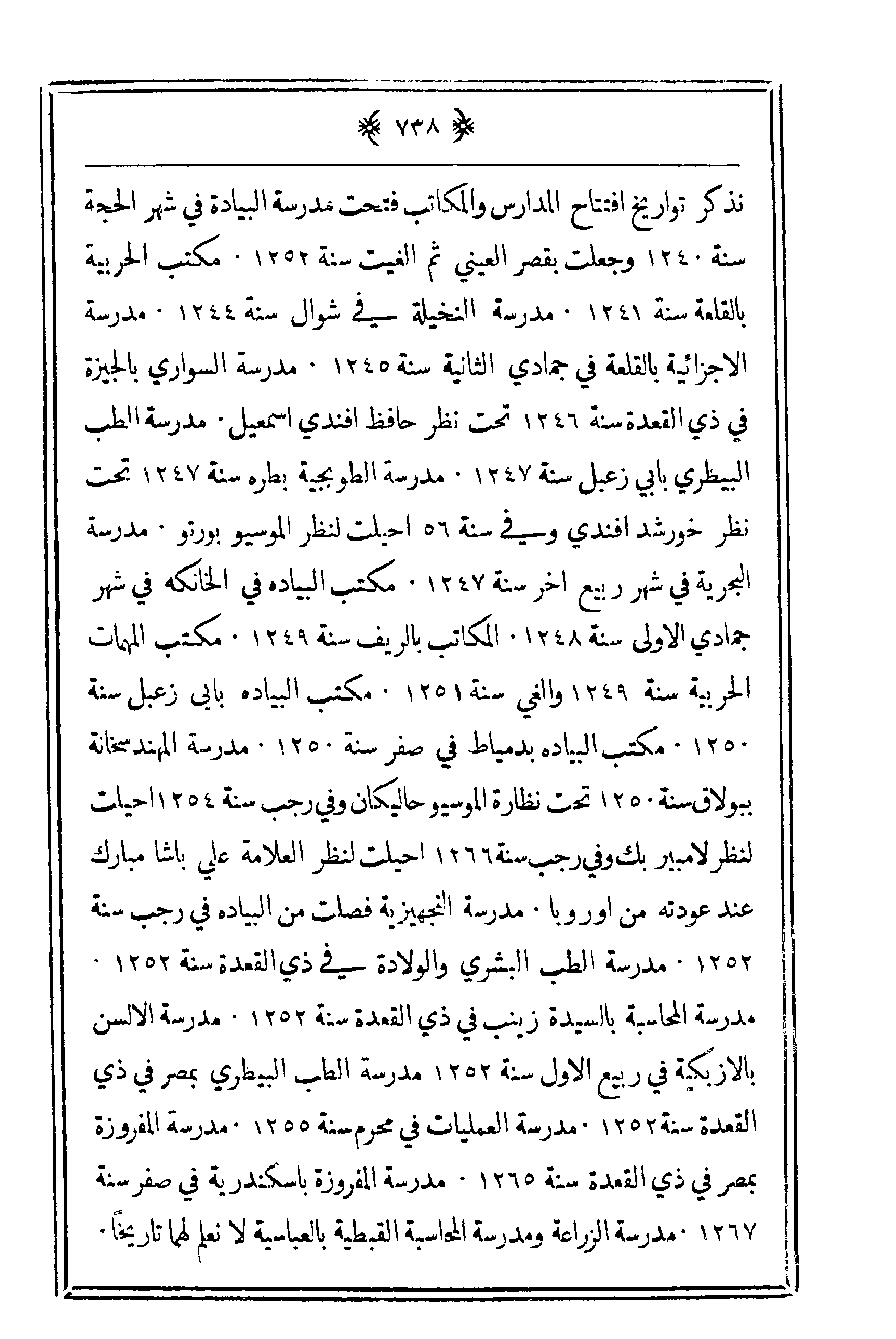 نذكر تواريخ افتتاح المدارس والمكاتب فتحت مدرسة البيادة في شهر الحجة سنة 1240 وجعلت بقصر العيني ثم ألغيت سنة 1252. مكتب الحربية بالقلعة سنة 1241. مدرسة النخيلة في شوال سنة 1244. مدرسة الاجزائية بالقلعة في جمادى الثانية سنة 1245. مدرسة السواري بالجيزة في ذي القعدة سنة 1246 تحت نظر حافظ أفندي إسماعيل. مدرسة الطب البيطري بأبي زعبل سنة 1247. مدرسة الطوبجية بطره سنة 1247 تحت نظر خورشد أفندي وفي سنة 56 أحيلت لنظر الموسيو بورتو. مدرسة البحرية في شهر ربيع آخر سنة 1247. مكتب البياده في الخانكه في شهر جمادى الأولى سنة 1248. المكاتب بالريف سنة 1249. مكتب المهمات الحربية سنة 1249 وإلغي سنة 1251. مكتب البياده بأبي زعبل سنة 1250. مكتب البياده بدمياط في صفر سنة 1250. مدرسة المهند سخانة ببولاق سنة 1250 تحت نظارة الموسيو حاليكان وفي رجب سنة 1254 أحيلت لنظر لامبير بك وفي رجب سنة 1266 أحيلت لنظر العلامة علي باشا مبارك عند عودته من أوروبا. مدرسة التجهيزية فصلت من البياده في رجب سنة 1252. مدرسة الطب البشري والولادة في ذي القعدة سنة 1252. مدرسة المحاسبة بالسيدة زينب في ذي القعدة سنة 1252. مدرسة الألسن بالأزبكية في ربيع الأول سنة 1252 مدرسة الطب البيطري بمصر في ذي القعدة سنة 1252. مدرسة العمليات في محرم سنة 1255.