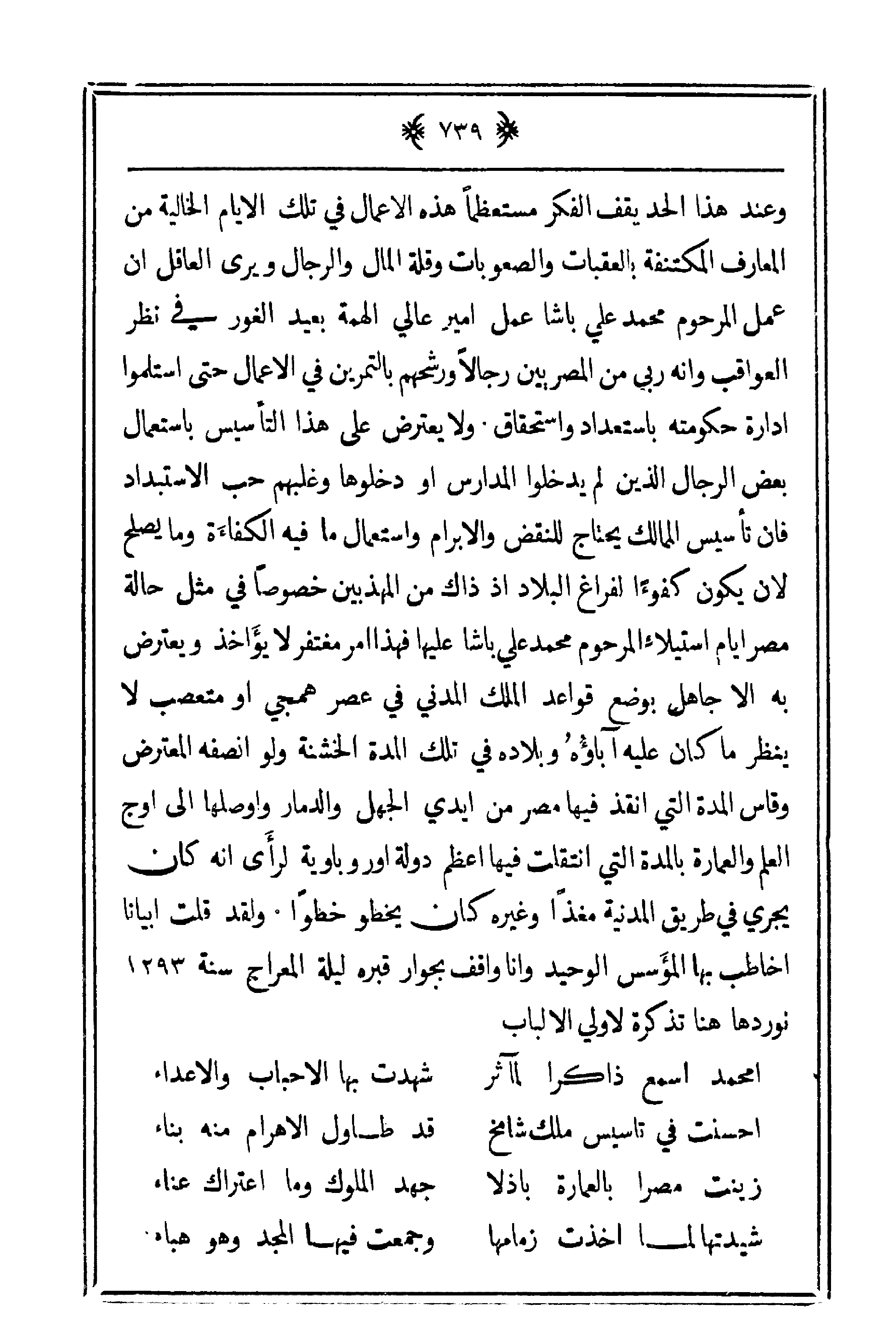 وعند هذا الحد يقف الفكر مستعظماً هذه الأعمال في تلك الأيام الخالية من المعارف المكتنفة بالعقبات والصعوبات وقلة المال والرجال ويرى العاقل أن عمل المرحوم محمد علي باشا عمل أمير عالي الهمة بعيد الغور في نظر العواقب وأنه ربي من المصريين رجالاً ورشحهم بالتمرين في الأعمال حتى استلموا إدارة حكومته باستعداد واستحقاق. ولا يعترض على هذا التأسيس باستعمال بعض الرجال الذين لم يدخلوا المدارس أو دخلوها وغلبهم حب الاستبداد فإن تأسيس الممالك يحتاج للنقض والإبرام واستعمال ما فيه الكفاءة وما يصلح لان يكون كفوءاً لفراغ البلاد إذ ذاك من المهذبين خصوصاً في مثل حالة مصر أيام استيلاء المرحوم محمد علي باشا عليها فهذا أمر مغتفر لا يؤاخذ ويعترض به إلا جاهل بوضع قواعد الملك المدني في عصر همجي أو متعصب لا ينظر ما كان عليه آباؤُه وبلاده في تلك المدة الخشنة ولو أنصفه المعترض وقاس المدة التي أنقذ فيها مصر من أيدي الجهل والدمار وأوصلها إلى أوج العلم والعمارة بالمدة التي انتقلت فيها أعظم دولة أوروبية لرأي أنه كان يجري في طريق المدنية مغذاً وغيره كان يخطو خطواً. ولقد قلت أبياتاً أخاطب بها المؤسس الوحيد وأنا واقف بجوار قبره ليلة المعراج سنة 1293 نوردها هنا تذكرة لأولي الألباب