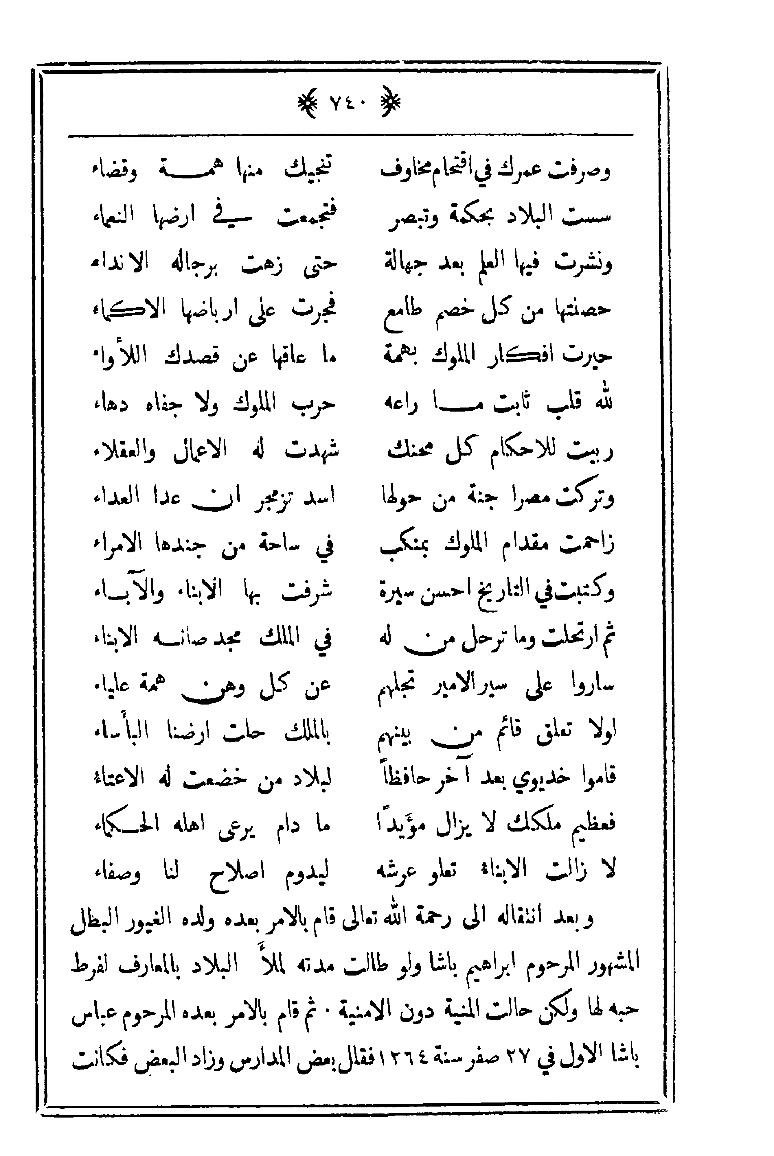 وبعد انتقاله إلى رحمة الله تعالى قام بالأمر بعده ولده الغيور البطل المشهور المرحوم إبراهيم باشا ولو طالت مدته لملأ البلاد بالمعارف لفرط حبه لها ولكن حالت المنية دون الأمنية. ثم قام بالأمر بعده المرحوم عباس باشا الأول في 27 صفر سنة 1264 فقلل بعض المدارس وزاد البعض فكانت