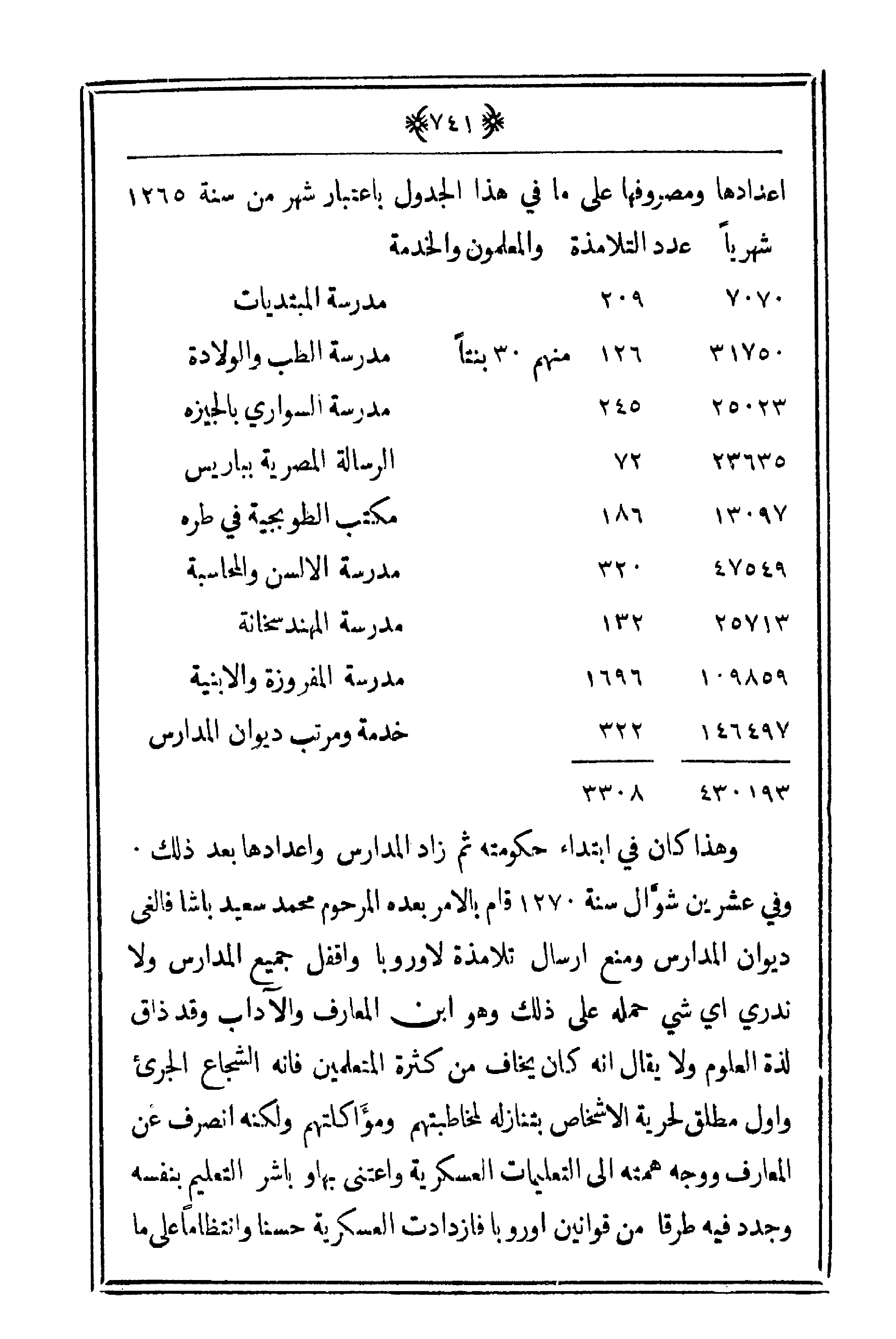 أعدادها ومصروفها على ما في هذا الجدول باعتبار شهر من سنة 1265 شهرياً عدد التلامذة والمعلمون والخدمة